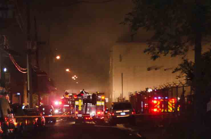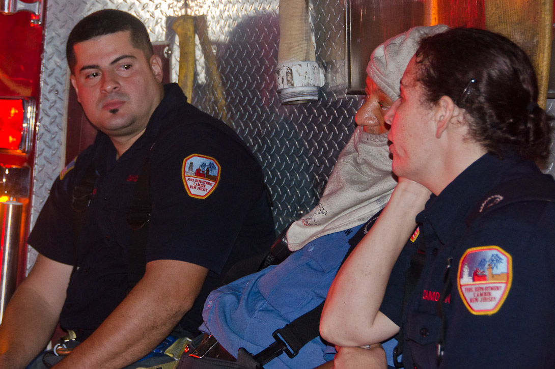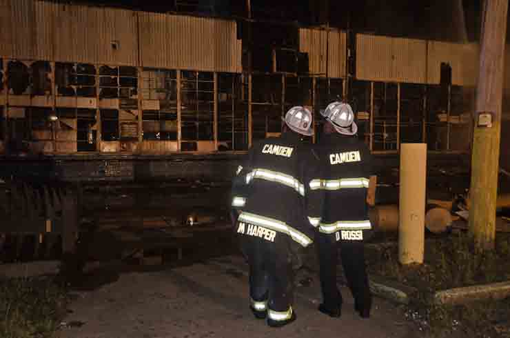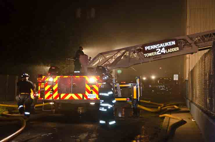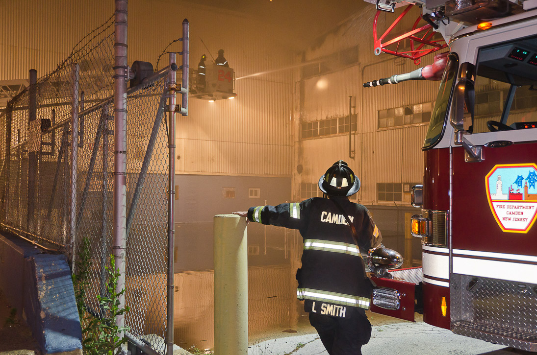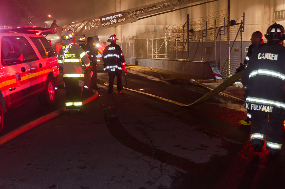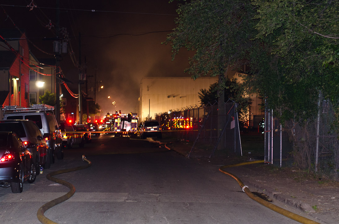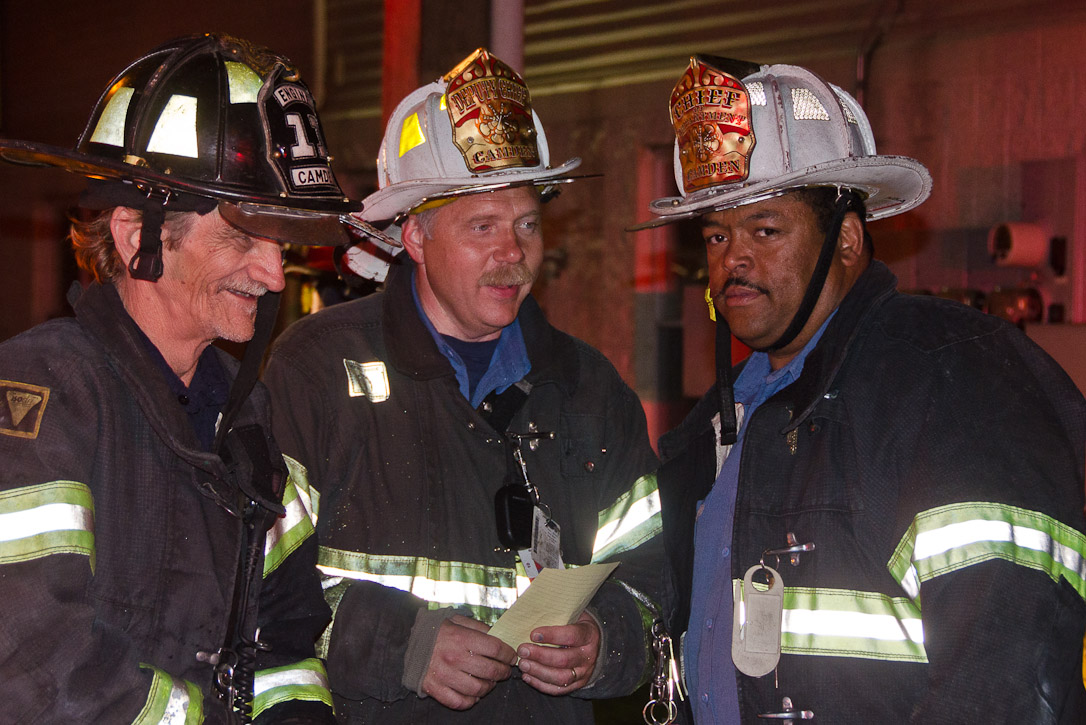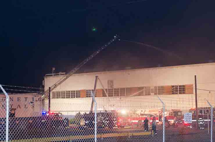 Magnetic Metals Corporation has been in operation on Hayes Avenue in the Cramer Hill section of Camden since 1942, manufacturing high grade nickel alloy laminations. The biggest fire to date in 2012, a building that was in the process of being emptied out caught fire around 11:00 PM on June 18, 2012. The fire went to six alarms before being brought under control. I arrived on scene at about the 13 minute mark, took my first shot at 11:07 AM, and was still there well over five hours later, taking my last shot at 4:45 AM. When I returned a few hours later, Engine 11 was still operating, wetting down hot spots. This is the third of four pages of photos of this fire. Links to continue to the next page, return to the first page, or skip ahead are at the bottom of this page. The photos are for the most part presented in the order in which they were taken… I was using two cameras, some photos taken in the same minute on each camera may be sequenced wrong, but that's small stuff! As with the web page covering other Camden Fire Department events, if you can identify anyone that I've missed, please comment at the bottom of the page. (I'm terrible at at names and faces). June 26, 2012 |