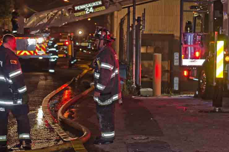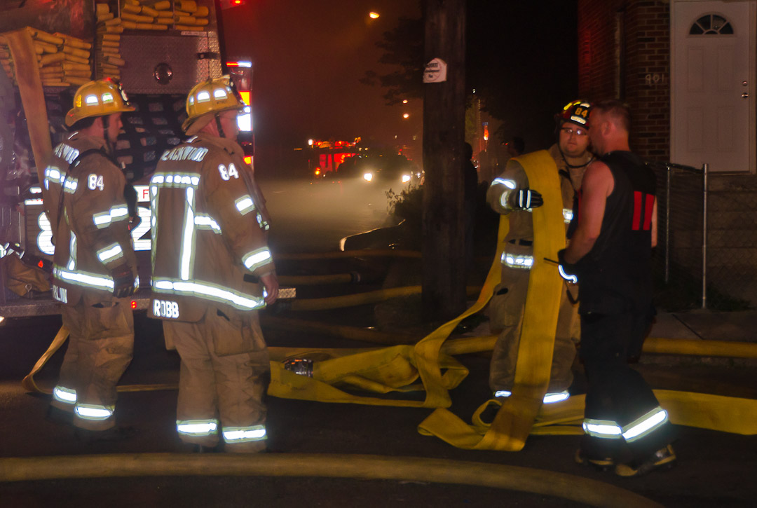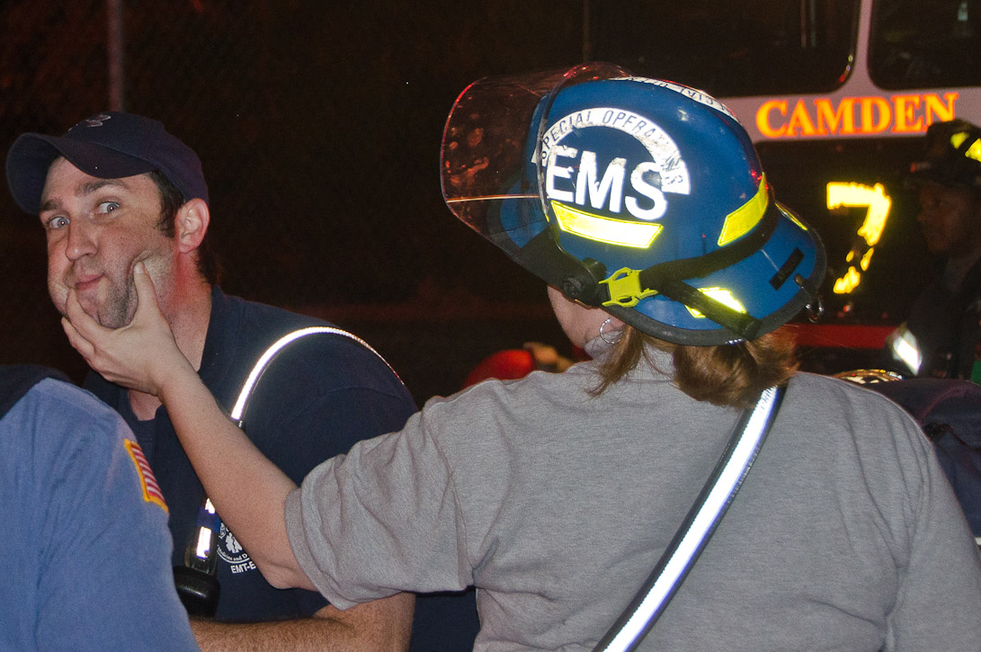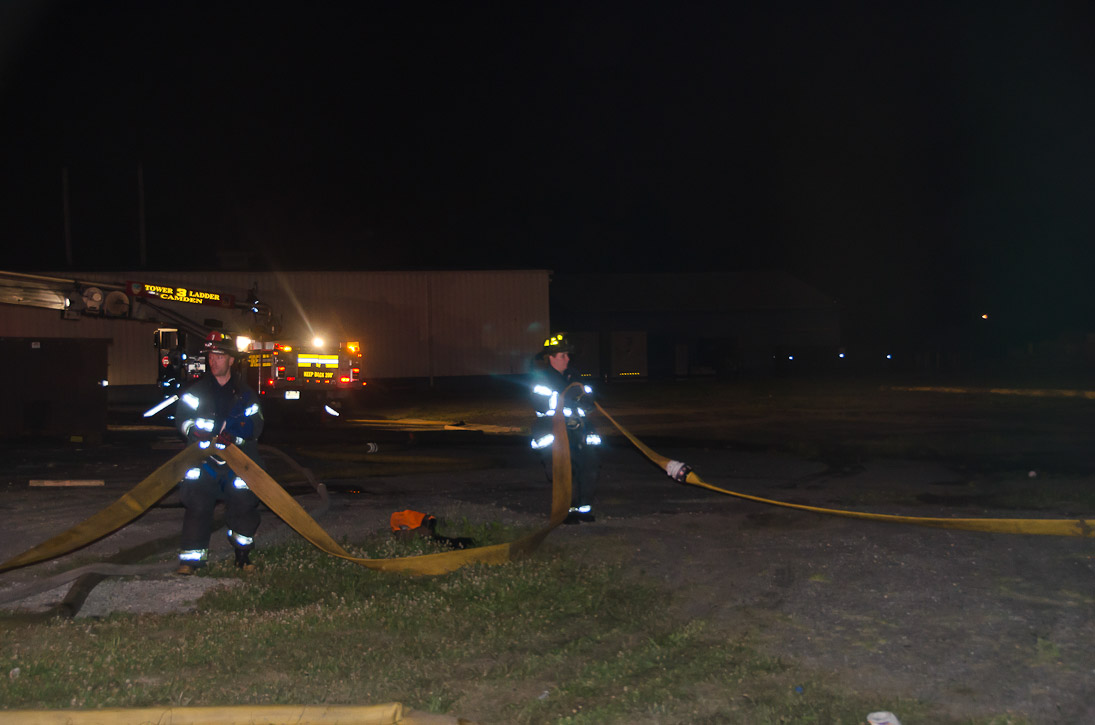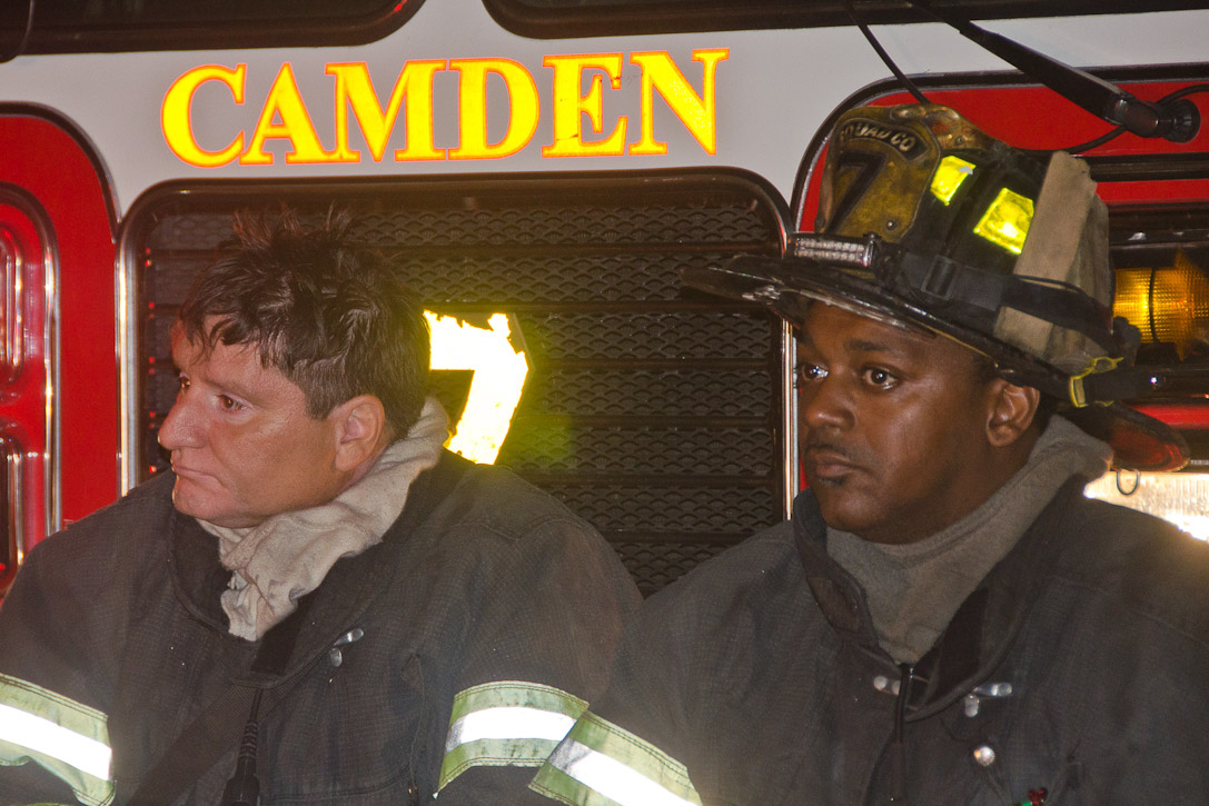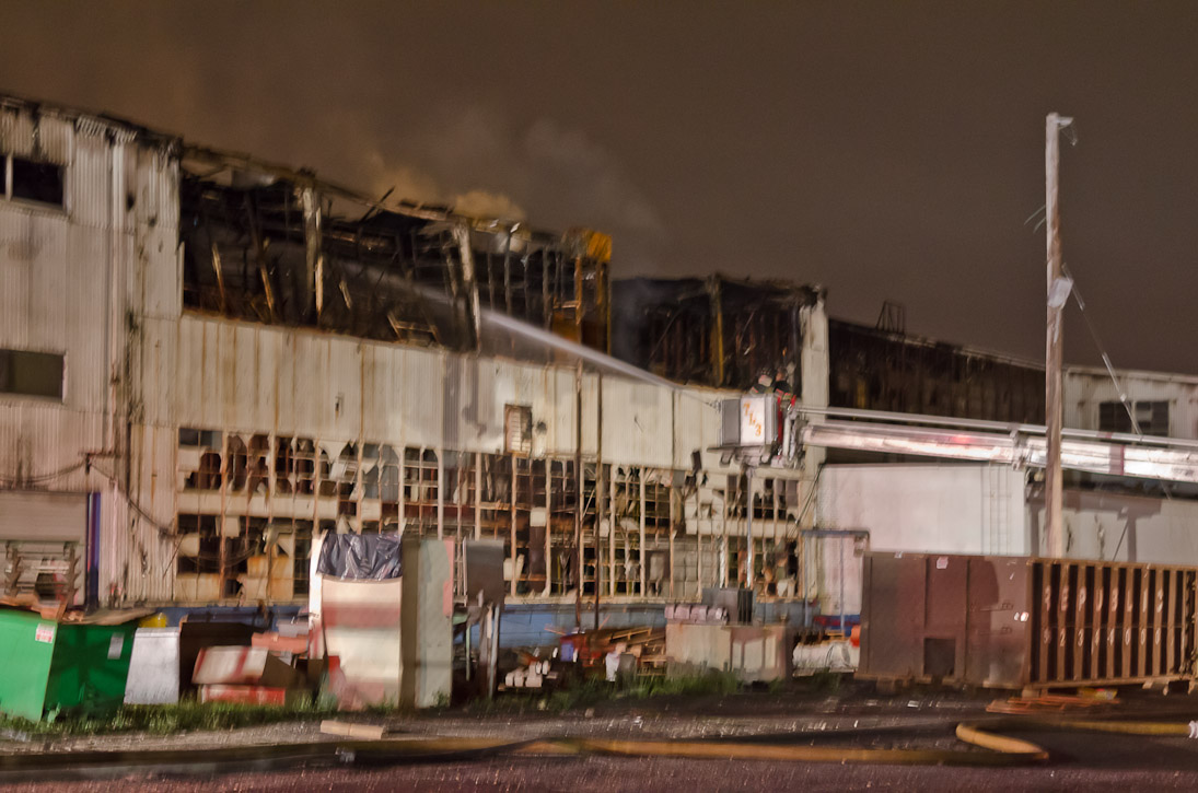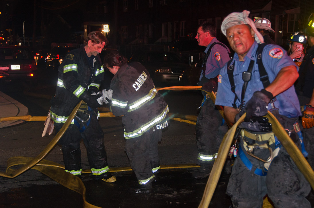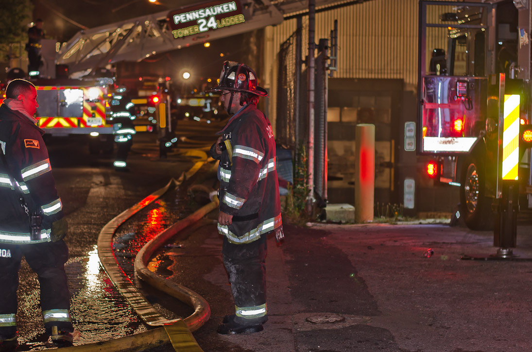 Magnetic Metals Corporation has been in operation on Hayes Avenue in the Cramer Hill section of Camden since 1942, manufacturing high grade nickel alloy laminations. The biggest fire to date in 2012, a building that was in the process of being emptied out caught fire around 11:00 PM on June 18, 2012. The fire went to six alarms before being brought under control. I arrived on scene at about the 13 minute mark, took my first shot at 11:07 AM, and was still there well over five hours later, taking my last shot at 4:45 AM. When I returned a few hours later, Engine 11 was still operating, wetting down hot spots. This is the third of four pages of photos of this fire. Links to continue to the next page, return to the first page, or skip ahead are at the bottom of this page. The photos are for the most part presented in the order in which they were taken… I was using two cameras, some photos taken in the same minute on each camera may be sequenced wrong, but that's small stuff! As with the web page covering other Camden Fire Department events, if you can identify anyone that I've missed, please comment at the bottom of the page. (I'm terrible at at names and faces). June 26, 2012 |
