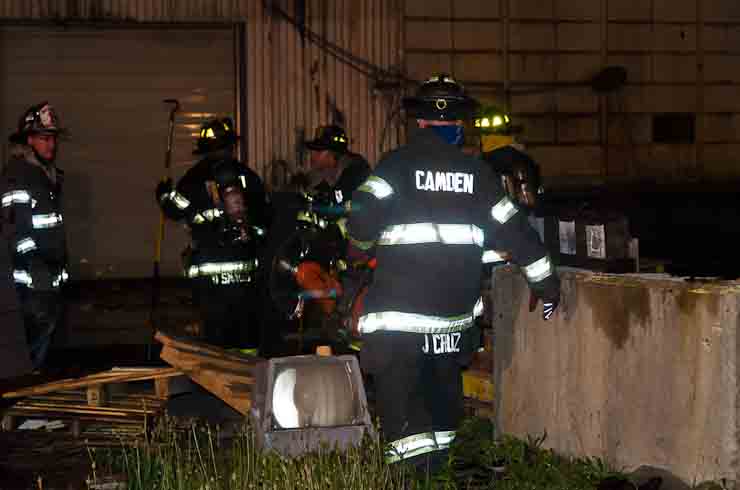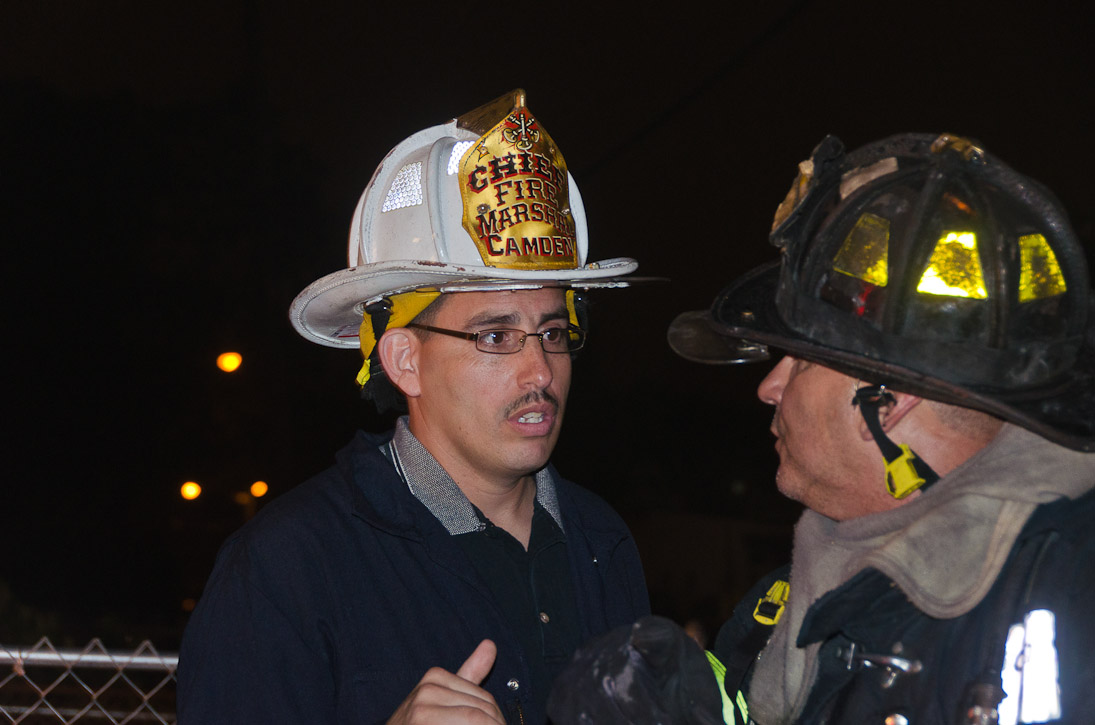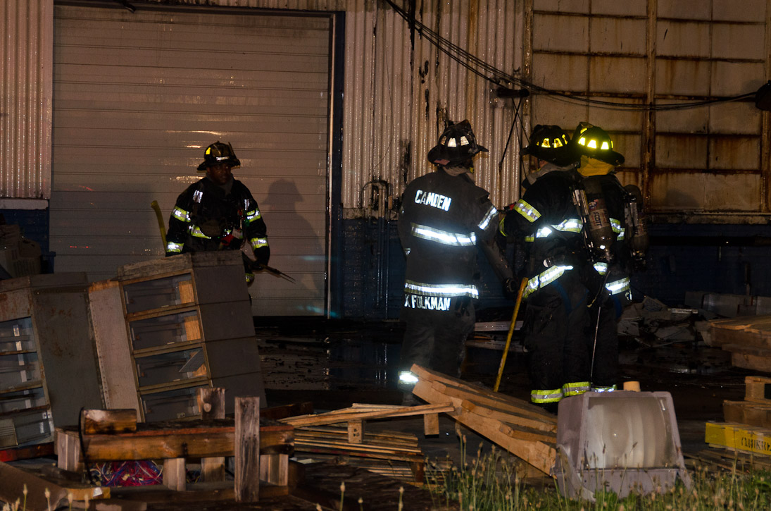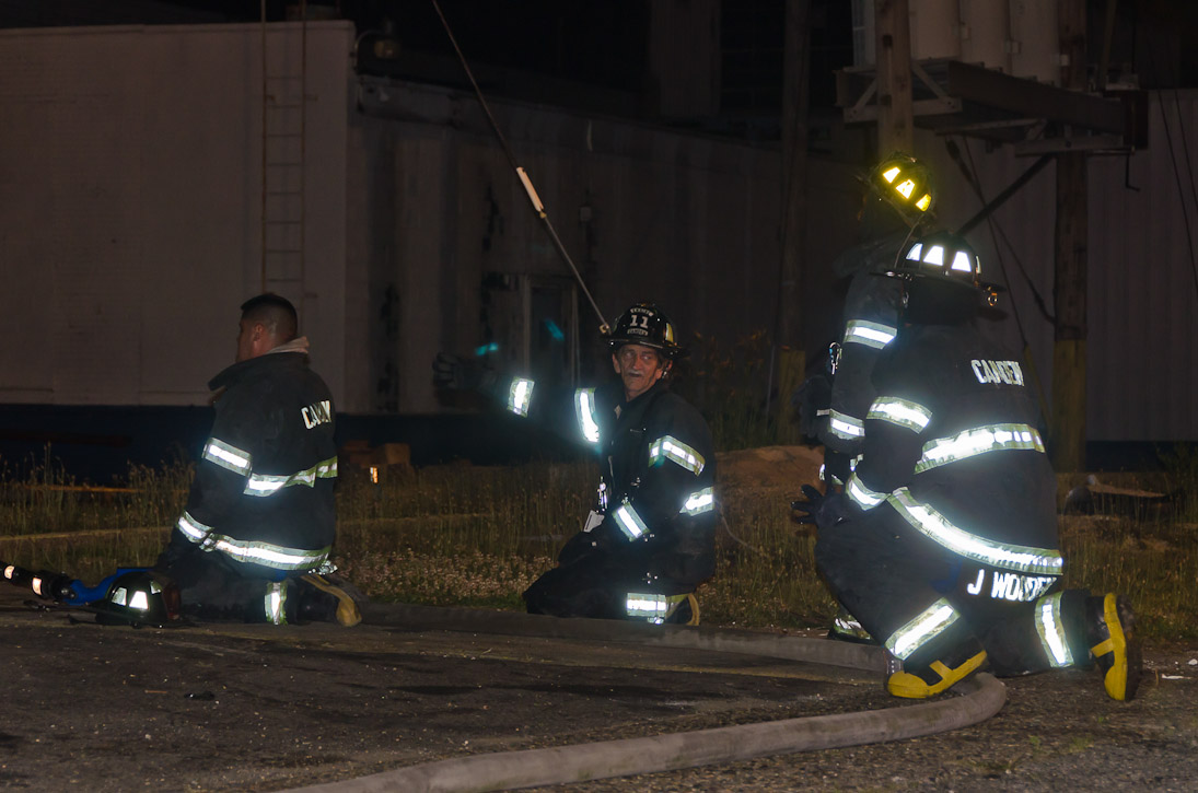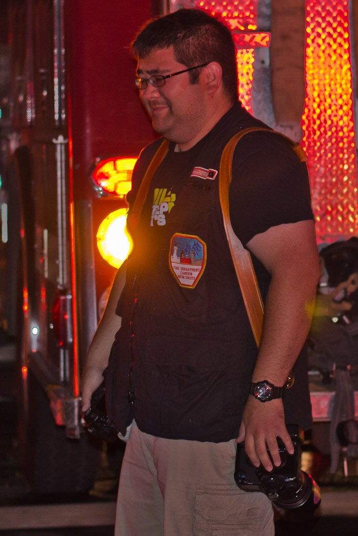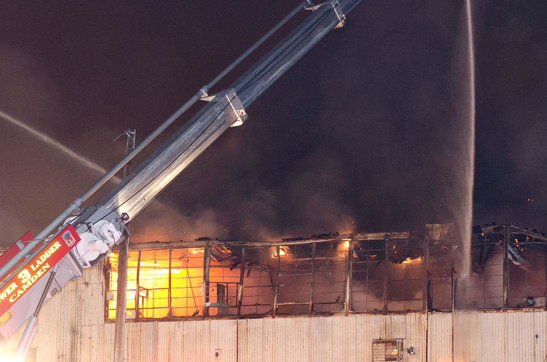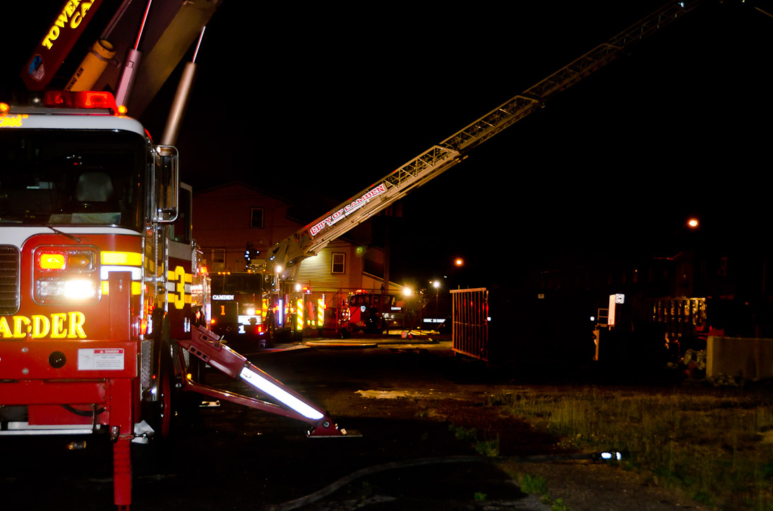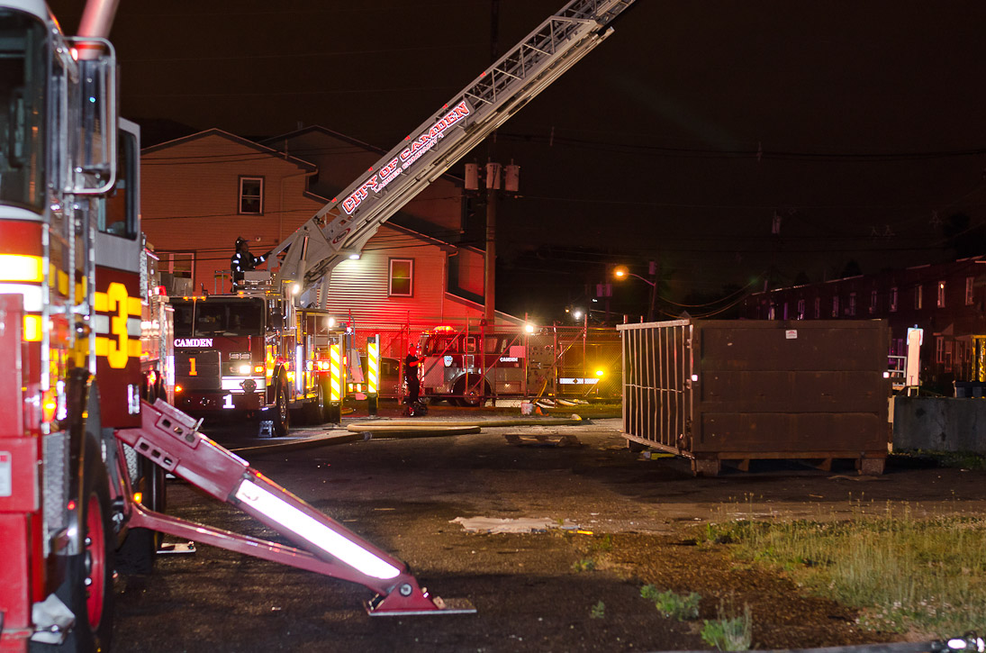 This page and the other pages in this series are the successors to the series of web-page about the Camden Fire Department that began with the page Camden Fire Department: The Fires of the Summer of 2011. On this and other pages in the series you will find pictures and information regarding different events and aspects of the fire service in Camden, New Jersey. Magnetic Metals Corporation has been in operation on Hayes Avenue in the Cramer Hill section of Camden since 1942, manufacturing high grade nickel alloy laminations. The biggest fire to date in 2012, a building that was in the process of being emptied out caught fire around 11:00 PM on June 18, 2012. The fire went to six alarms before being brought under control. Ted Aurig of www.NewJerseyFireground.com wrote the following account of the blaze: On June 19th, 2012 shortly before 11 p.m. Camden County Communications started to receive a couple calls of a warehouse on fire at 21st. and Hayes Ave’s. A Full box was dispatched to 1900 Hayes Ave at Magnetic Metals for a building fire in the Cramer Hill section of the city. Camden County Radio advised responding units they were receiving calls for flames through the windows of the building. Companies arrived and reported fire through the roof of a commercial building. Battalion 2 struck the 2nd Alarm. A 3rd Alarm was transmitted several minutes later. At the 20 minute mark, Command reported companies were operating in defensive operations as the Command staff was paring up Engine companies with the Ladder Companies for Ladder Pipe operations with heavy fire through the roof. Three additional Engine companies were special called to the scene. A 4th Alarm was transmitted. Car 3 reported fire running the roofline of a 350x400 warehouse. On the 5th Alarm a 5” strike team was dispatched. At the 90 minute mark Command reported the fire to still be doubtful. Fire conditions were present under the roof. Two additional Engines were special called to supply an additional Tower Ladder. The Truck Companies set up on all sides of the building in defensive operation. Companies remained operating. A 6th Alarm was transmitted. At the 3 hour mark companies were making good progress.The fire was officially placed under control at 2:49 A.M. No injuries were reported on the fire ground. The Camden City, Camden County and State Fire Marshals were on scene investigating the fire. According to press reports approx. 100 residents were evacuated from the area due to heavy smoke. This was the 2nd working warehouse fire in the City of Camden within 24 hours. The first fire was reported around 5 p.m. for a vacant warehouse. That fire was held to an All Hands Box. I arrived on scene at about the 13 minute mark, took my first shot at 11:07 AM, and was still there well over five hours later, taking my last shot at 4:45 AM. When I returned a few hours later, Engine 11 was still operating, wetting down hot spots. This is the first of four pages of photos of this fire. Links to continue to the next page or skip ahead are at the bottom of this page. The photos are for the most part presented in the order in which they were taken… I was using two cameras, some photos taken in the same minute on each camera may be sequenced wrong, but that's small stuff! As with the web page covering other Camden Fire Department events, if you can identify anyone that I've missed, please comment at the bottom of the page. (I'm terrible at at names and faces). June 26, 2012 |