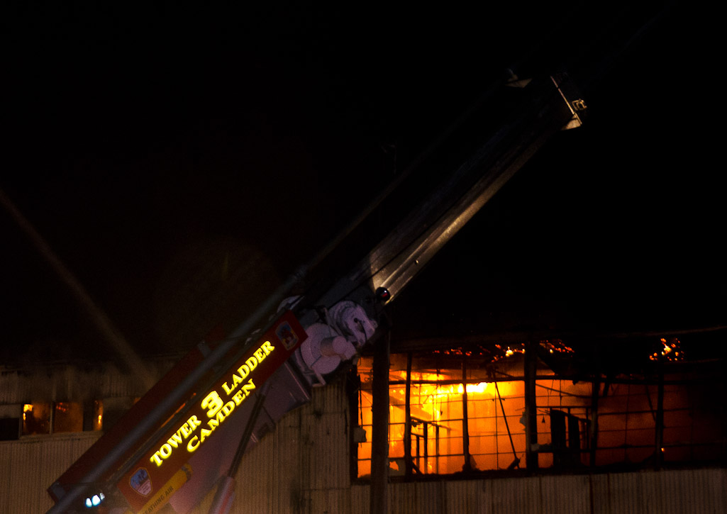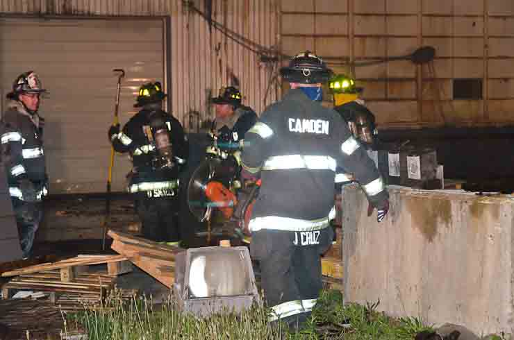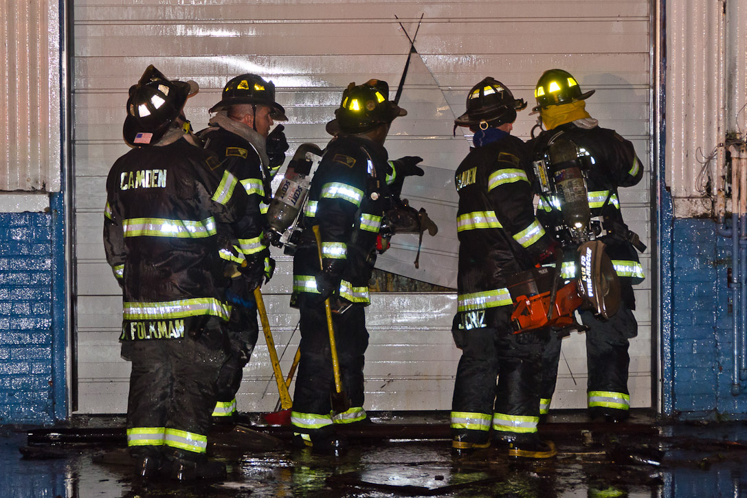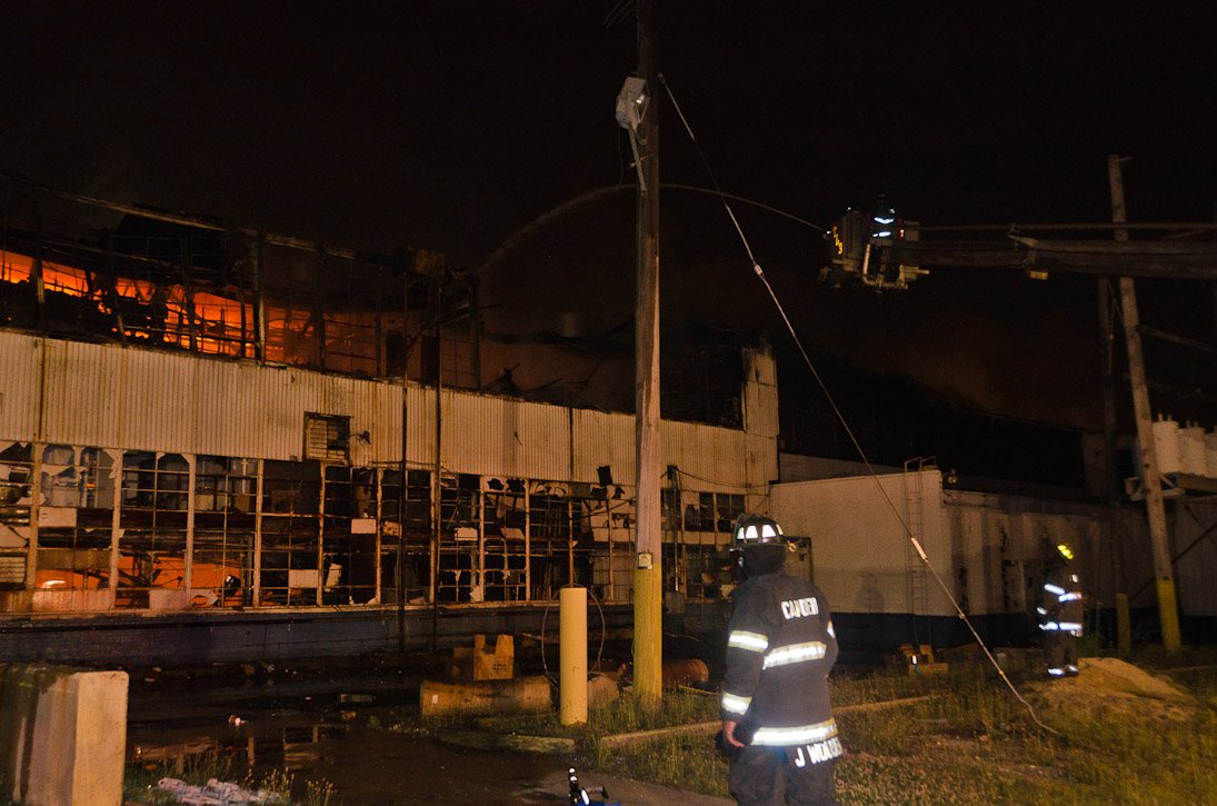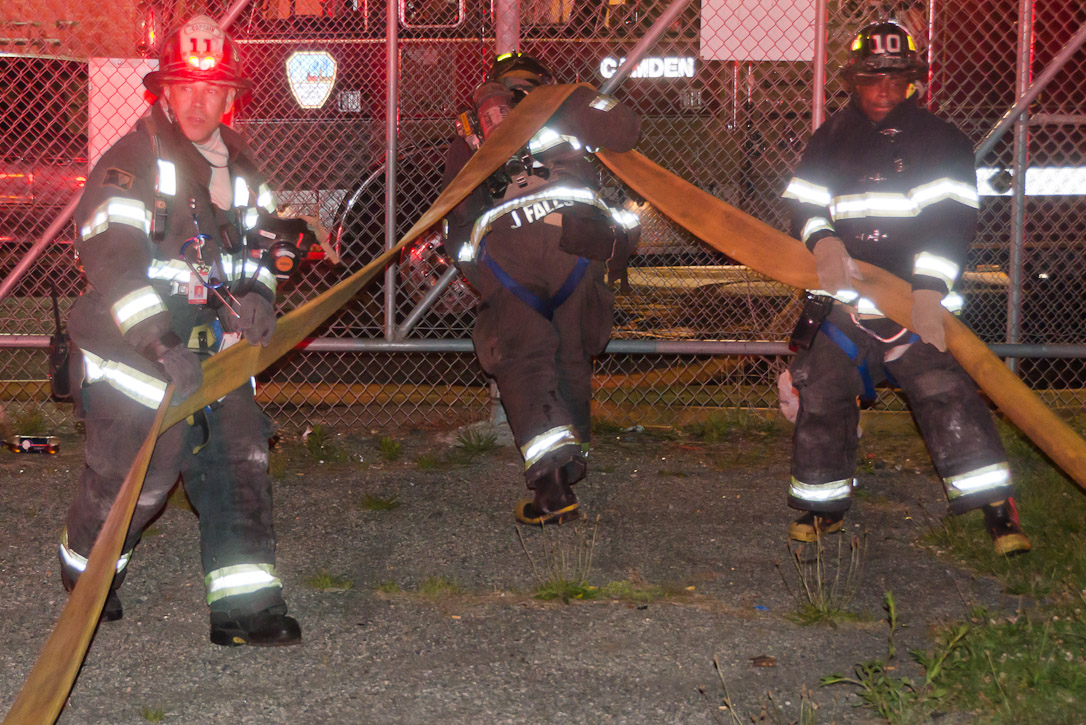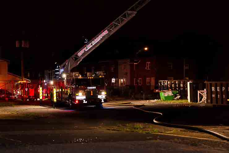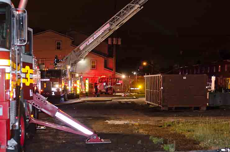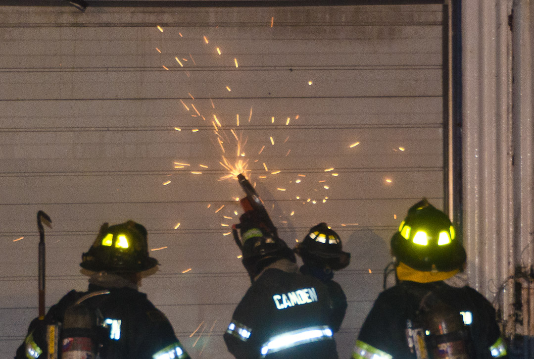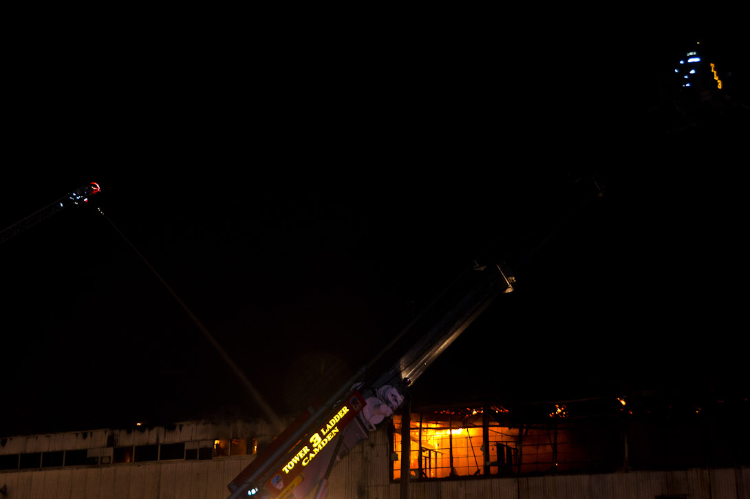 This page and the other pages in this series are the successors to the series of web-page about the Camden Fire Department that began with the page Camden Fire Department: The Fires of the Summer of 2011. On this and other pages in the series you will find pictures and information regarding different events and aspects of the fire service in Camden, New Jersey. Magnetic Metals Corporation has been in operation on Hayes Avenue in the Cramer Hill section of Camden since 1942, manufacturing high grade nickel alloy laminations. The biggest fire to date in 2012, a building that was in the process of being emptied out caught fire around 11:00 PM on June 18, 2012. The fire went to six alarms before being brought under control. Ted Aurig of www.NewJerseyFireground.com wrote the following account of the blaze: On June 19th, 2012 shortly before 11 p.m. Camden County Communications started to receive a couple calls of a warehouse on fire at 21st. and Hayes Ave’s. A Full box was dispatched to 1900 Hayes Ave at Magnetic Metals for a building fire in the Cramer Hill section of the city. Camden County Radio advised responding units they were receiving calls for flames through the windows of the building. Companies arrived and reported fire through the roof of a commercial building. Battalion 2 struck the 2nd Alarm. A 3rd Alarm was transmitted several minutes later. At the 20 minute mark, Command reported companies were operating in defensive operations as the Command staff was paring up Engine companies with the Ladder Companies for Ladder Pipe operations with heavy fire through the roof. Three additional Engine companies were special called to the scene. A 4th Alarm was transmitted. Car 3 reported fire running the roofline of a 350x400 warehouse. On the 5th Alarm a 5” strike team was dispatched. At the 90 minute mark Command reported the fire to still be doubtful. Fire conditions were present under the roof. Two additional Engines were special called to supply an additional Tower Ladder. The Truck Companies set up on all sides of the building in defensive operation. Companies remained operating. A 6th Alarm was transmitted. At the 3 hour mark companies were making good progress.The fire was officially placed under control at 2:49 A.M. No injuries were reported on the fire ground. The Camden City, Camden County and State Fire Marshals were on scene investigating the fire. According to press reports approx. 100 residents were evacuated from the area due to heavy smoke. This was the 2nd working warehouse fire in the City of Camden within 24 hours. The first fire was reported around 5 p.m. for a vacant warehouse. That fire was held to an All Hands Box. I arrived on scene at about the 13 minute mark, took my first shot at 11:07 AM, and was still there well over five hours later, taking my last shot at 4:45 AM. When I returned a few hours later, Engine 11 was still operating, wetting down hot spots. This is the first of four pages of photos of this fire. Links to continue to the next page or skip ahead are at the bottom of this page. The photos are for the most part presented in the order in which they were taken… I was using two cameras, some photos taken in the same minute on each camera may be sequenced wrong, but that's small stuff! As with the web page covering other Camden Fire Department events, if you can identify anyone that I've missed, please comment at the bottom of the page. (I'm terrible at at names and faces). June 26, 2012 |
