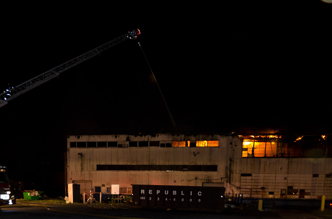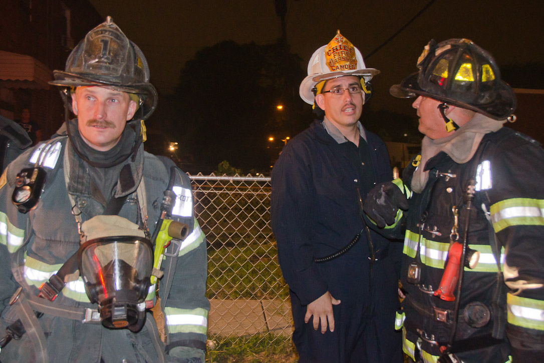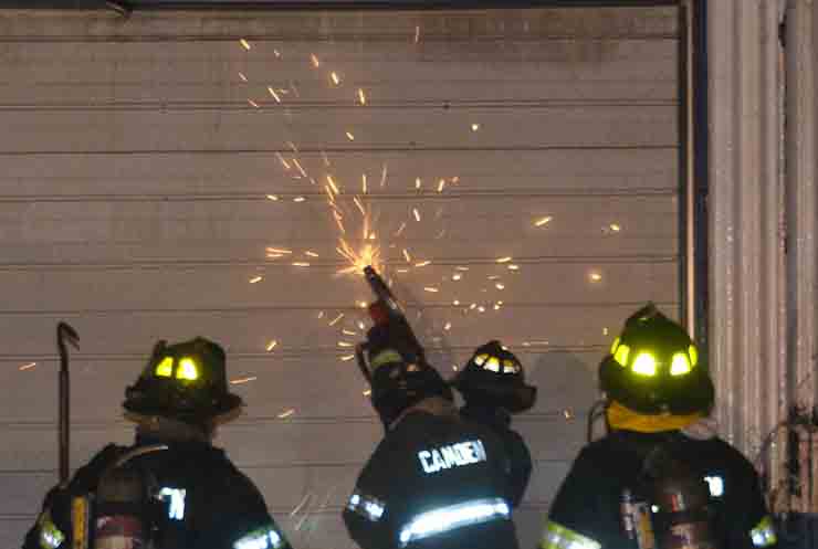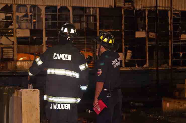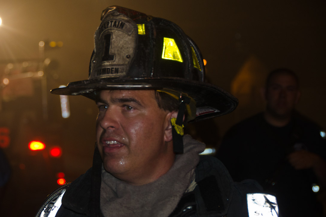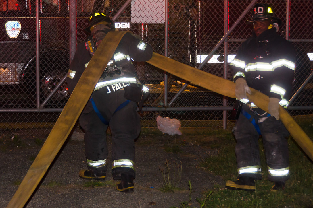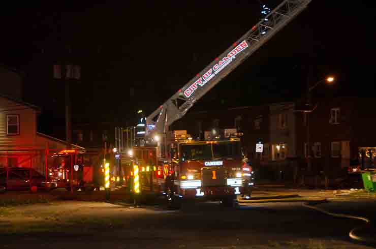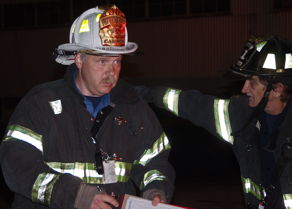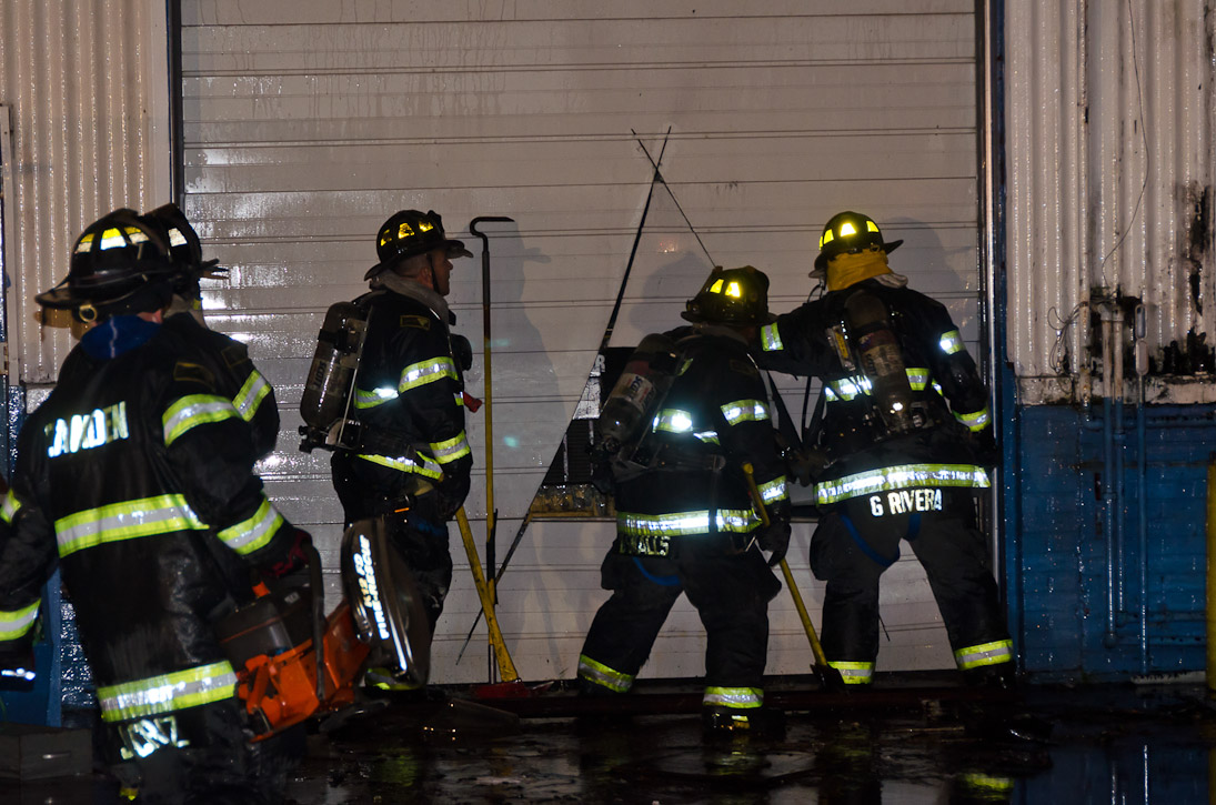This page and the other pages in this series are the successors to the series of web-page about the Camden Fire Department that began with the page Camden Fire Department: The Fires of the Summer of 2011. On this and other pages in the series you will find pictures and information regarding different events and aspects of the fire service in Camden, New Jersey. Magnetic Metals Corporation has been in operation on Hayes Avenue in the Cramer Hill section of Camden since 1942, manufacturing high grade nickel alloy laminations. The biggest fire to date in 2012, a building that was in the process of being emptied out caught fire around 11:00 PM on June 18, 2012. The fire went to six alarms before being brought under control. Ted Aurig of www.NewJerseyFireground.com wrote the following account of the blaze: On June 19th, 2012 shortly before 11 p.m. Camden County Communications started to receive a couple calls of a warehouse on fire at 21st. and Hayes Ave’s. A Full box was dispatched to 1900 Hayes Ave at Magnetic Metals for a building fire in the Cramer Hill section of the city. Camden County Radio advised responding units they were receiving calls for flames through the windows of the building. Companies arrived and reported fire through the roof of a commercial building. Battalion 2 struck the 2nd Alarm. A 3rd Alarm was transmitted several minutes later. At the 20 minute mark, Command reported companies were operating in defensive operations as the Command staff was paring up Engine companies with the Ladder Companies for Ladder Pipe operations with heavy fire through the roof. Three additional Engine companies were special called to the scene. A 4th Alarm was transmitted. Car 3 reported fire running the roofline of a 350x400 warehouse. On the 5th Alarm a 5” strike team was dispatched. At the 90 minute mark Command reported the fire to still be doubtful. Fire conditions were present under the roof. Two additional Engines were special called to supply an additional Tower Ladder. The Truck Companies set up on all sides of the building in defensive operation. Companies remained operating. A 6th Alarm was transmitted. At the 3 hour mark companies were making good progress.The fire was officially placed under control at 2:49 A.M. No injuries were reported on the fire ground. The Camden City, Camden County and State Fire Marshals were on scene investigating the fire. According to press reports approx. 100 residents were evacuated from the area due to heavy smoke. This was the 2nd working warehouse fire in the City of Camden within 24 hours. The first fire was reported around 5 p.m. for a vacant warehouse. That fire was held to an All Hands Box. I arrived on scene at about the 13 minute mark, took my first shot at 11:07 AM, and was still there well over five hours later, taking my last shot at 4:45 AM. When I returned a few hours later, Engine 11 was still operating, wetting down hot spots. This is the first of four pages of photos of this fire. Links to continue to the next page or skip ahead are at the bottom of this page. The photos are for the most part presented in the order in which they were taken… I was using two cameras, some photos taken in the same minute on each camera may be sequenced wrong, but that's small stuff! As with the web page covering other Camden Fire Department events, if you can identify anyone that I've missed, please comment at the bottom of the page. (I'm terrible at at names and faces). June 26, 2012 |
