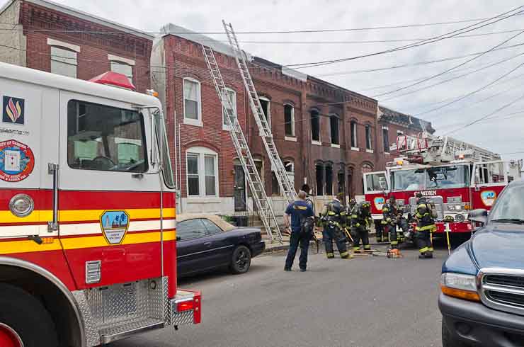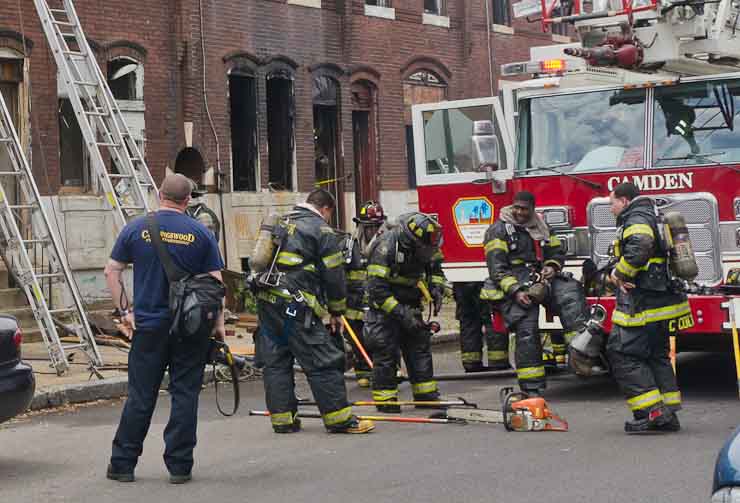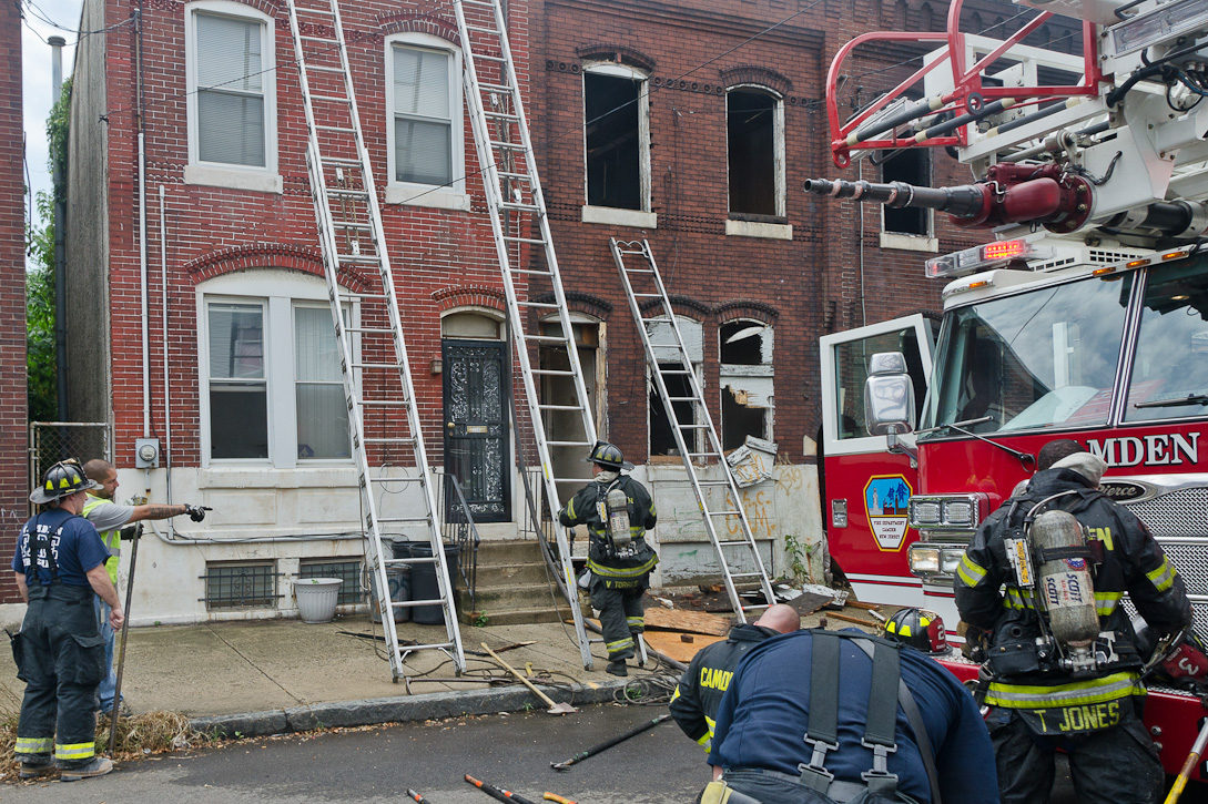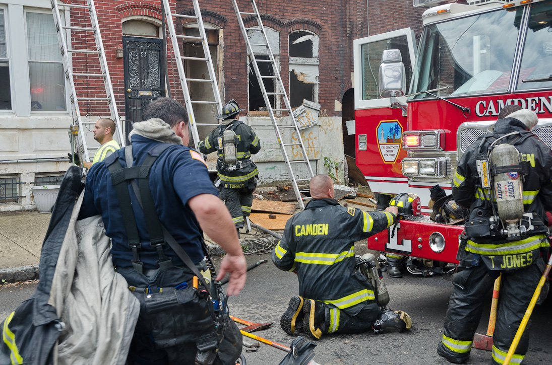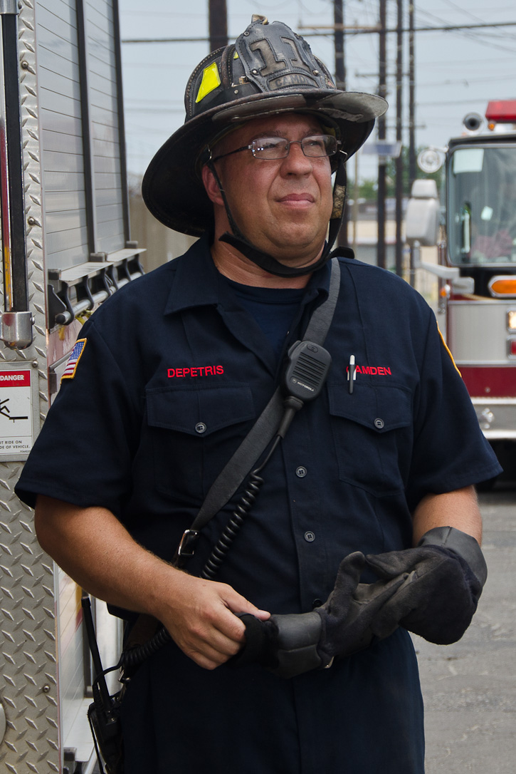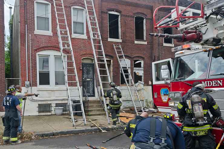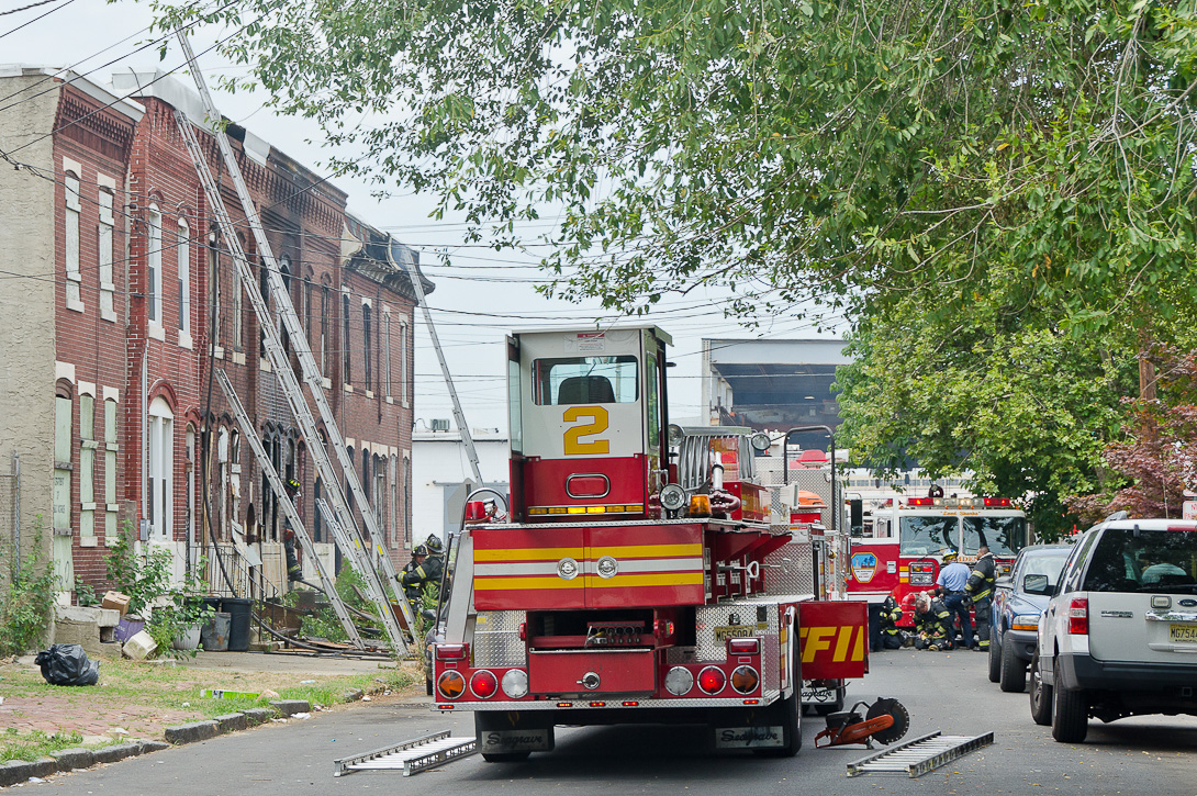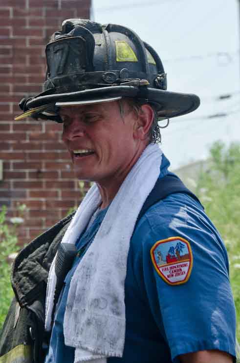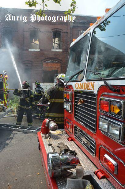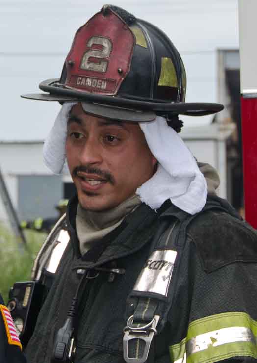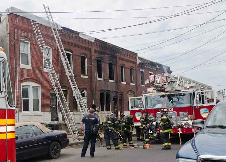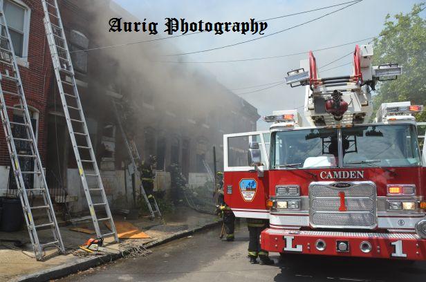 This page and the other pages in this series are the successors to the series of web-page about the Camden Fire Department that began with the page Camden Fire Department: The Fires of the Summer of 2011. On this and other pages in the series you will find pictures and information regarding different events and aspects of the fire service in Camden, New Jersey. Continued hot dry weather and more of the bad actions of social misfits gave the Camden Fire Department a too-hot job on July 10, 2012. Late in the morning a call came in reporting heavy fire coming from an abandoned house at 254 Mount Vernon Street. This structure was in the middle of a row of six two-story homes, numbers 248, 250, 252, 254, 256, and 258 Mount Vernon Street, with only 258 being occupied. With heavy fire showing from the second floor, all hands were placed in service. Companies secured water supplies and placed multiple hand lines in operation. With fire extending to the exposures on either side, command ordered all companies out of the dwellings as companies set up for defensive operations, placing their heaviest water lines in service. Crews placed several 2 1/2" hand lines to knock the bulk of the fire down which had extended in the attic area of the dwellings. Crews re- entered the dwellings to hit hot spots and open up. Two firefighters were slightly injured, and through the valiant efforts of Camden's Bravest, the home at 258 Mt. Vernon Street was saved. More photos from this fire taken by Ted Aurig can be seen at www.NewJerseyfireground.com. As with the web page covering other Camden Fire Department events, if you can identify anyone that I've missed, please comment at the bottom of the page. (I'm terrible at at names and faces). |