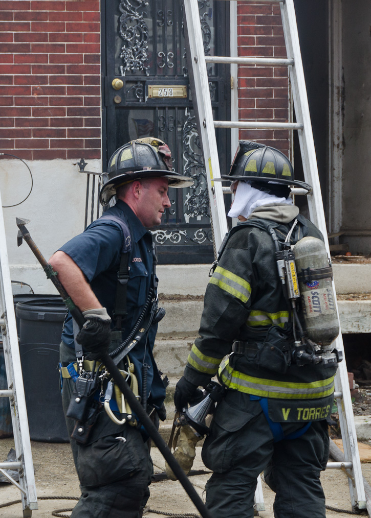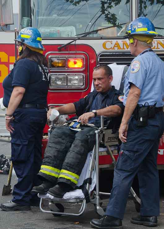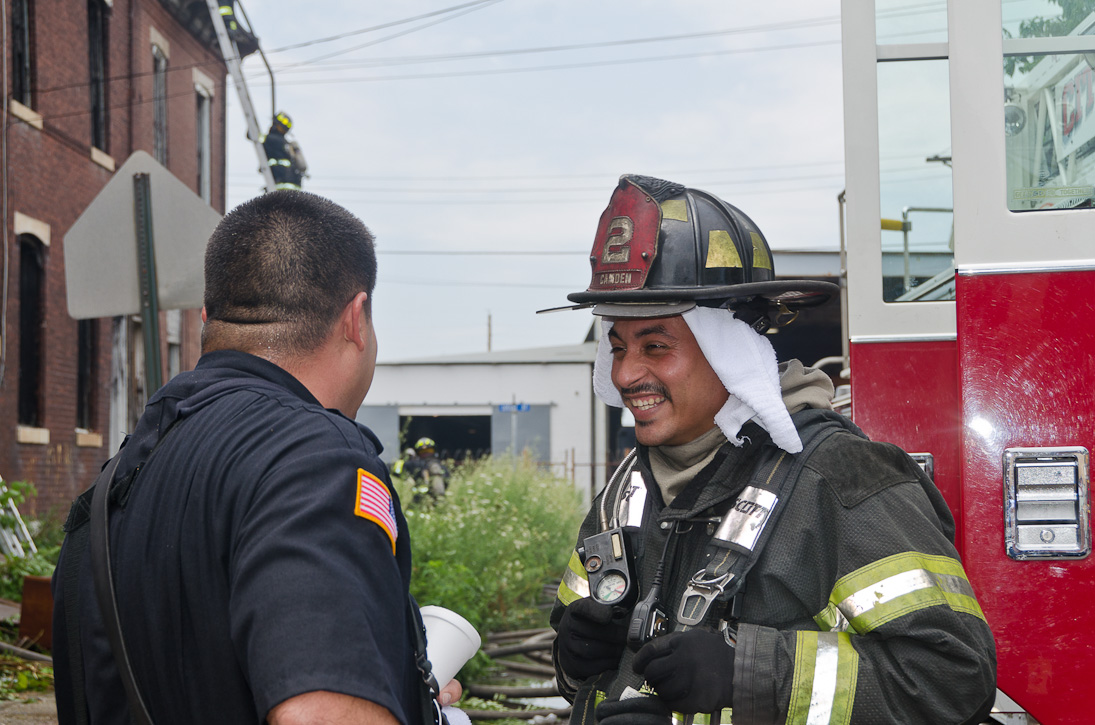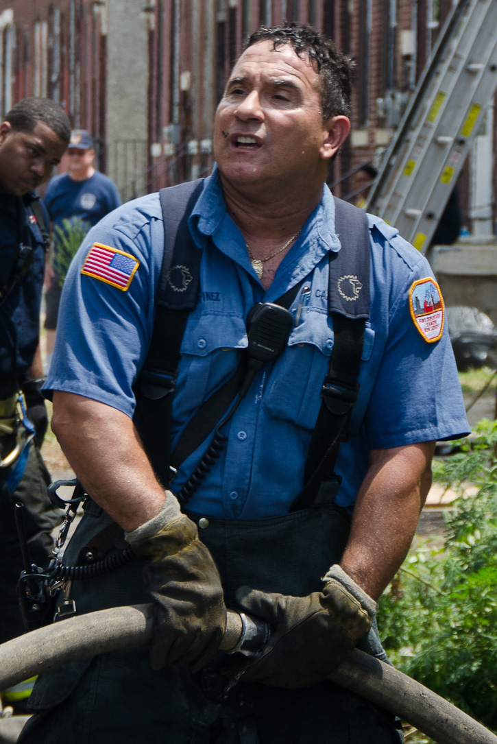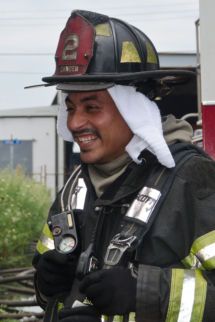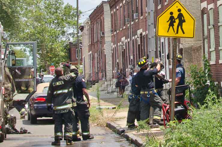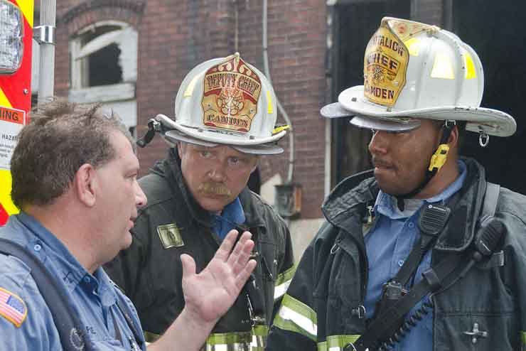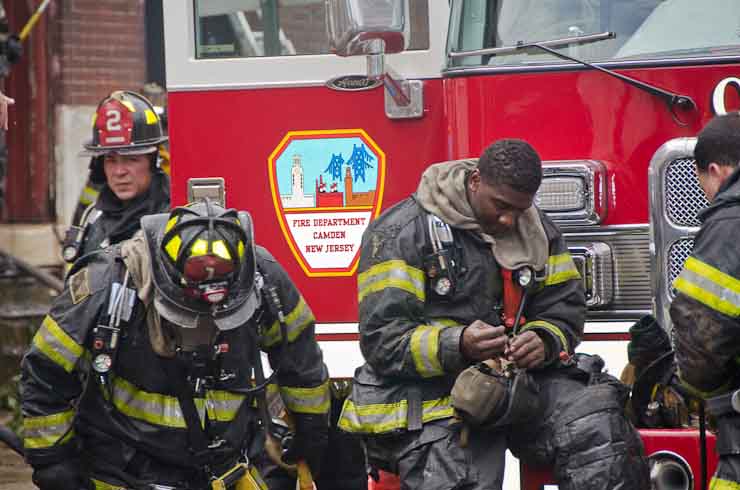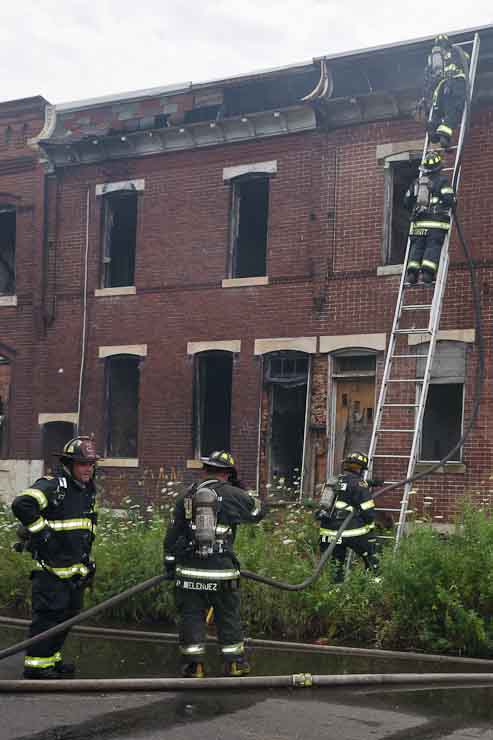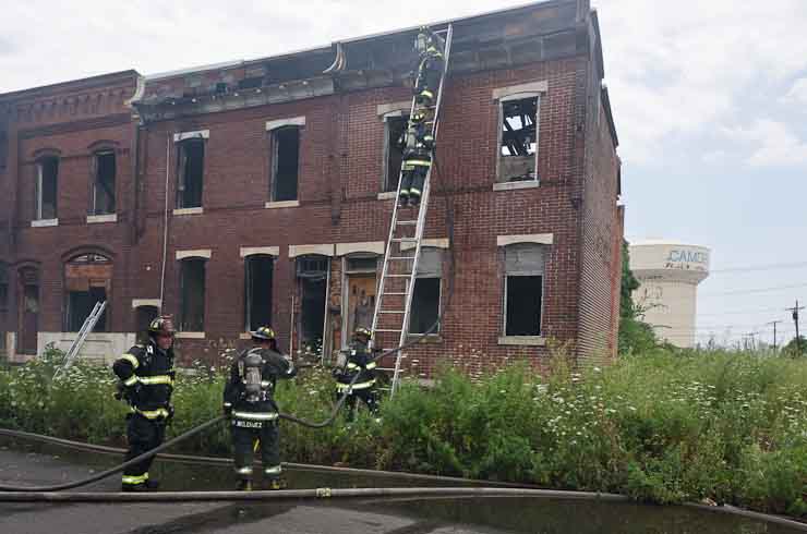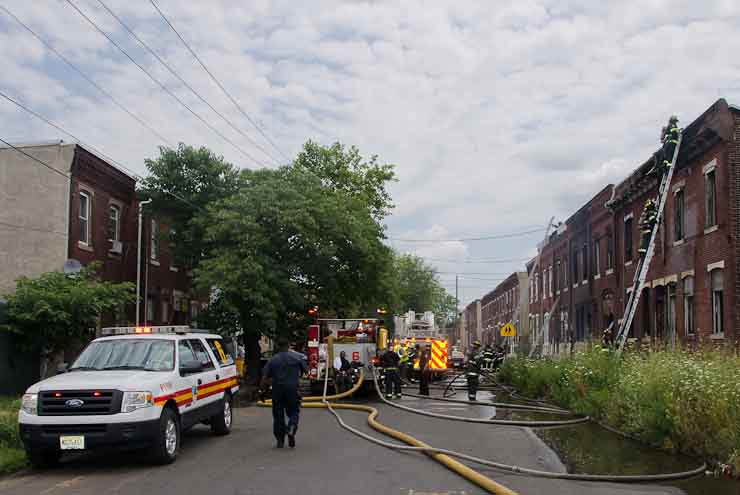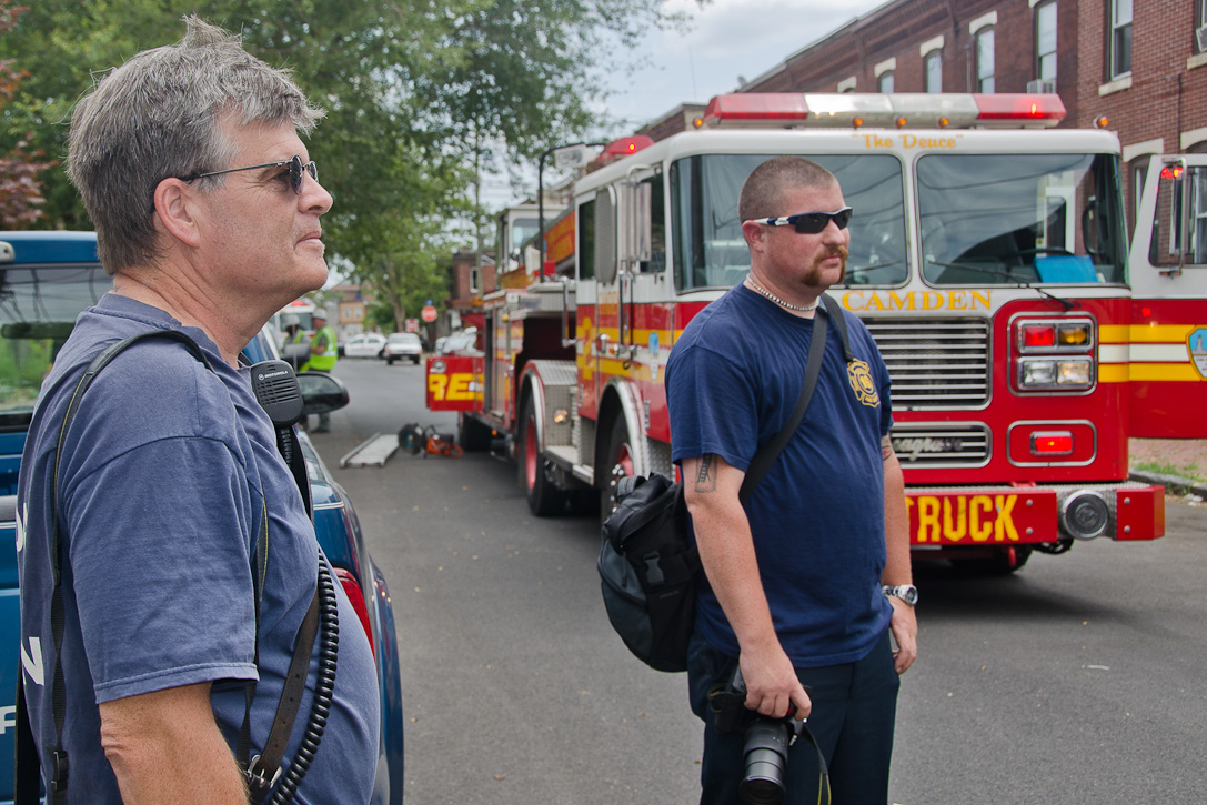 This page and the other pages in this series are the successors to the series of web-page about the Camden Fire Department that began with the page Camden Fire Department: The Fires of the Summer of 2011. On this and other pages in the series you will find pictures and information regarding different events and aspects of the fire service in Camden, New Jersey. Continued hot dry weather and more of the bad actions of social misfits gave the Camden Fire Department a too-hot job on July 10, 2012. Late in the morning a call came in reporting heavy fire coming from an abandoned house at 254 Mount Vernon Street. This structure was in the middle of a row of six two-story homes, numbers 248, 250, 252, 254, 256, and 258 Mount Vernon Street, with only 258 being occupied. With heavy fire showing from the second floor, all hands were placed in service. Companies secured water supplies and placed multiple hand lines in operation. With fire extending to the exposures on either side, command ordered all companies out of the dwellings as companies set up for defensive operations, placing their heaviest water lines in service. Crews placed several 2 1/2" hand lines to knock the bulk of the fire down which had extended in the attic area of the dwellings. Crews re- entered the dwellings to hit hot spots and open up. Two firefighters were slightly injured, and through the valiant efforts of Camden's Bravest, the home at 258 Mt. Vernon Street was saved. More photos from this fire taken by Ted Aurig can be seen at www.NewJerseyfireground.com. As with the web page covering other Camden Fire Department events, if you can identify anyone that I've missed, please comment at the bottom of the page. (I'm terrible at at names and faces). |