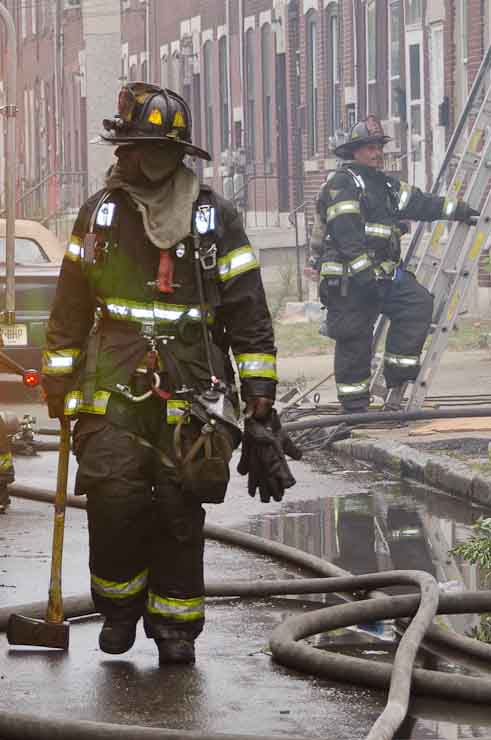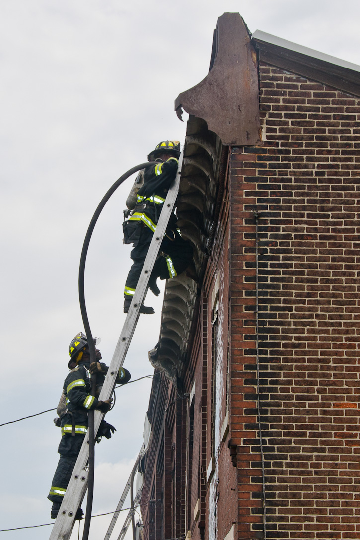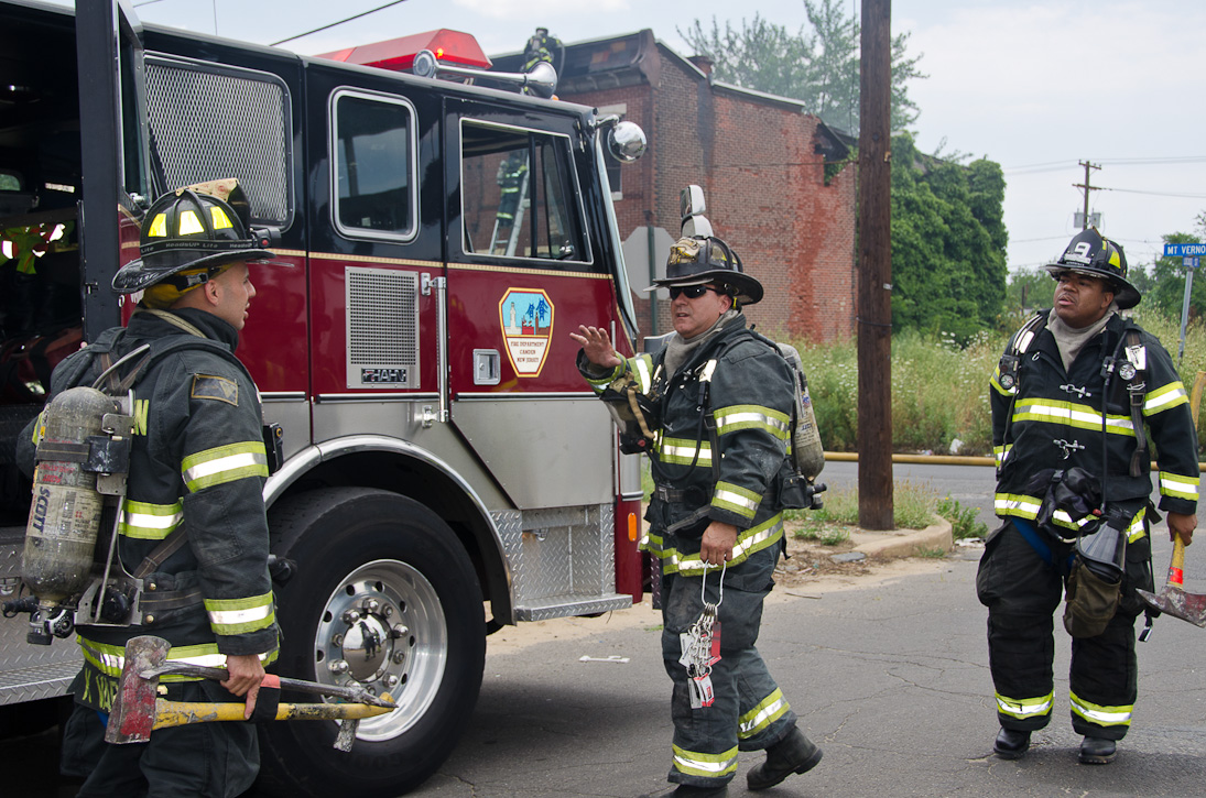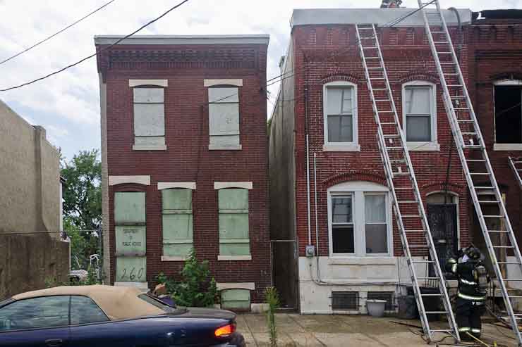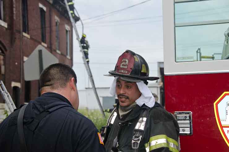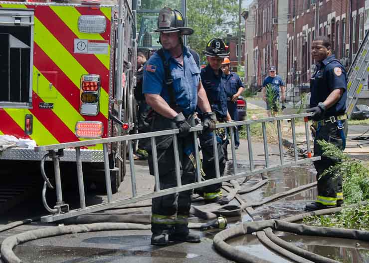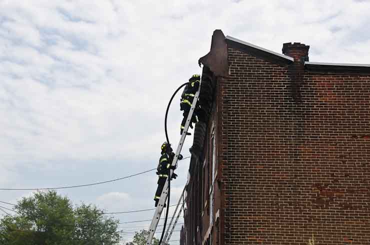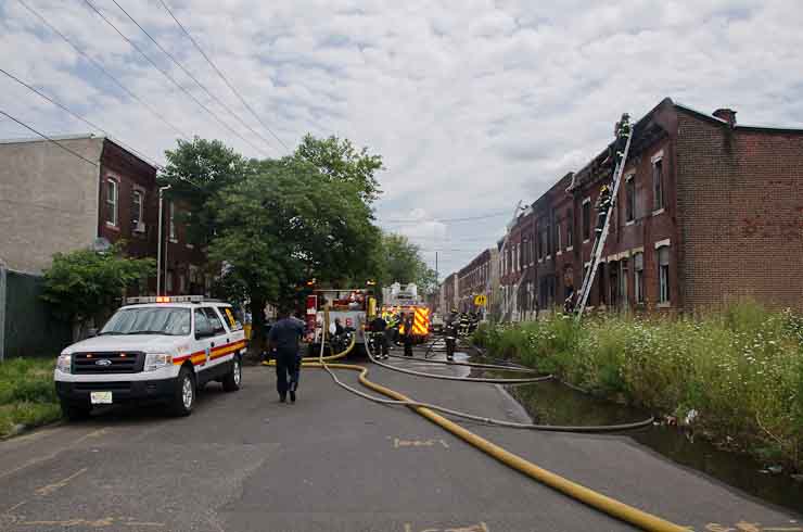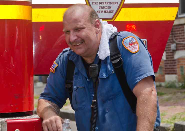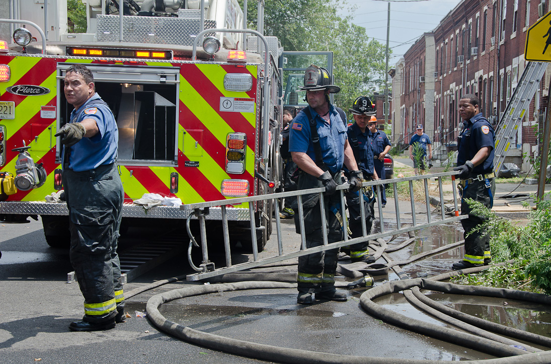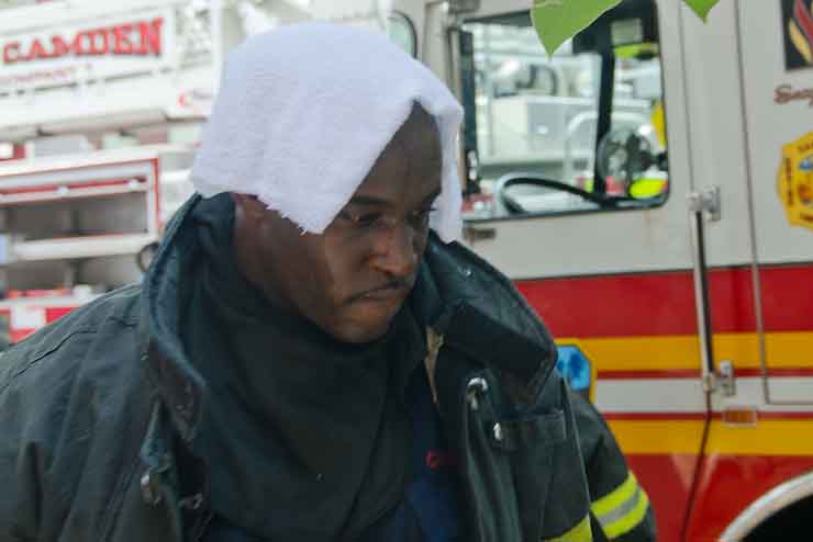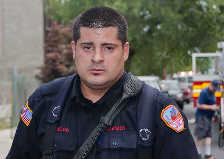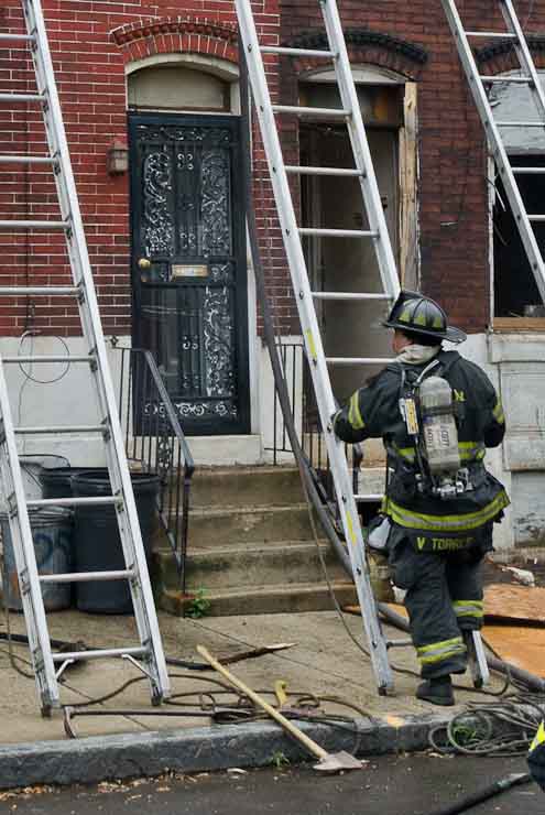 This page and the other pages in this series are the successors to the series of web-page about the Camden Fire Department that began with the page Camden Fire Department: The Fires of the Summer of 2011. On this and other pages in the series you will find pictures and information regarding different events and aspects of the fire service in Camden, New Jersey. Continued hot dry weather and more of the bad actions of social misfits gave the Camden Fire Department a too-hot job on July 10, 2012. Late in the morning a call came in reporting heavy fire coming from an abandoned house at 254 Mount Vernon Street. This structure was in the middle of a row of six two-story homes, numbers 248, 250, 252, 254, 256, and 258 Mount Vernon Street, with only 258 being occupied. With heavy fire showing from the second floor, all hands were placed in service. Companies secured water supplies and placed multiple hand lines in operation. With fire extending to the exposures on either side, command ordered all companies out of the dwellings as companies set up for defensive operations, placing their heaviest water lines in service. Crews placed several 2 1/2" hand lines to knock the bulk of the fire down which had extended in the attic area of the dwellings. Crews re- entered the dwellings to hit hot spots and open up. Two firefighters were slightly injured, and through the valiant efforts of Camden's Bravest, the home at 258 Mt. Vernon Street was saved. More photos from this fire taken by Ted Aurig can be seen at www.NewJerseyfireground.com. As with the web page covering other Camden Fire Department events, if you can identify anyone that I've missed, please comment at the bottom of the page. (I'm terrible at at names and faces). |