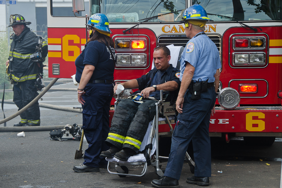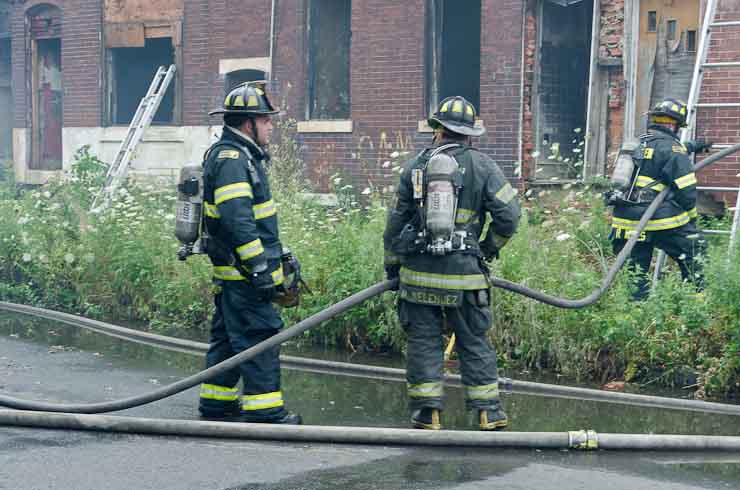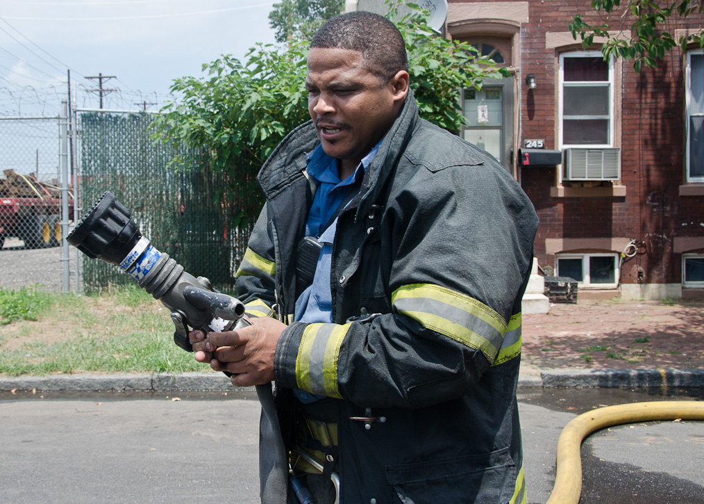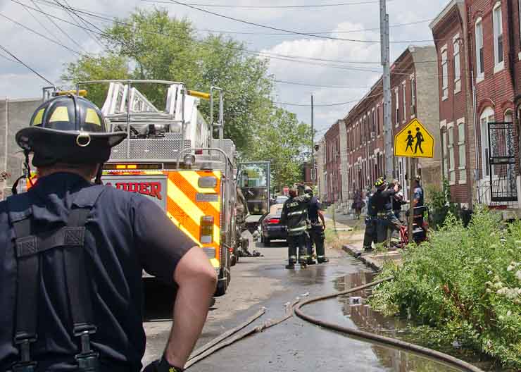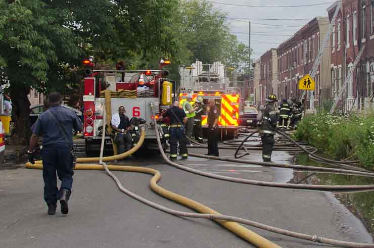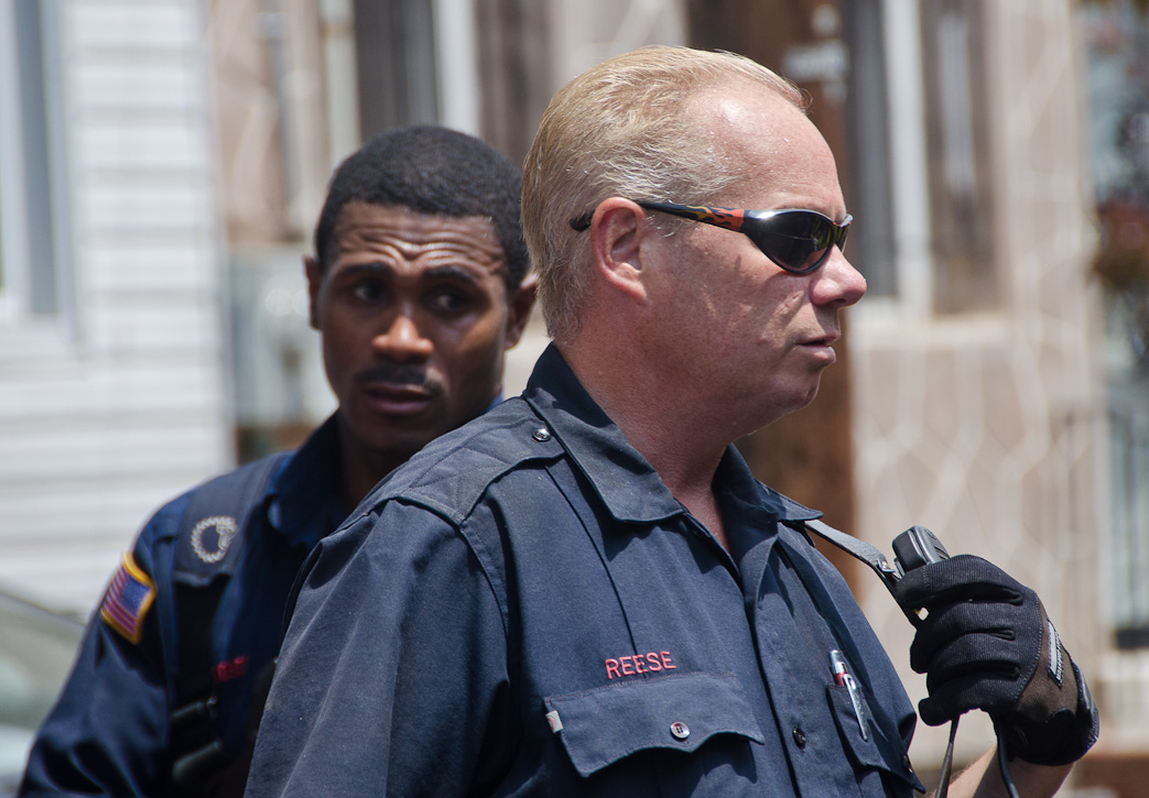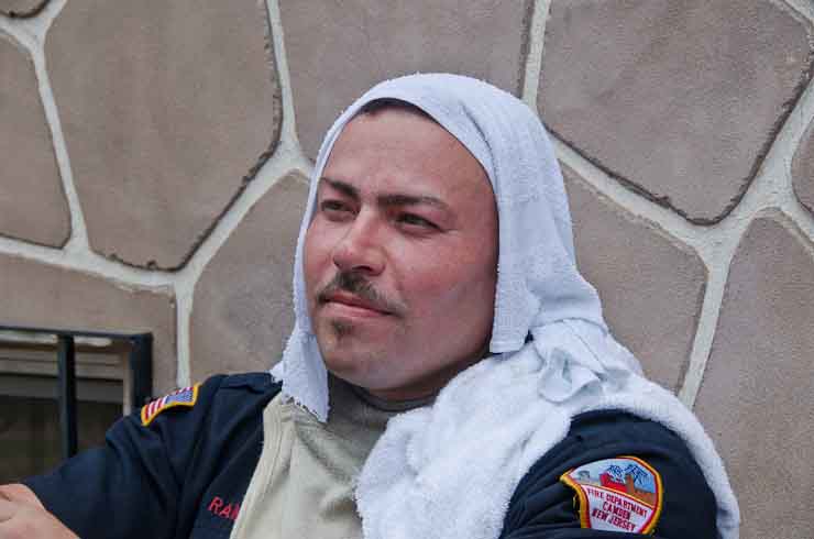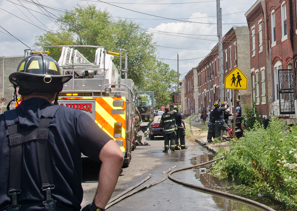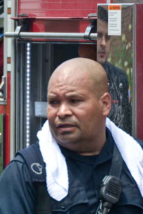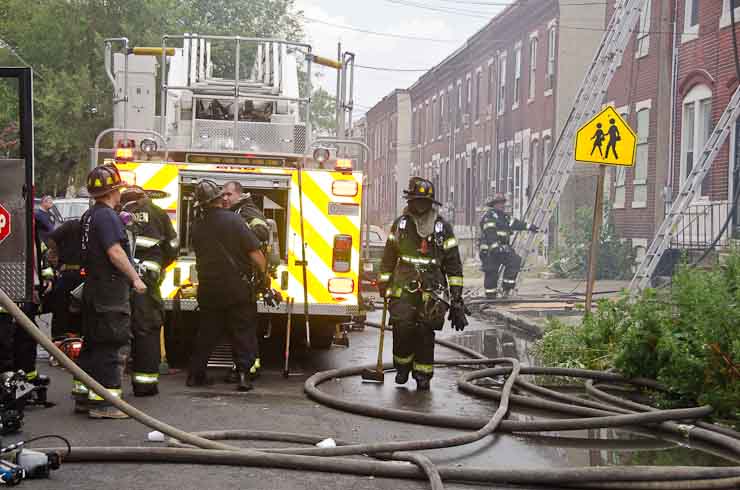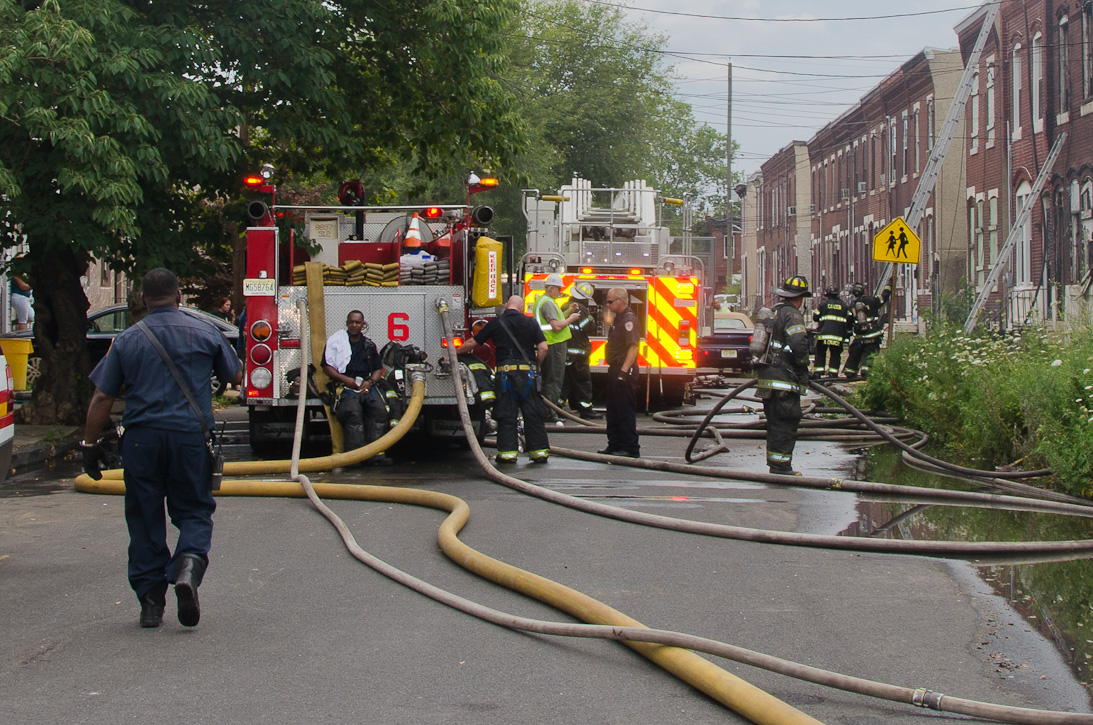 This page and the other pages in this series are the successors to the series of web-page about the Camden Fire Department that began with the page Camden Fire Department: The Fires of the Summer of 2011. On this and other pages in the series you will find pictures and information regarding different events and aspects of the fire service in Camden, New Jersey. Continued hot dry weather and more of the bad actions of social misfits gave the Camden Fire Department a too-hot job on July 10, 2012. Late in the morning a call came in reporting heavy fire coming from an abandoned house at 254 Mount Vernon Street. This structure was in the middle of a row of six two-story homes, numbers 248, 250, 252, 254, 256, and 258 Mount Vernon Street, with only 258 being occupied. With heavy fire showing from the second floor, all hands were placed in service. Companies secured water supplies and placed multiple hand lines in operation. With fire extending to the exposures on either side, command ordered all companies out of the dwellings as companies set up for defensive operations, placing their heaviest water lines in service. Crews placed several 2 1/2" hand lines to knock the bulk of the fire down which had extended in the attic area of the dwellings. Crews re- entered the dwellings to hit hot spots and open up. Two firefighters were slightly injured, and through the valiant efforts of Camden's Bravest, the home at 258 Mt. Vernon Street was saved. More photos from this fire taken by Ted Aurig can be seen at www.NewJerseyfireground.com. As with the web page covering other Camden Fire Department events, if you can identify anyone that I've missed, please comment at the bottom of the page. (I'm terrible at at names and faces). |