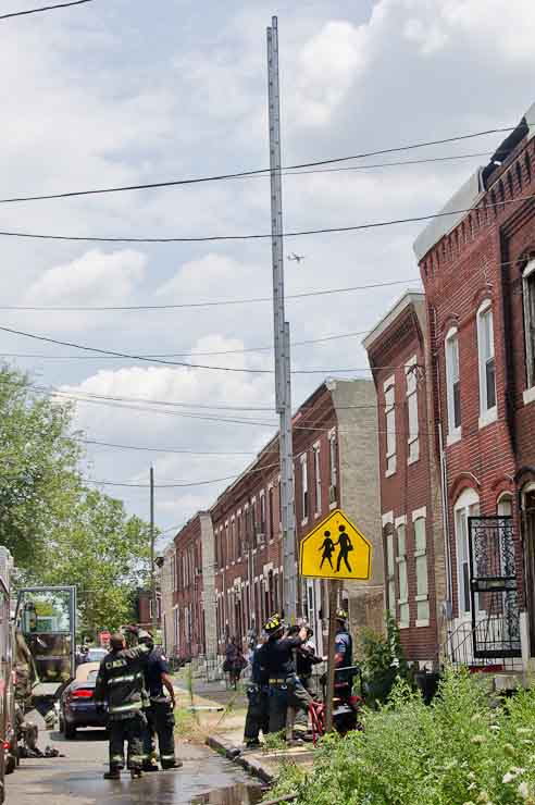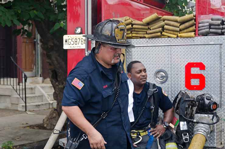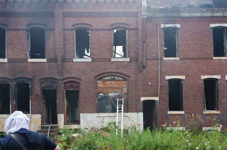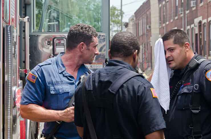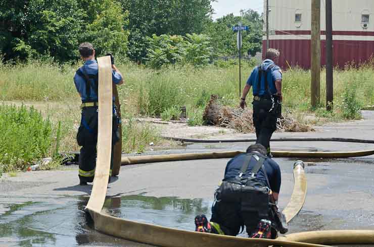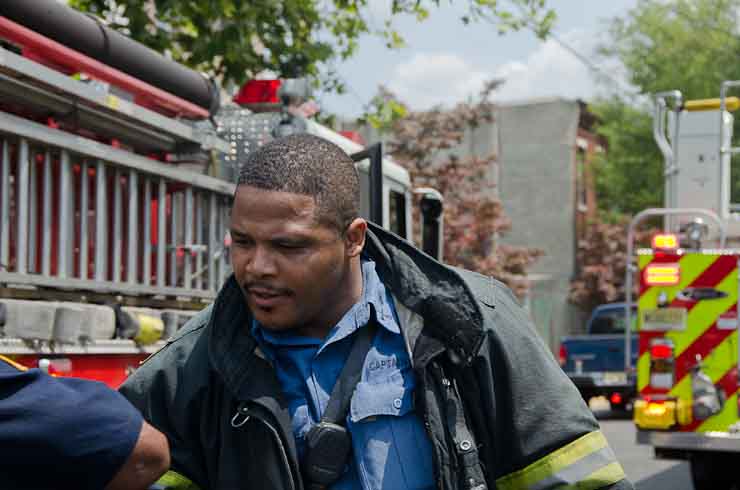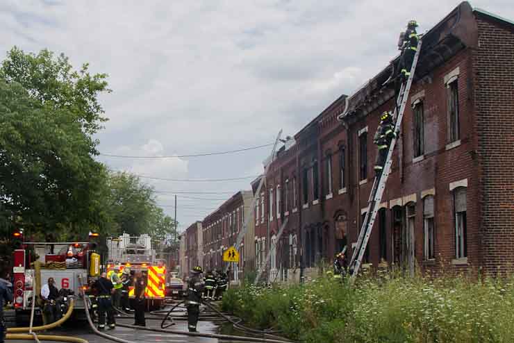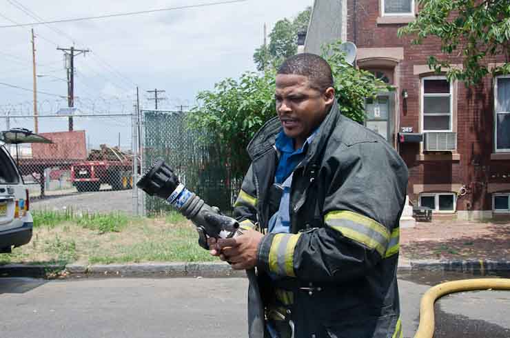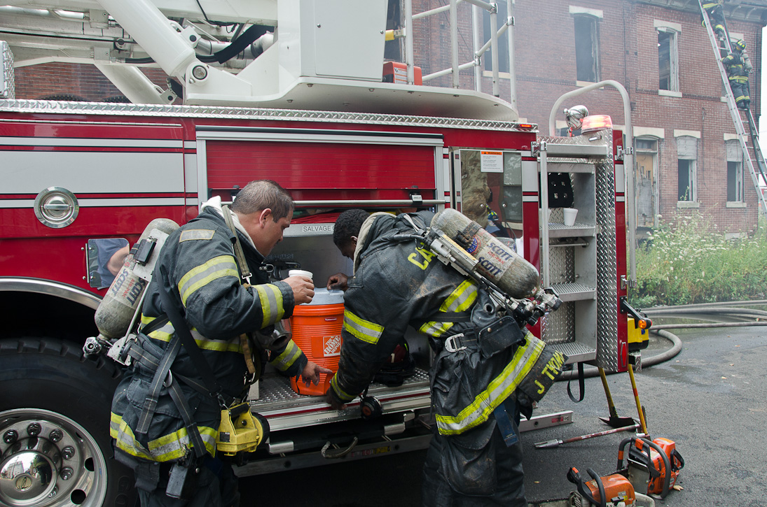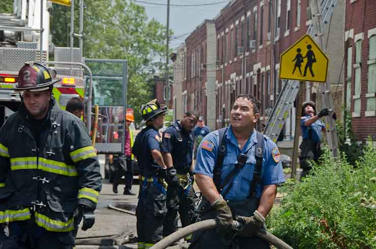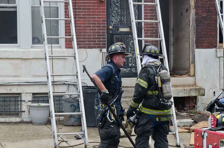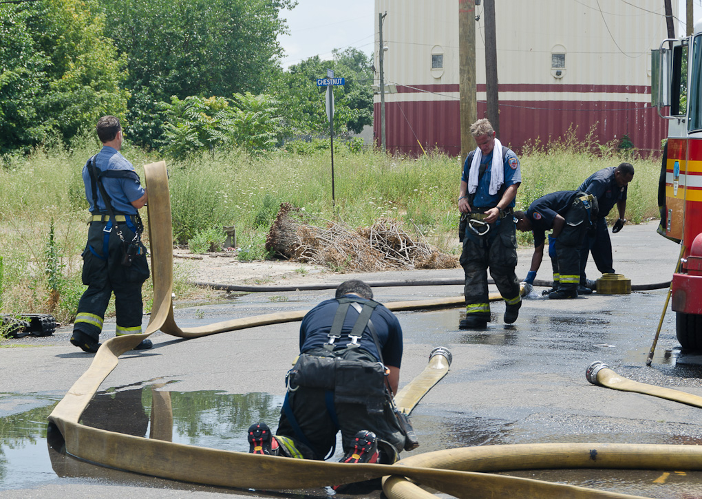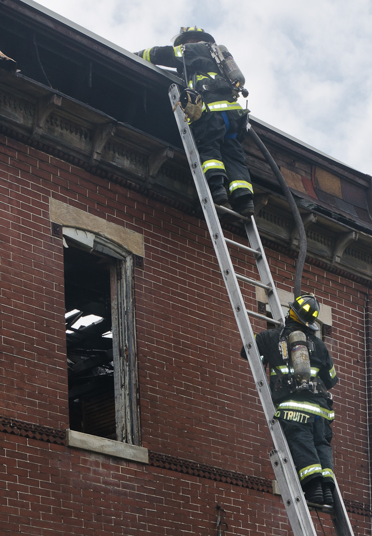This page and the other pages in this series are the successors to the series of web-page about the Camden Fire Department that began with the page Camden Fire Department: The Fires of the Summer of 2011. On this and other pages in the series you will find pictures and information regarding different events and aspects of the fire service in Camden, New Jersey. Continued hot dry weather and more of the bad actions of social misfits gave the Camden Fire Department a too-hot job on July 10, 2012. Late in the morning a call came in reporting heavy fire coming from an abandoned house at 254 Mount Vernon Street. This structure was in the middle of a row of six two-story homes, numbers 248, 250, 252, 254, 256, and 258 Mount Vernon Street, with only 258 being occupied. With heavy fire showing from the second floor, all hands were placed in service. Companies secured water supplies and placed multiple hand lines in operation. With fire extending to the exposures on either side, command ordered all companies out of the dwellings as companies set up for defensive operations, placing their heaviest water lines in service. Crews placed several 2 1/2" hand lines to knock the bulk of the fire down which had extended in the attic area of the dwellings. Crews re- entered the dwellings to hit hot spots and open up. Two firefighters were slightly injured, and through the valiant efforts of Camden's Bravest, the home at 258 Mt. Vernon Street was saved. More photos from this fire taken by Ted Aurig can be seen at www.NewJerseyfireground.com. As with the web page covering other Camden Fire Department events, if you can identify anyone that I've missed, please comment at the bottom of the page. (I'm terrible at at names and faces). |