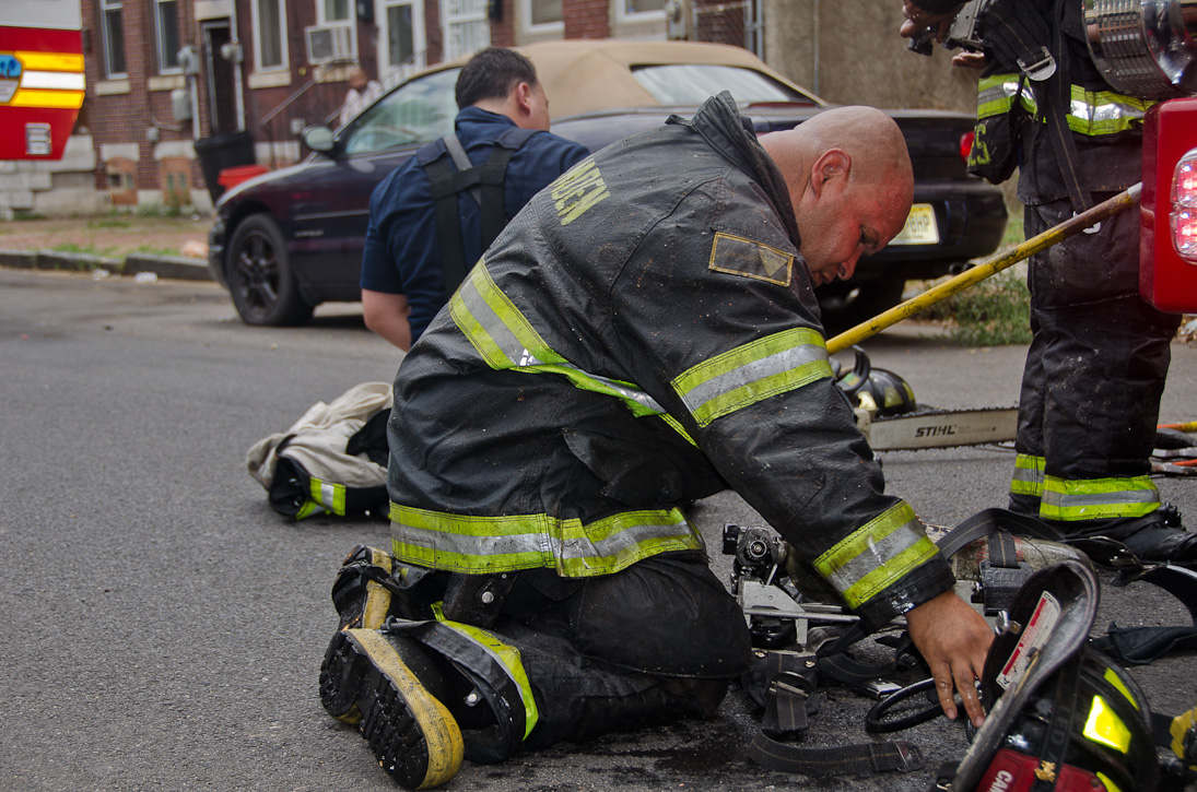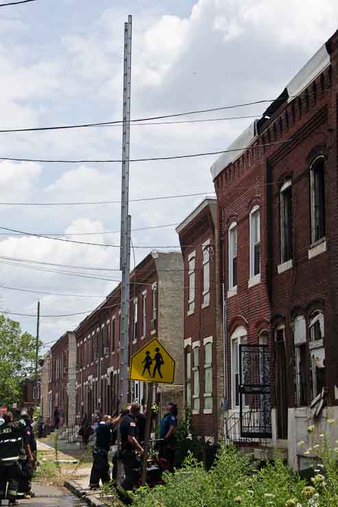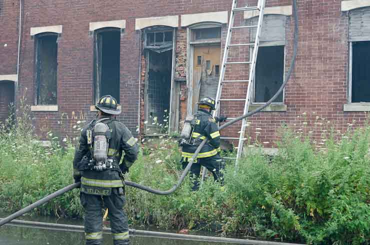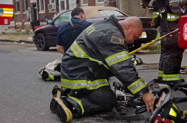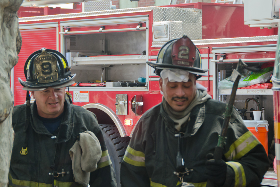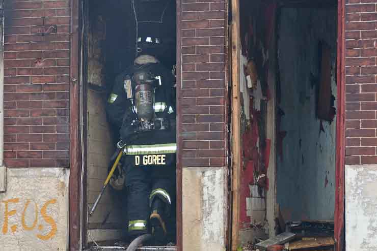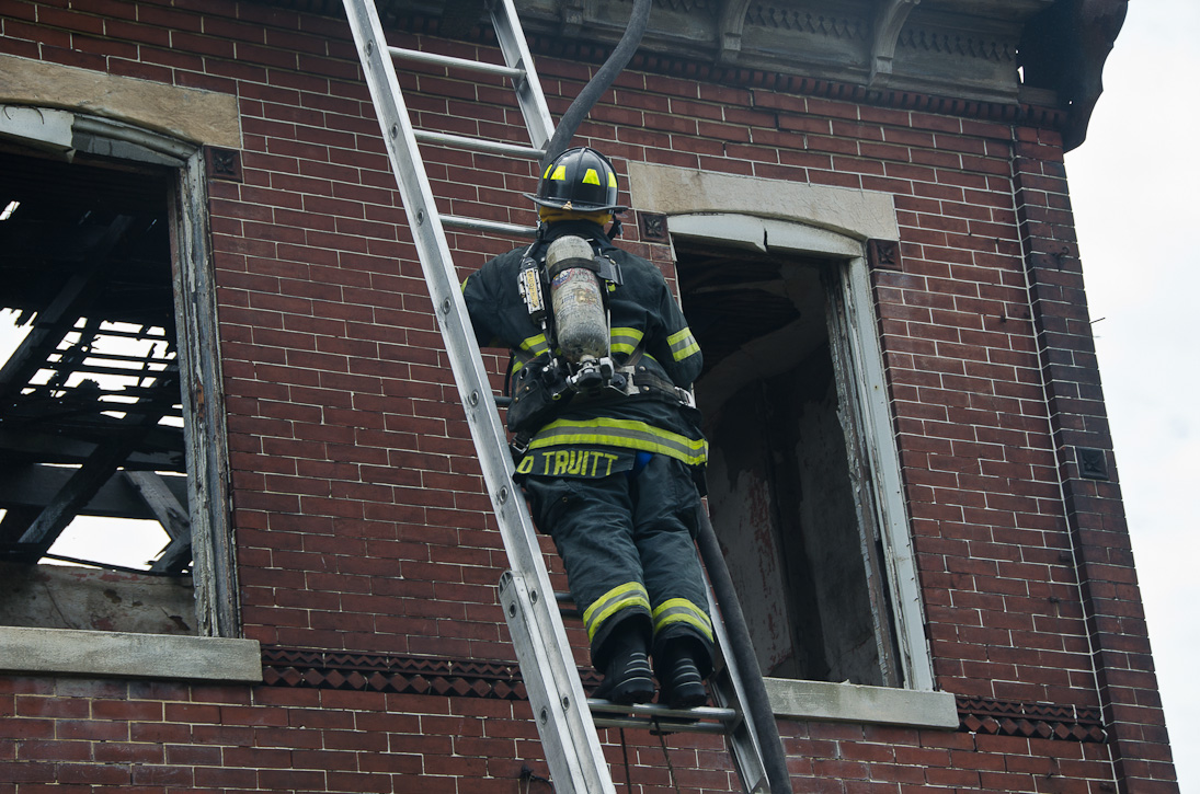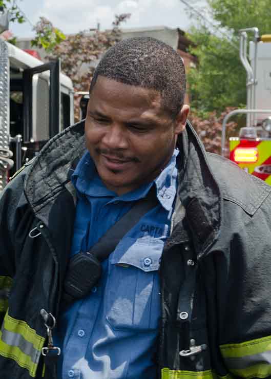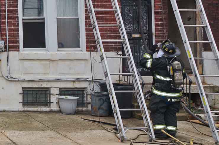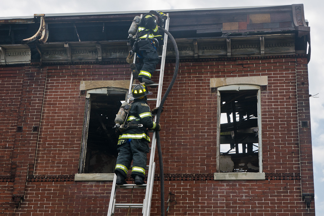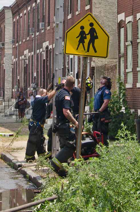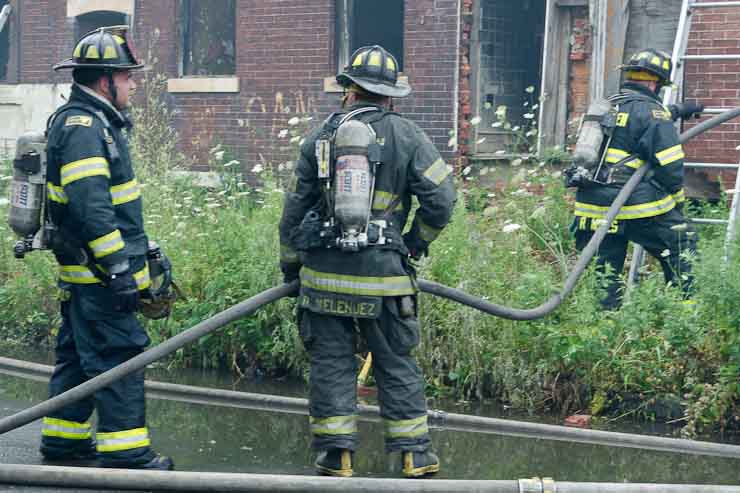 This page and the other pages in this series are the successors to the series of web-page about the Camden Fire Department that began with the page Camden Fire Department: The Fires of the Summer of 2011. On this and other pages in the series you will find pictures and information regarding different events and aspects of the fire service in Camden, New Jersey. Continued hot dry weather and more of the bad actions of social misfits gave the Camden Fire Department a too-hot job on July 10, 2012. Late in the morning a call came in reporting heavy fire coming from an abandoned house at 254 Mount Vernon Street. This structure was in the middle of a row of six two-story homes, numbers 248, 250, 252, 254, 256, and 258 Mount Vernon Street, with only 258 being occupied. With heavy fire showing from the second floor, all hands were placed in service. Companies secured water supplies and placed multiple hand lines in operation. With fire extending to the exposures on either side, command ordered all companies out of the dwellings as companies set up for defensive operations, placing their heaviest water lines in service. Crews placed several 2 1/2" hand lines to knock the bulk of the fire down which had extended in the attic area of the dwellings. Crews re- entered the dwellings to hit hot spots and open up. Two firefighters were slightly injured, and through the valiant efforts of Camden's Bravest, the home at 258 Mt. Vernon Street was saved. More photos from this fire taken by Ted Aurig can be seen at www.NewJerseyfireground.com. As with the web page covering other Camden Fire Department events, if you can identify anyone that I've missed, please comment at the bottom of the page. (I'm terrible at at names and faces). |
