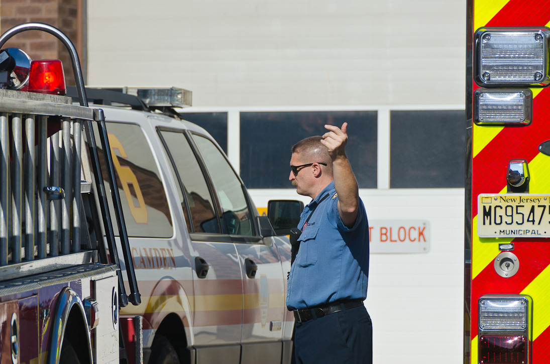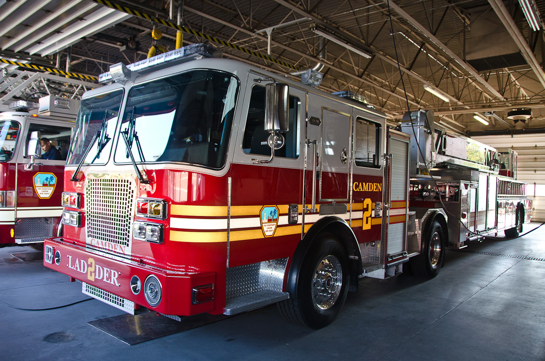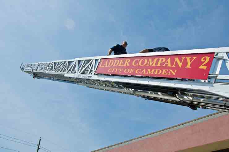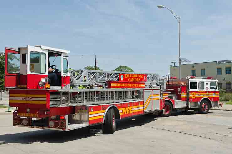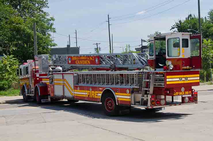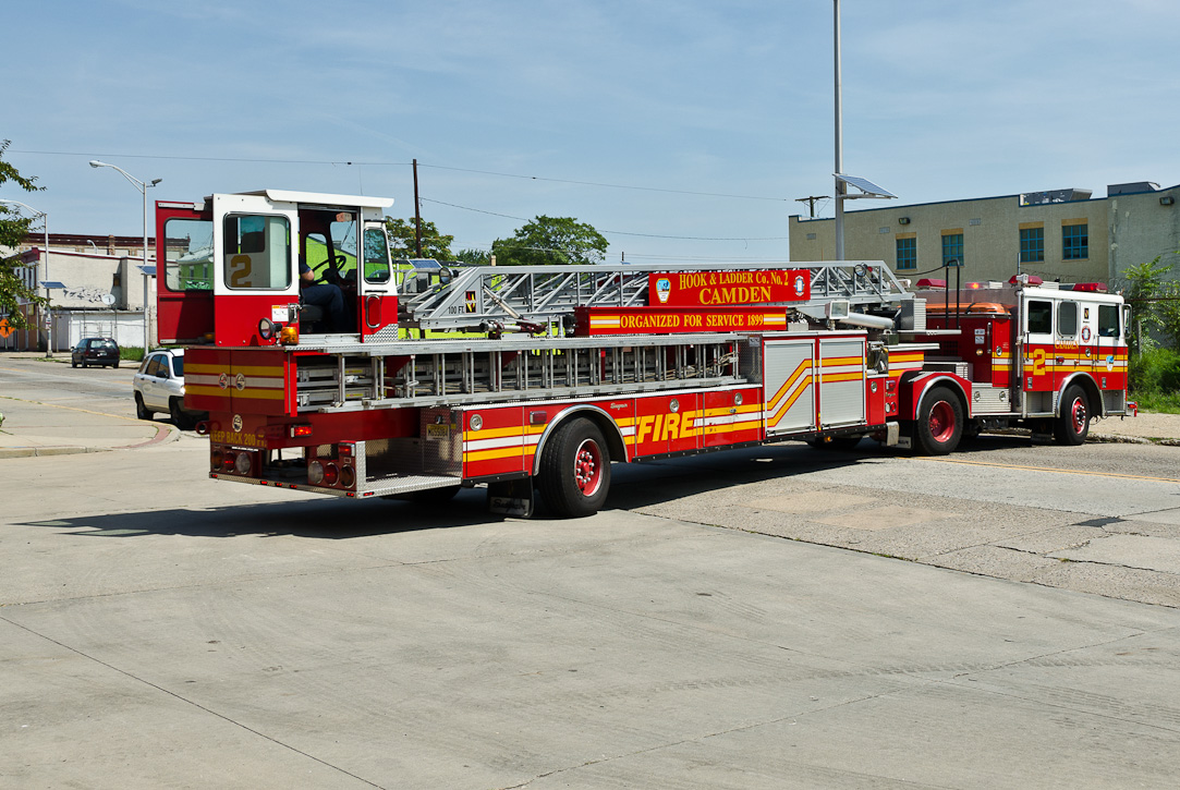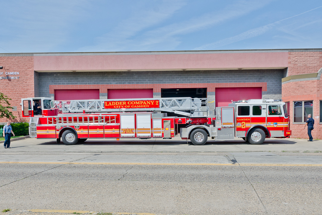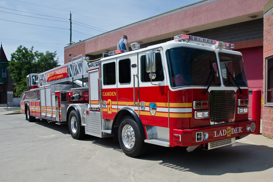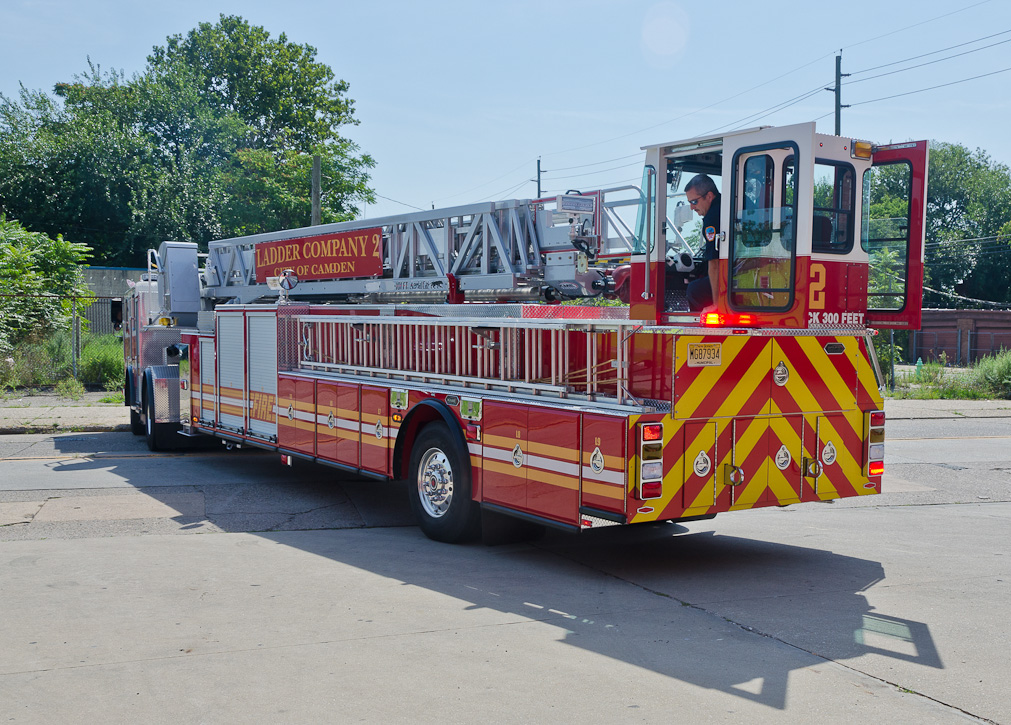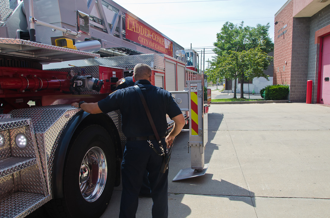 This page and the other pages in this series are the successors to the series of web-page about the Camden Fire Department that began with the page Camden Fire Department: The Fires of the Summer of 2011. On this and other pages in the series you will find pictures and information regarding different events and aspects of the fire service in Camden, New Jersey. I spent some time at Liberty Station with the men of Ladder 2 and Rescue 1… who have been jumping in and out of the two pieces of equipment for far too long… the new Ladder 2 truck had just been placed in service and the men were still training on it. No runs, but a trip to Pathmark to pick up groceries for the day's lunch and dinner, and a stop at the PATCO High Speed Line station to check out an excavation so it would be known what the conditions were in case of a trench collapse. Interesting stuff! The new ladder goes up, if memory serves, one hundred and one feet. After watching a couple of the fellows make the climb, I was asked if I wanted to take a crack at it, and yours truly went about two-thirds of the way up, and snapped a few pictures. As with the web page covering other Camden Fire Department events, if you can identify anyone that I've missed, please comment at the bottom of the page. (I'm terrible at at names and faces). October 30, 2012 |