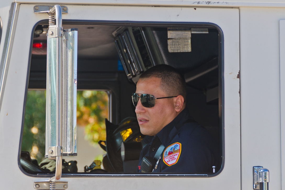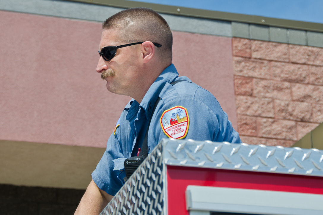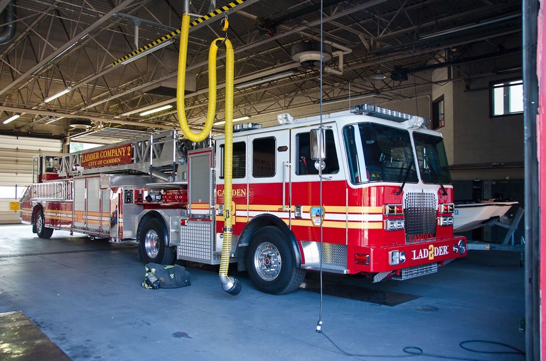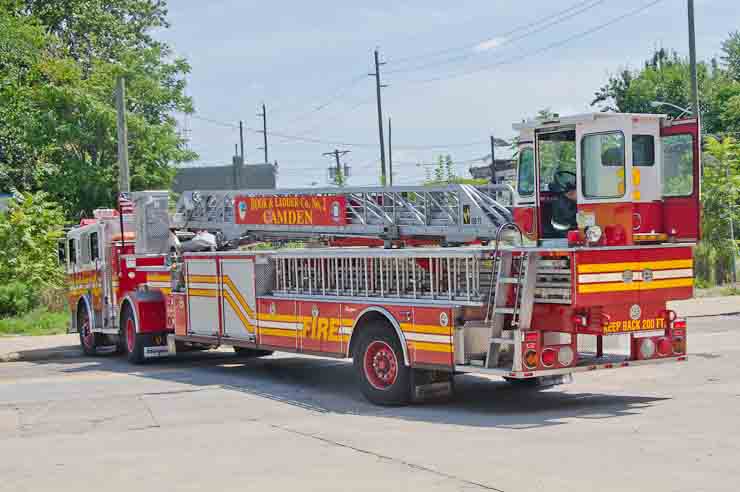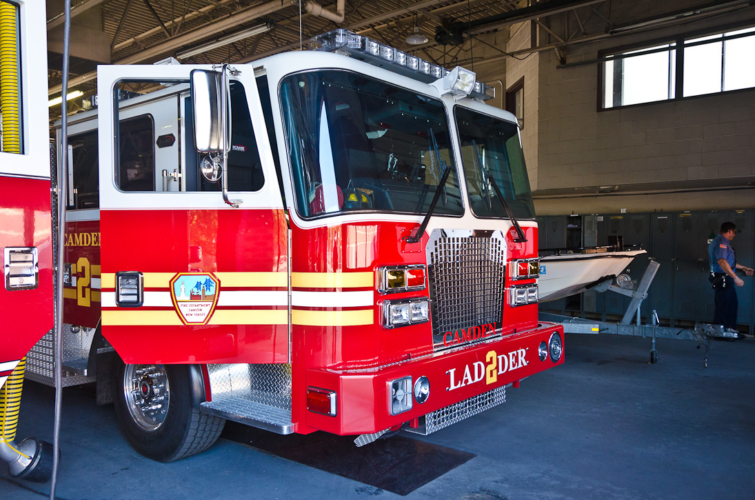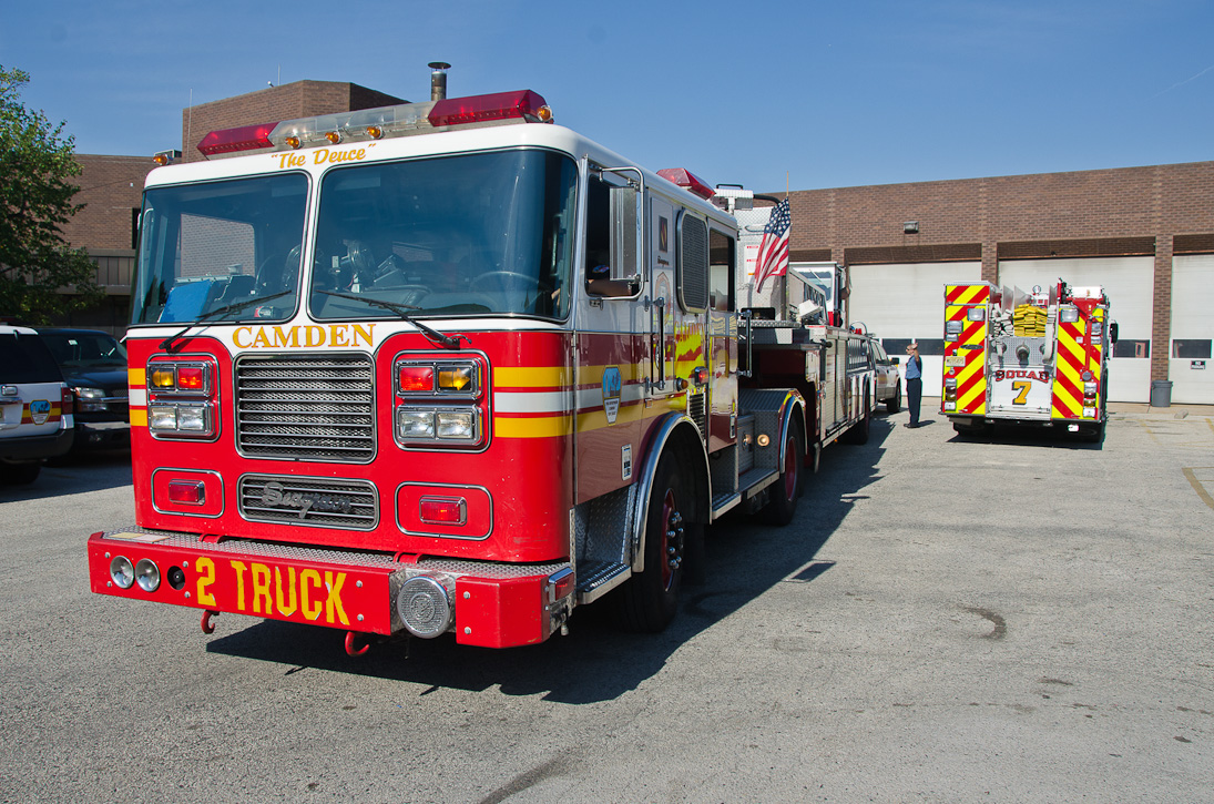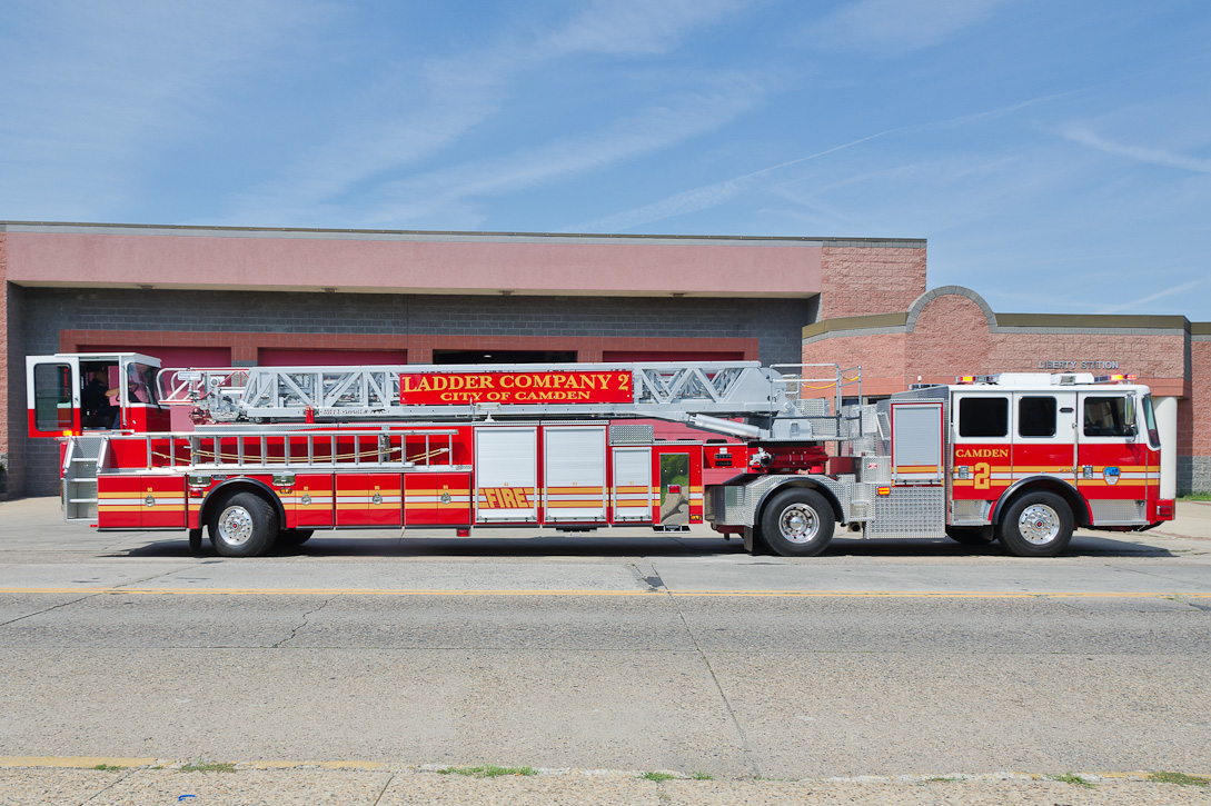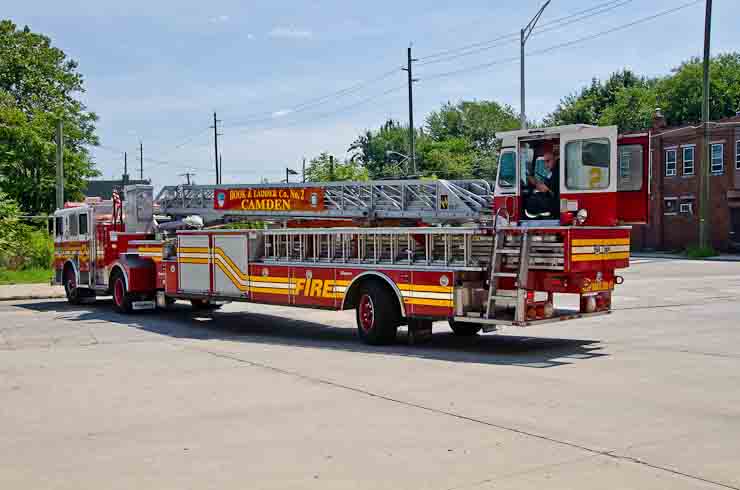 This page and the other pages in this series are the successors to the series of web-page about the Camden Fire Department that began with the page Camden Fire Department: The Fires of the Summer of 2011. On this and other pages in the series you will find pictures and information regarding different events and aspects of the fire service in Camden, New Jersey. I spent some time at Liberty Station with the men of Ladder 2 and Rescue 1… who have been jumping in and out of the two pieces of equipment for far too long… the new Ladder 2 truck had just been placed in service and the men were still training on it. No runs, but a trip to Pathmark to pick up groceries for the day's lunch and dinner, and a stop at the PATCO High Speed Line station to check out an excavation so it would be known what the conditions were in case of a trench collapse. Interesting stuff! The new ladder goes up, if memory serves, one hundred and one feet. After watching a couple of the fellows make the climb, I was asked if I wanted to take a crack at it, and yours truly went about two-thirds of the way up, and snapped a few pictures. As with the web page covering other Camden Fire Department events, if you can identify anyone that I've missed, please comment at the bottom of the page. (I'm terrible at at names and faces). October 30, 2012 |