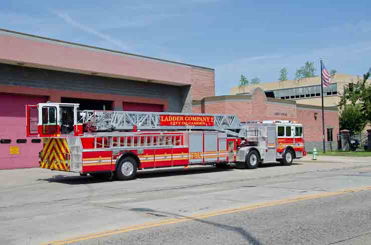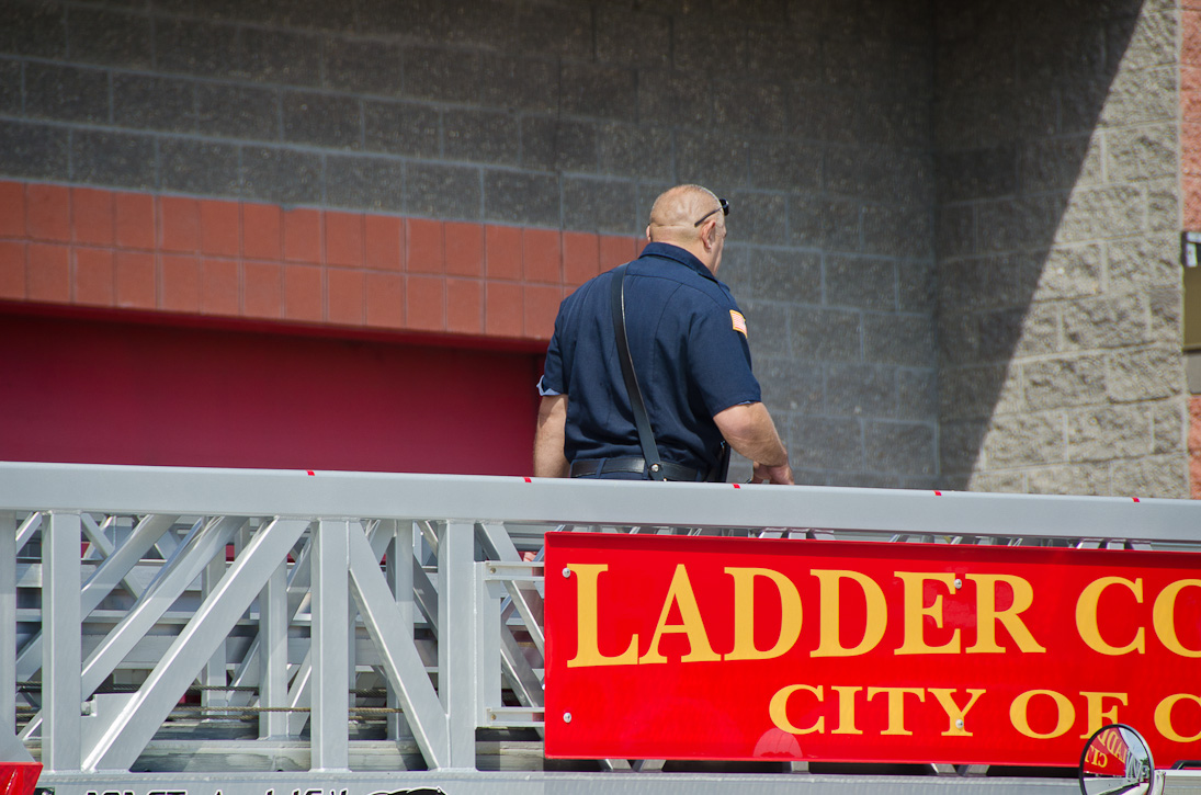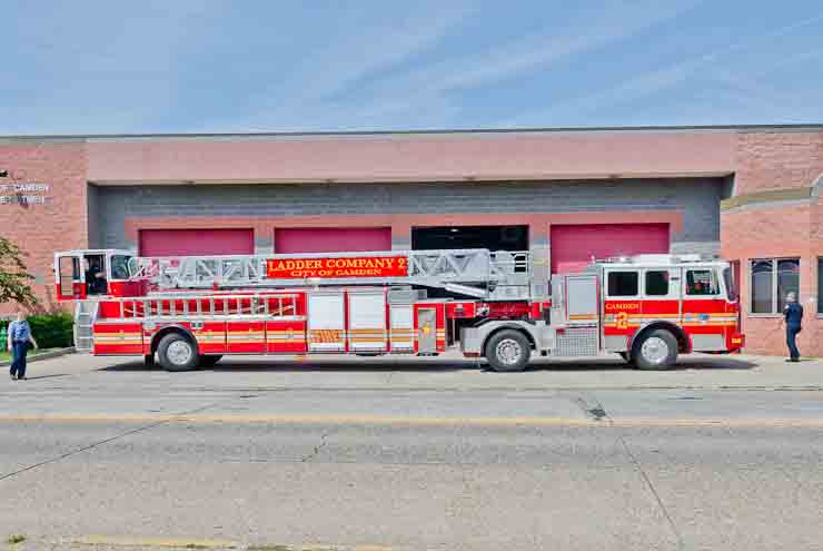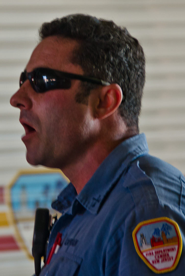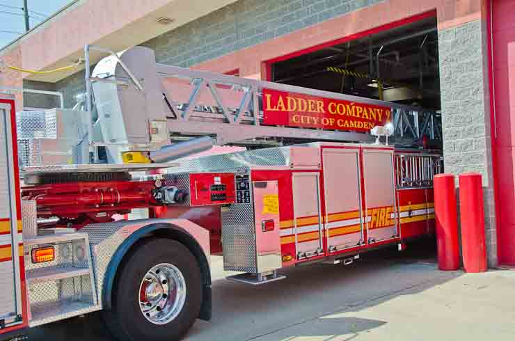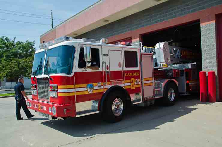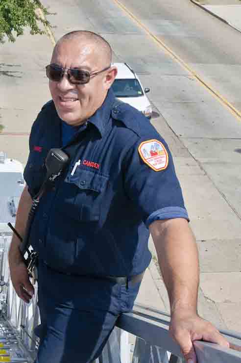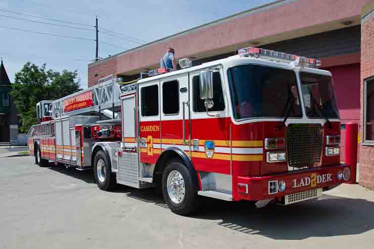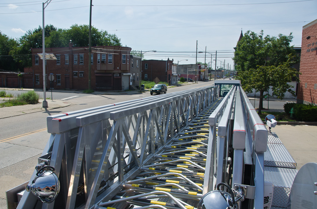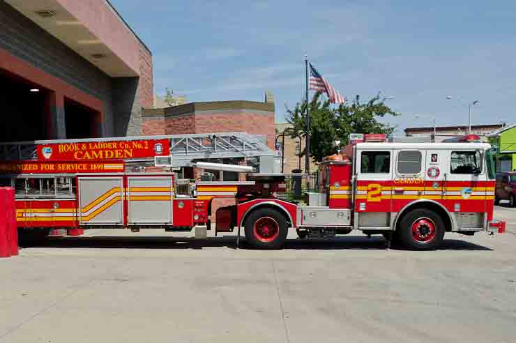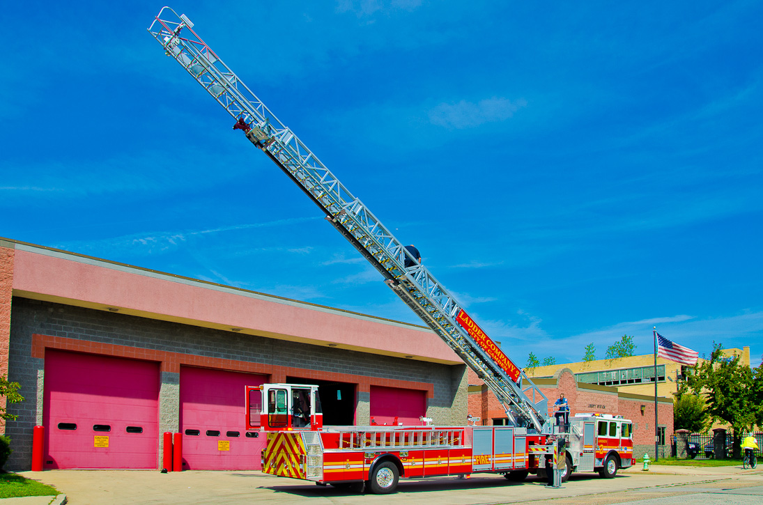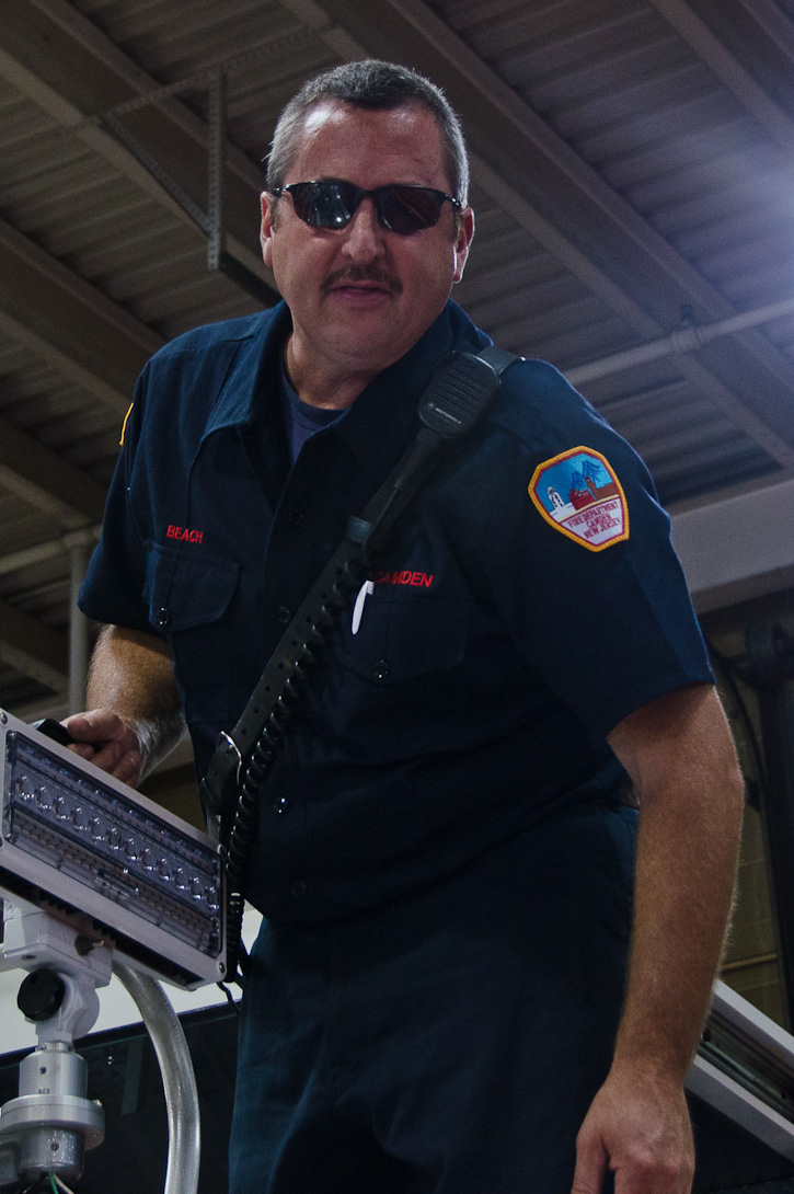 This page and the other pages in this series are the successors to the series of web-page about the Camden Fire Department that began with the page Camden Fire Department: The Fires of the Summer of 2011. On this and other pages in the series you will find pictures and information regarding different events and aspects of the fire service in Camden, New Jersey. I spent some time at Liberty Station with the men of Ladder 2 and Rescue 1… who have been jumping in and out of the two pieces of equipment for far too long… the new Ladder 2 truck had just been placed in service and the men were still training on it. No runs, but a trip to Pathmark to pick up groceries for the day's lunch and dinner, and a stop at the PATCO High Speed Line station to check out an excavation so it would be known what the conditions were in case of a trench collapse. Interesting stuff! The new ladder goes up, if memory serves, one hundred and one feet. After watching a couple of the fellows make the climb, I was asked if I wanted to take a crack at it, and yours truly went about two-thirds of the way up, and snapped a few pictures. As with the web page covering other Camden Fire Department events, if you can identify anyone that I've missed, please comment at the bottom of the page. (I'm terrible at at names and faces). October 30, 2012 |