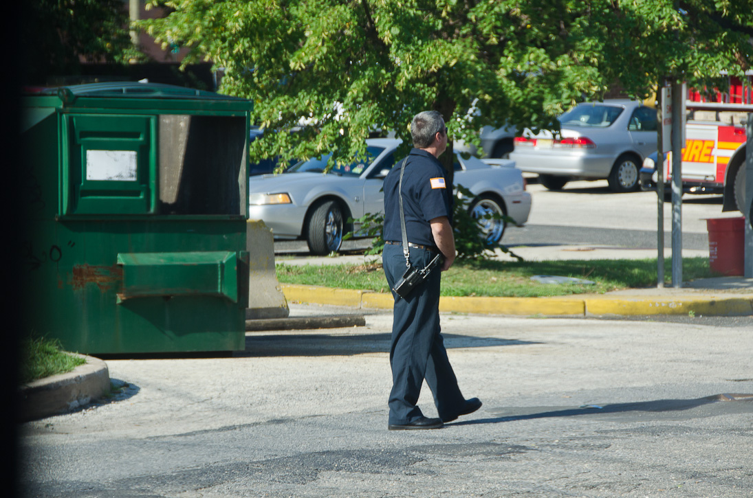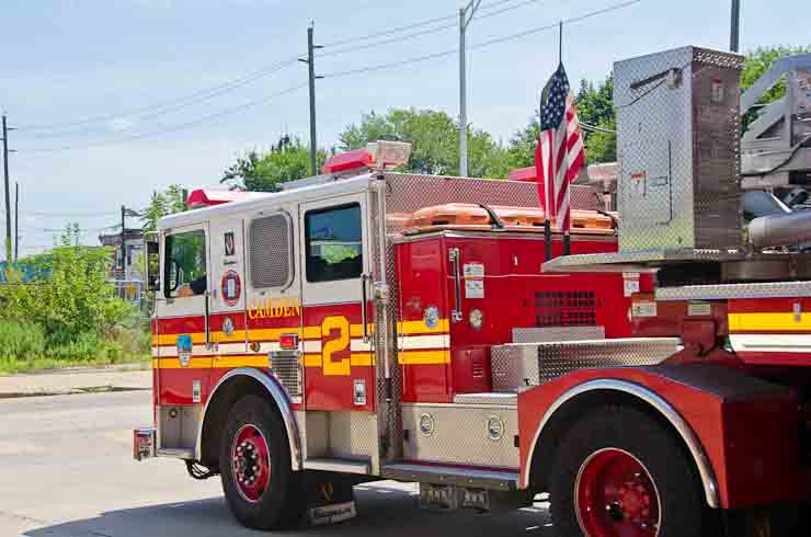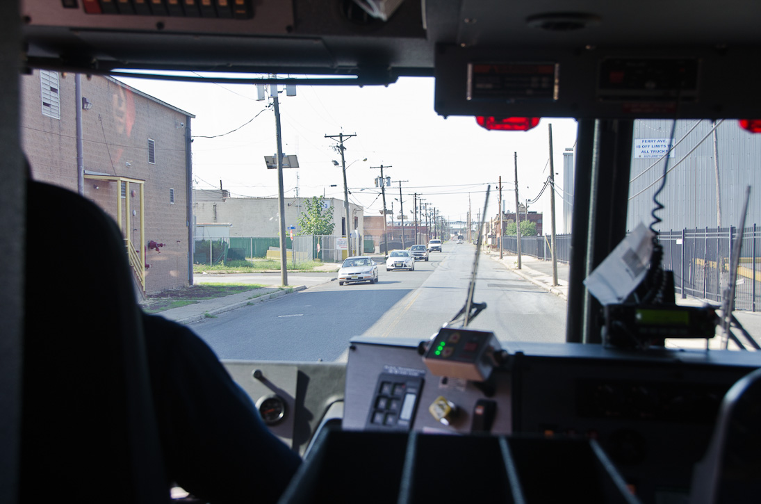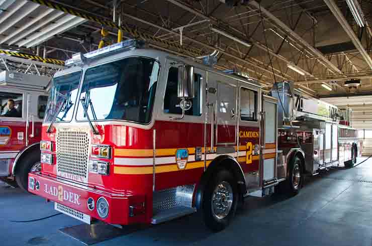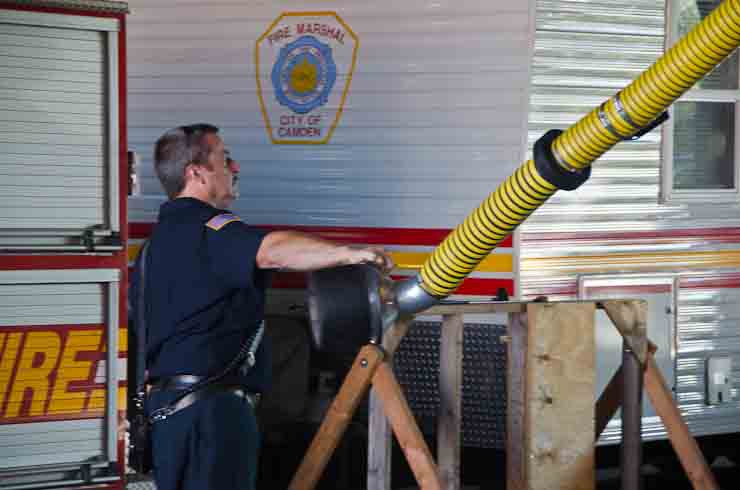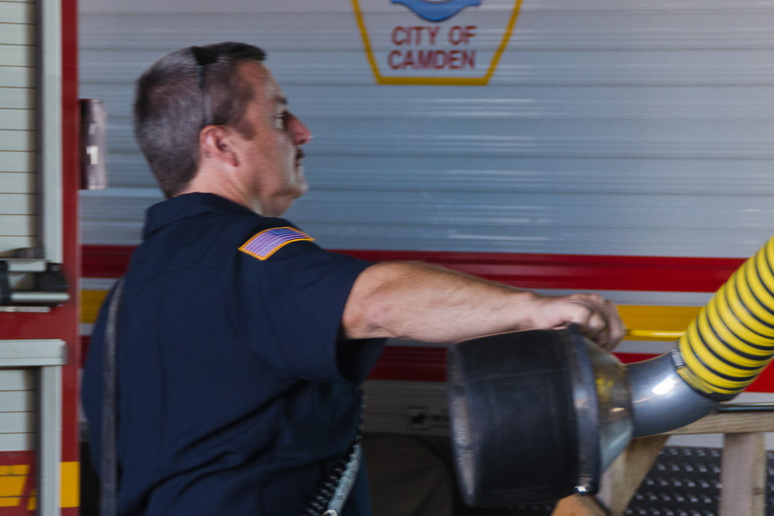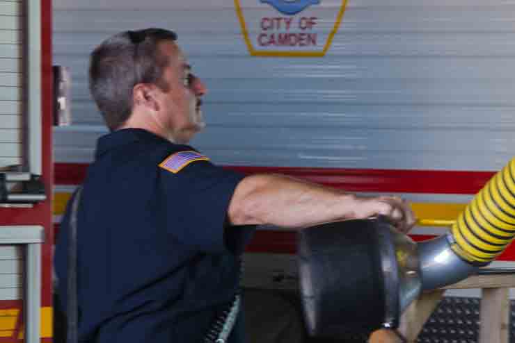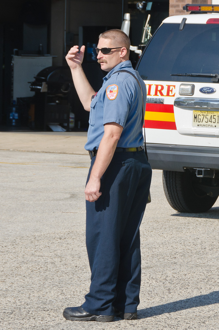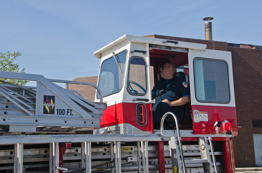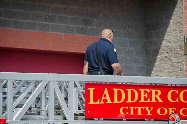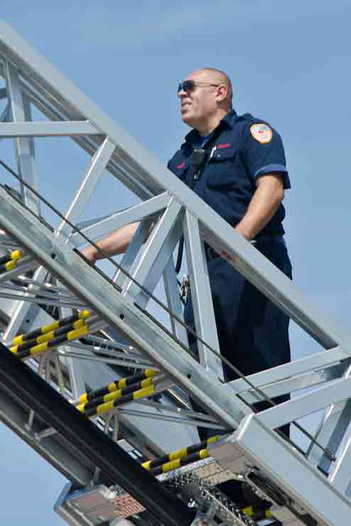 This page and the other pages in this series are the successors to the series of web-page about the Camden Fire Department that began with the page Camden Fire Department: The Fires of the Summer of 2011. On this and other pages in the series you will find pictures and information regarding different events and aspects of the fire service in Camden, New Jersey. I spent some time at Liberty Station with the men of Ladder 2 and Rescue 1… who have been jumping in and out of the two pieces of equipment for far too long… the new Ladder 2 truck had just been placed in service and the men were still training on it. No runs, but a trip to Pathmark to pick up groceries for the day's lunch and dinner, and a stop at the PATCO High Speed Line station to check out an excavation so it would be known what the conditions were in case of a trench collapse. Interesting stuff! The new ladder goes up, if memory serves, one hundred and one feet. After watching a couple of the fellows make the climb, I was asked if I wanted to take a crack at it, and yours truly went about two-thirds of the way up, and snapped a few pictures. As with the web page covering other Camden Fire Department events, if you can identify anyone that I've missed, please comment at the bottom of the page. (I'm terrible at at names and faces). October 30, 2012 |