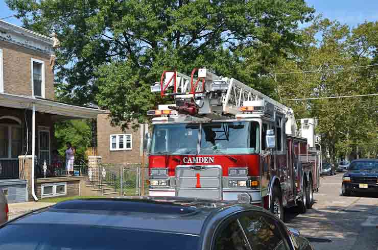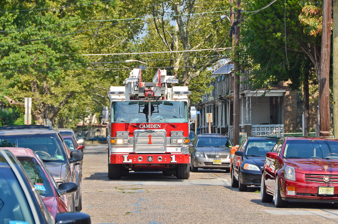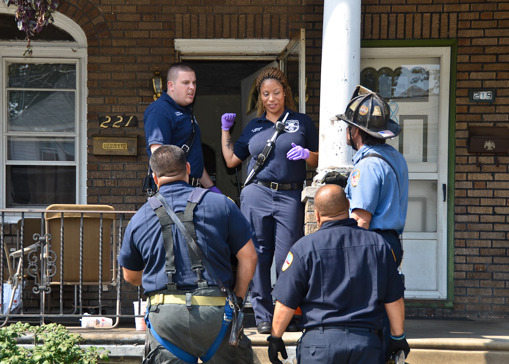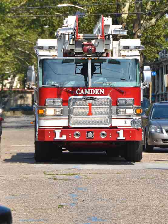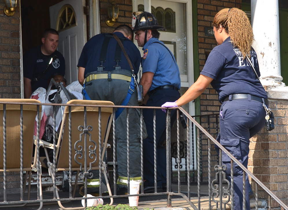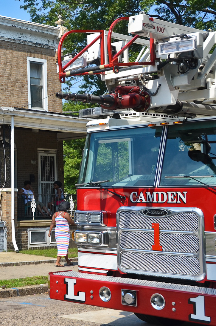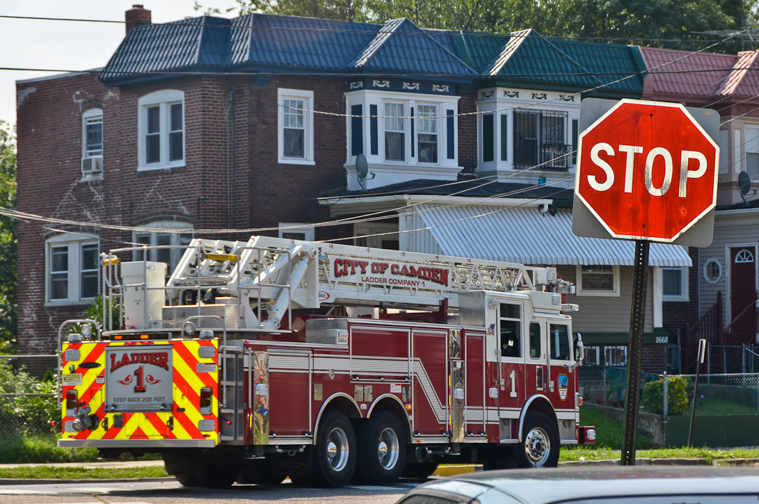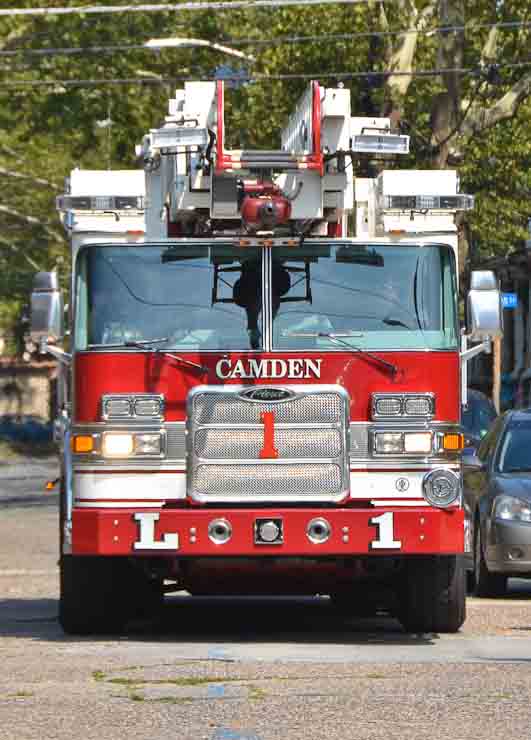This page and the other pages in this series are the successors to the series of web-page about the Camden Fire Department that began with the page Camden Fire Department: The Fires of the Summer of 2011. On this and other pages in the series you will find pictures and information regarding different events and haspects of the fire service in Camden, New Jersey. The Camden Fire Department is often called on to assist EMS personnel in extricating patients from homes and into the ambulance for transport. On August 23, 2012 a typical EMS assist too place in the 200 block of Eutaw Avenue in East Camden. with Ladder Company 1 providing the service. As with the web page covering other Camden Fire Department events, if you can identify anyone that I've missed, please comment at the bottom of the page. (I'm terrible at at names and faces). October 31, 2012 |