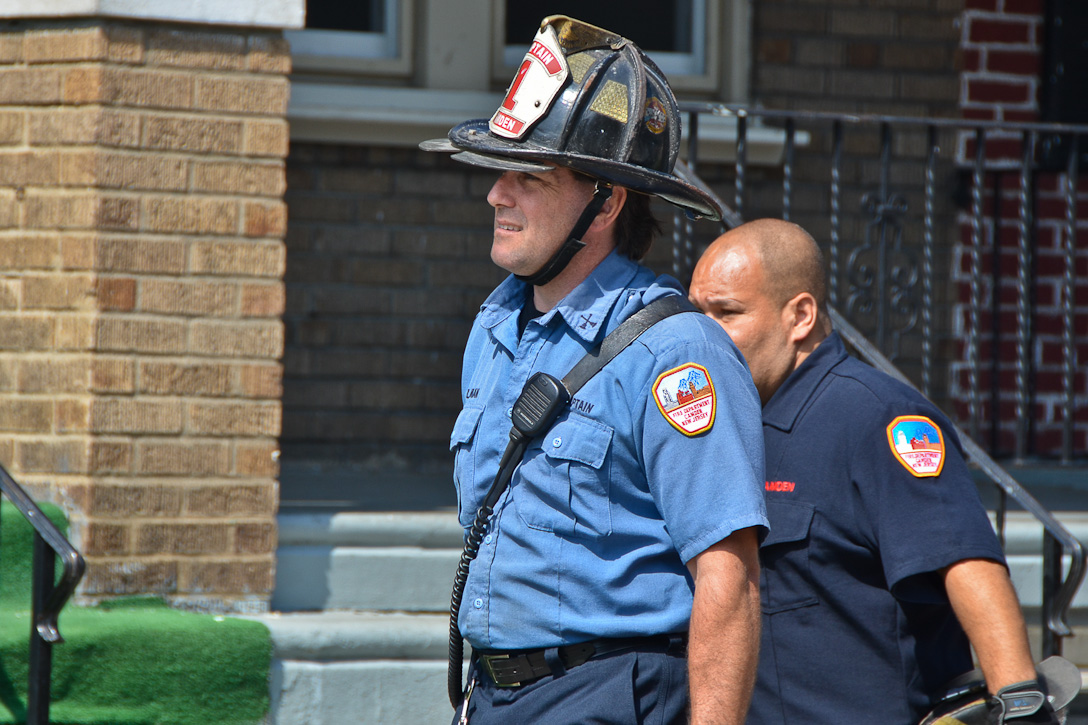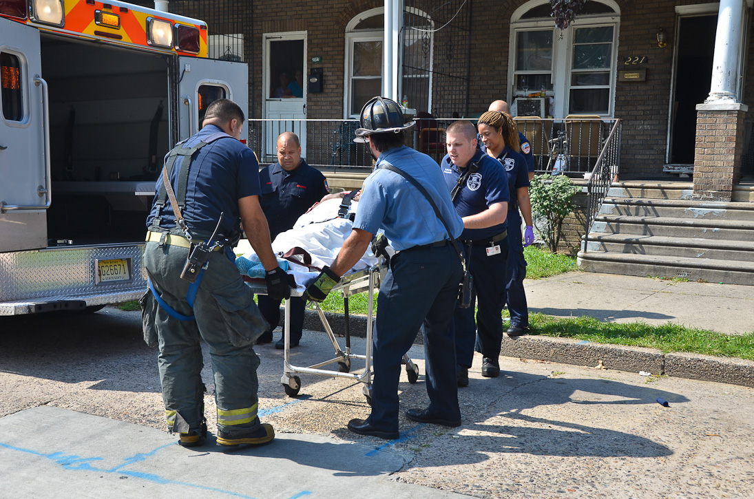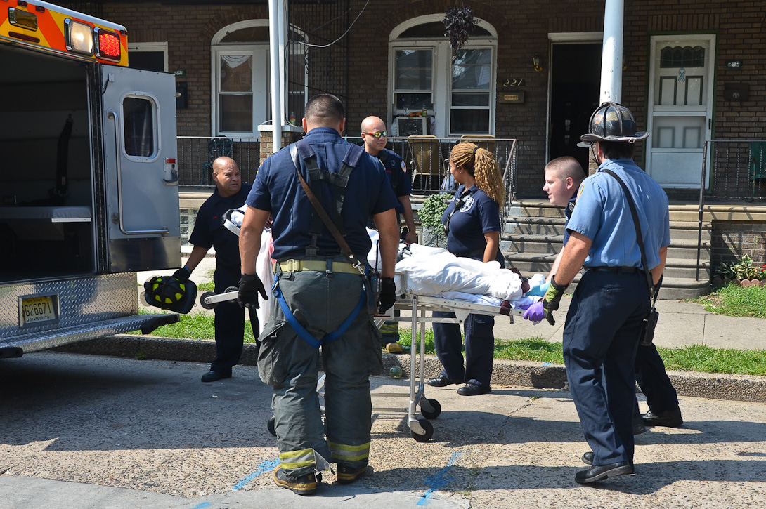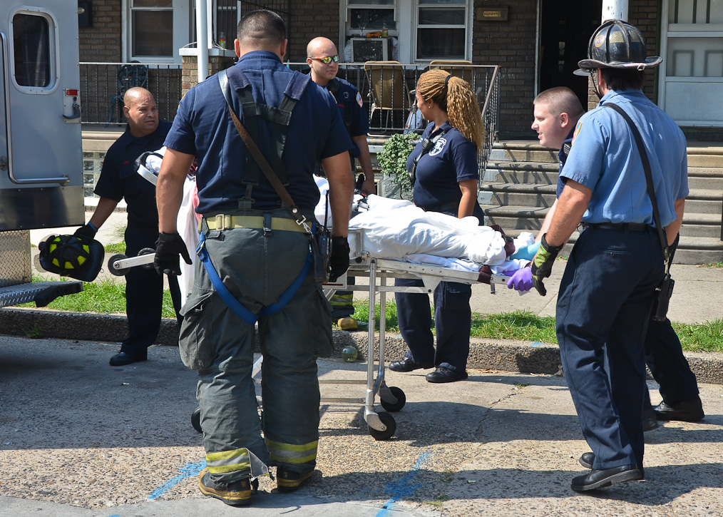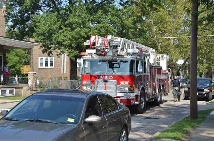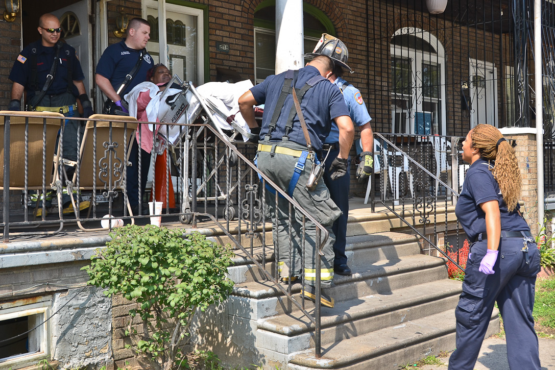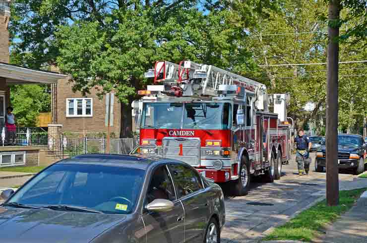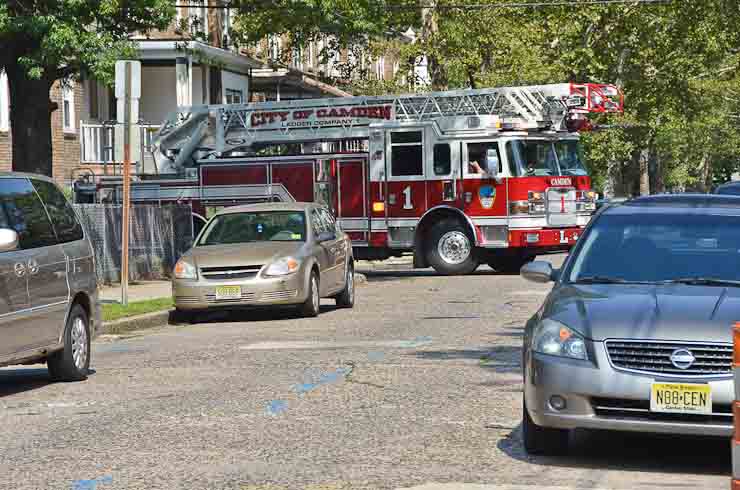 This page and the other pages in this series are the successors to the series of web-page about the Camden Fire Department that began with the page Camden Fire Department: The Fires of the Summer of 2011. On this and other pages in the series you will find pictures and information regarding different events and haspects of the fire service in Camden, New Jersey. The Camden Fire Department is often called on to assist EMS personnel in extricating patients from homes and into the ambulance for transport. On August 23, 2012 a typical EMS assist too place in the 200 block of Eutaw Avenue in East Camden. with Ladder Company 1 providing the service. As with the web page covering other Camden Fire Department events, if you can identify anyone that I've missed, please comment at the bottom of the page. (I'm terrible at at names and faces). October 31, 2012 |