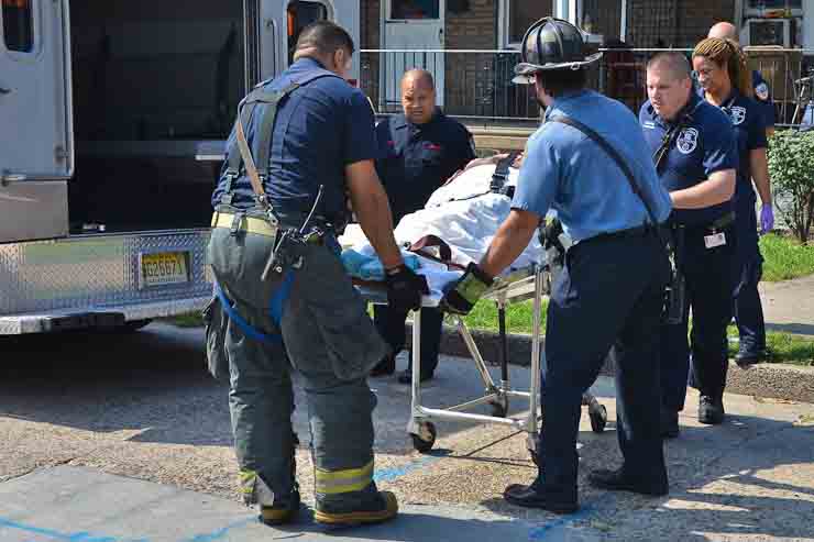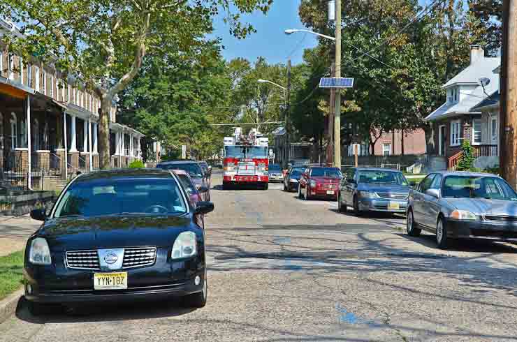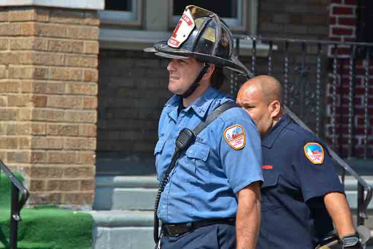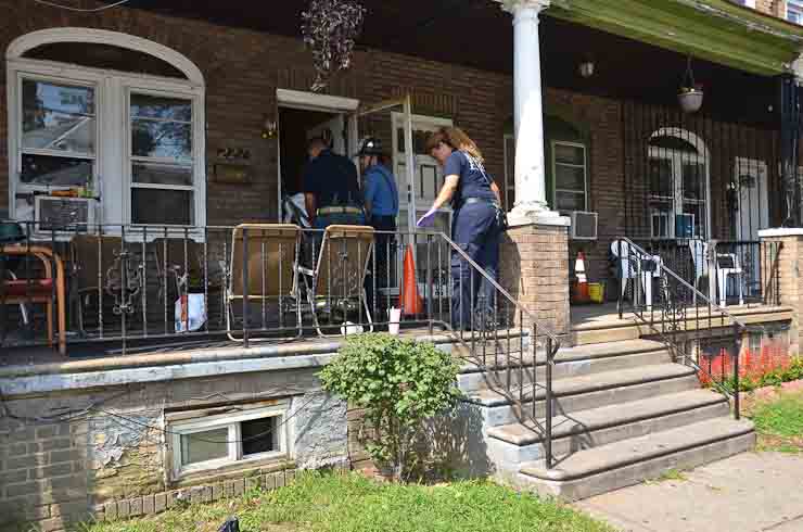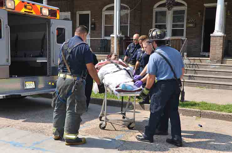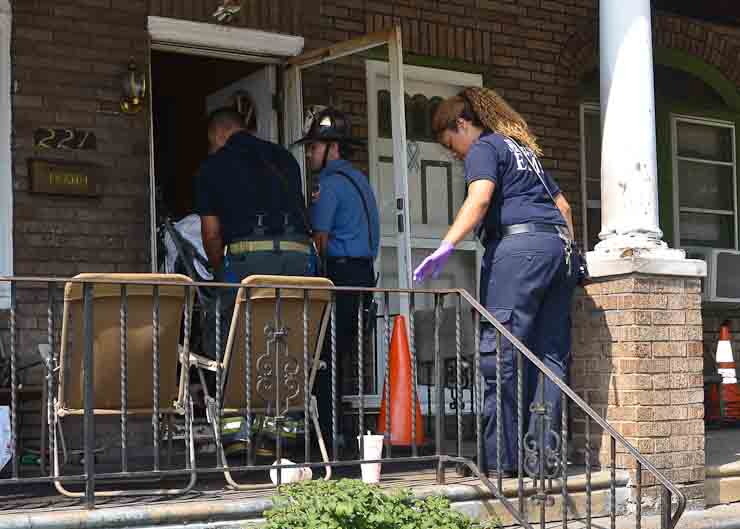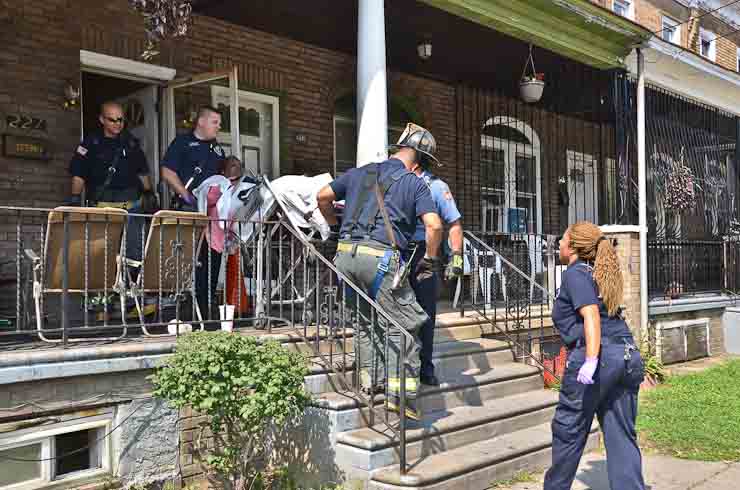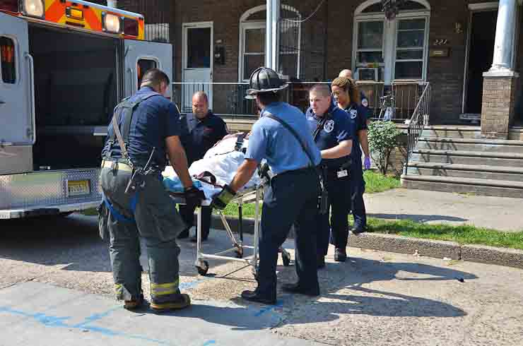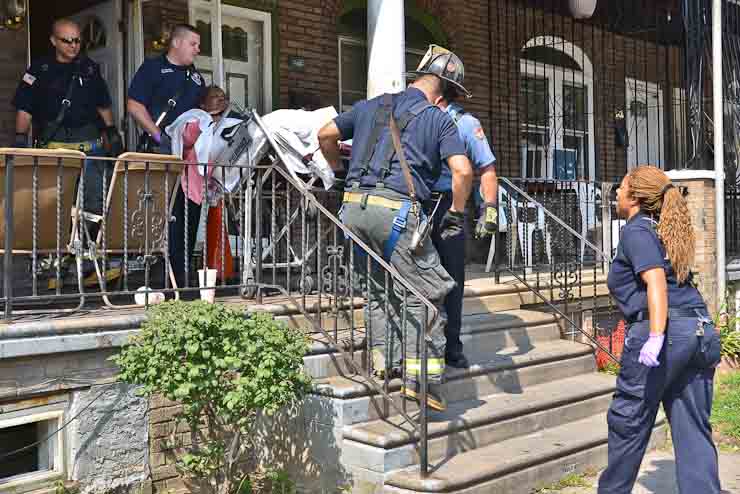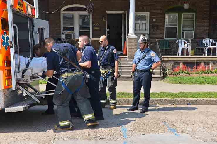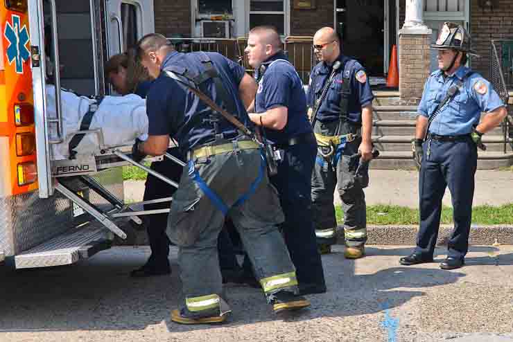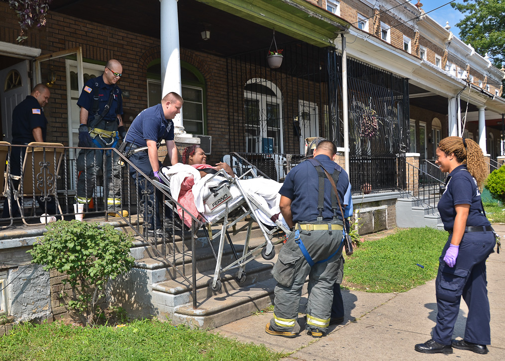 This page and the other pages in this series are the successors to the series of web-page about the Camden Fire Department that began with the page Camden Fire Department: The Fires of the Summer of 2011. On this and other pages in the series you will find pictures and information regarding different events and haspects of the fire service in Camden, New Jersey. The Camden Fire Department is often called on to assist EMS personnel in extricating patients from homes and into the ambulance for transport. On August 23, 2012 a typical EMS assist too place in the 200 block of Eutaw Avenue in East Camden. with Ladder Company 1 providing the service. As with the web page covering other Camden Fire Department events, if you can identify anyone that I've missed, please comment at the bottom of the page. (I'm terrible at at names and faces). October 31, 2012 |