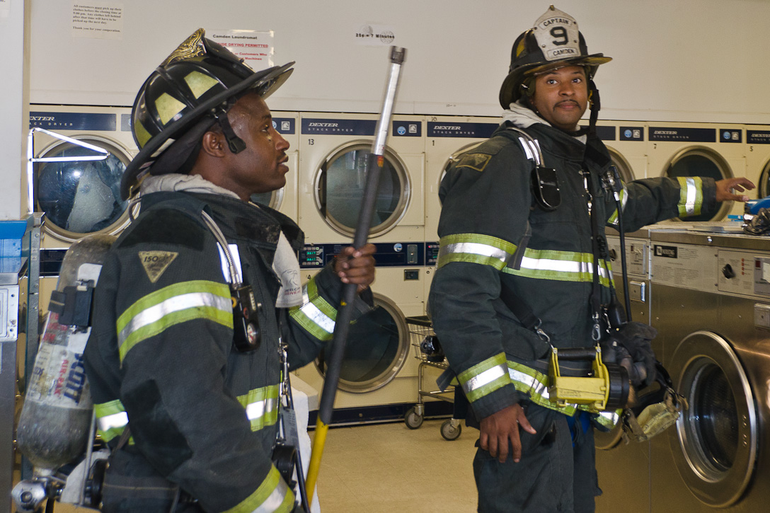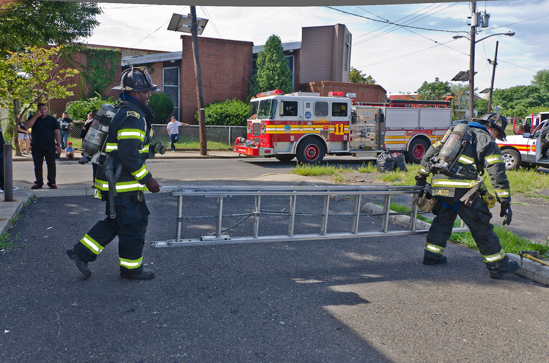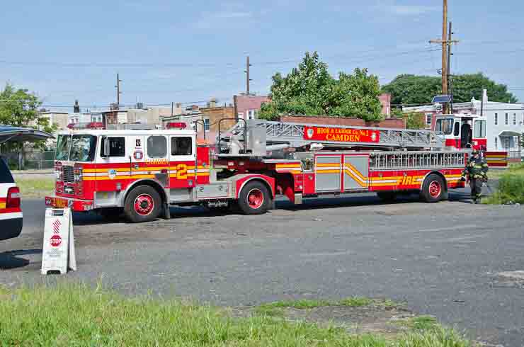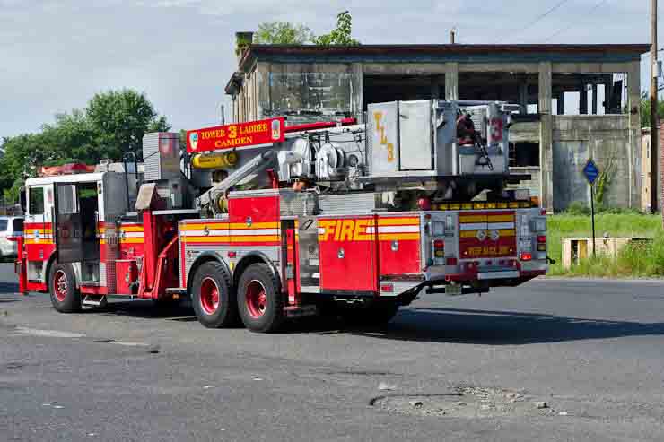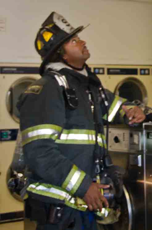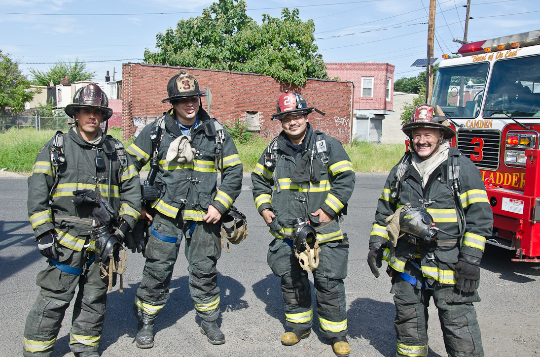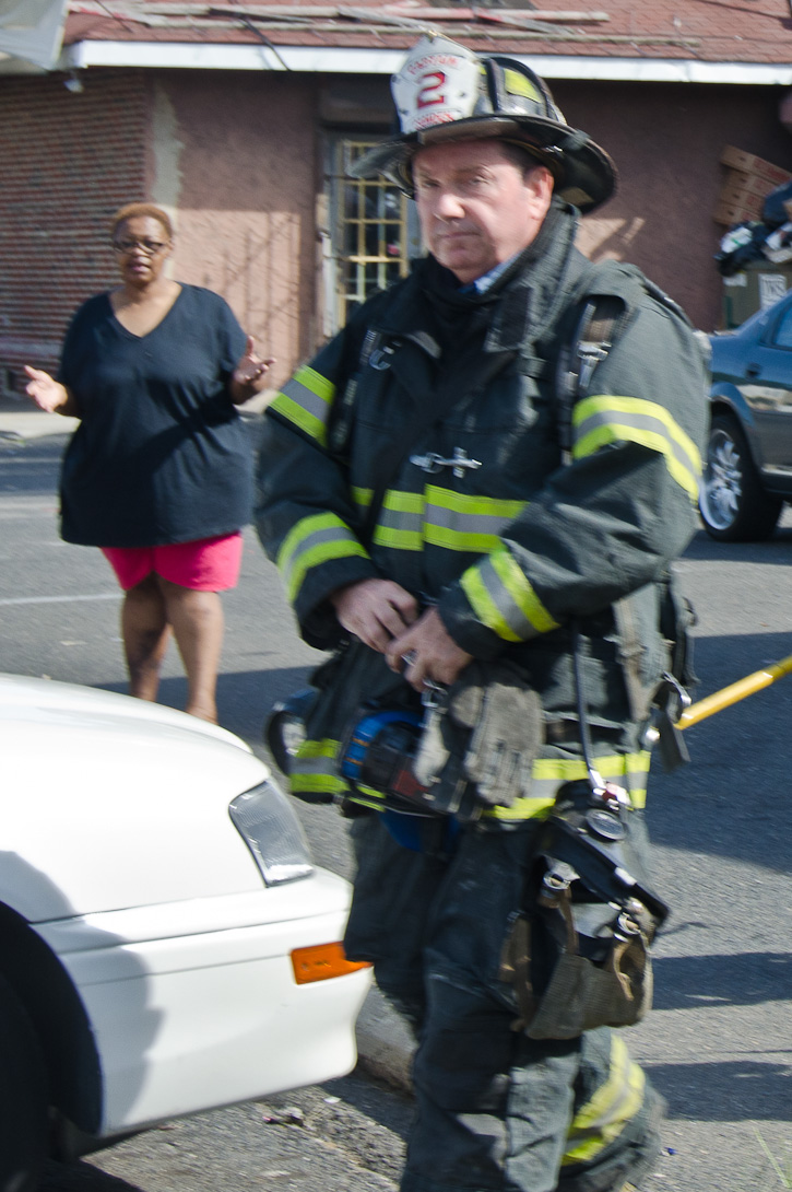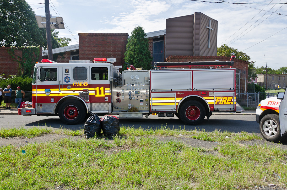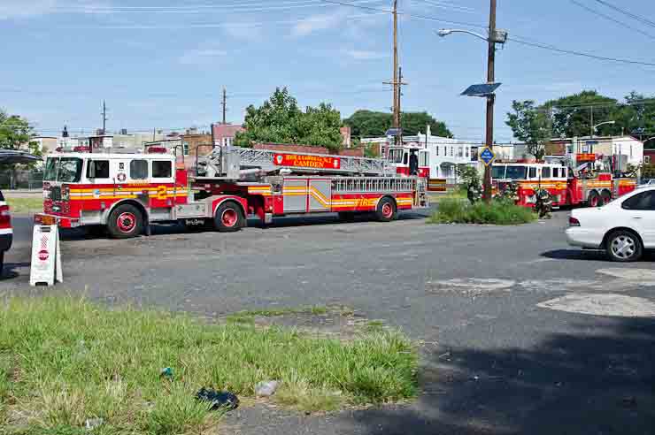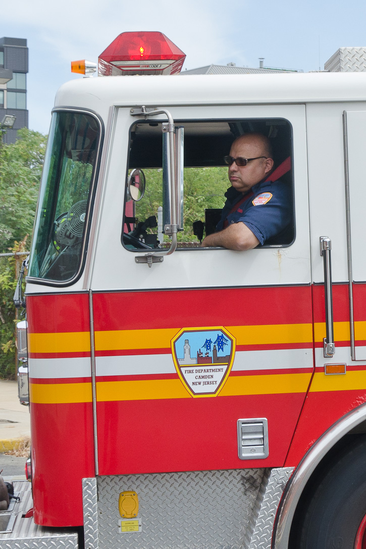 This page and the other pages in this series are the successors to the series of web-page about the Camden Fire Department that began with the page Camden Fire Department: The Fires of the Summer of 2011. On this and other pages in the series you will find pictures and information regarding different events and haspects of the fire service in Camden, New Jersey. The Camden Fire Department was called to the laundromat at South 7th Street and Division Street as smoke was observed in the ceiling. There was an electrical problem, and happily enough no fire, no damage and no injuries to anyone. Later that day I took a ride with Engine 1 out to the Canterbury Apartment off Morgan Boulevard. This run also turned out negative. As with the web page covering other Camden Fire Department events, if you can identify anyone that I've missed, please comment at the bottom of the page. (I'm terrible at at names and faces). October 31, 2012 |