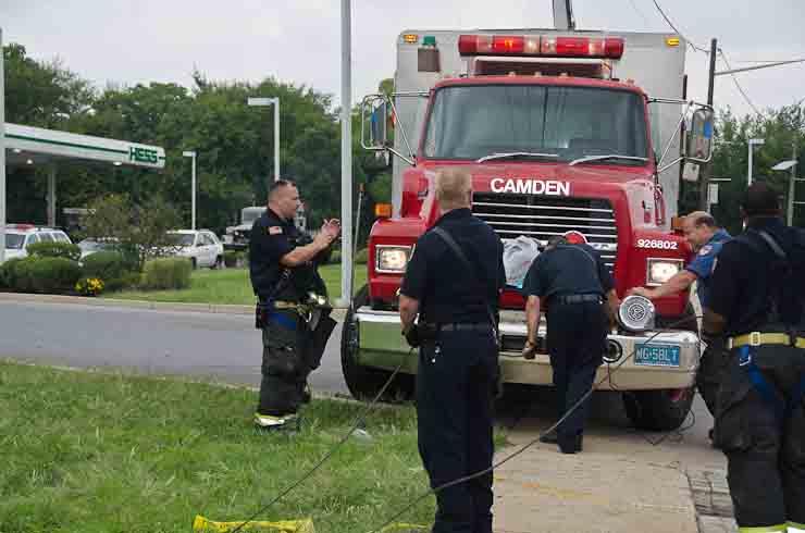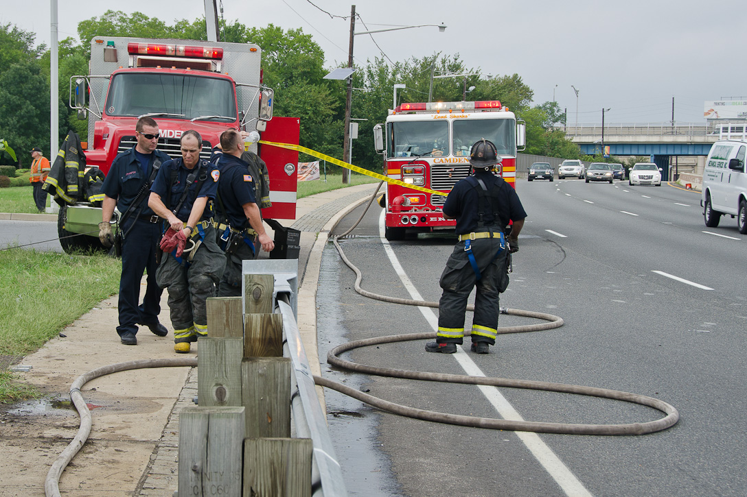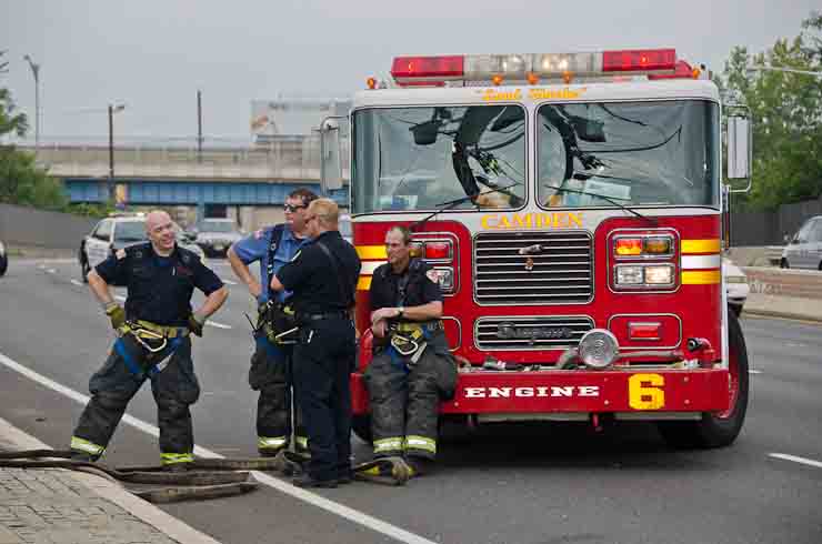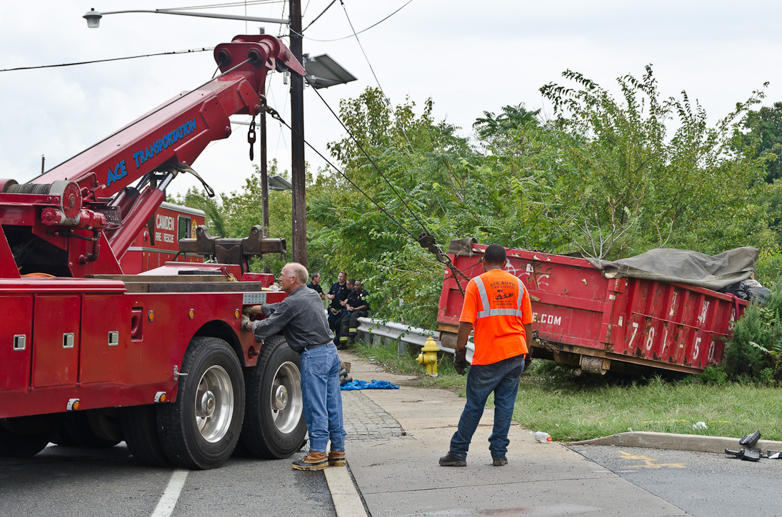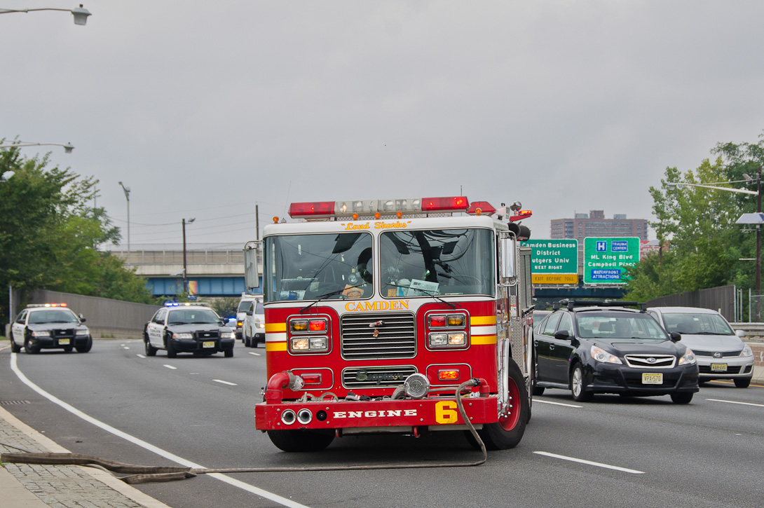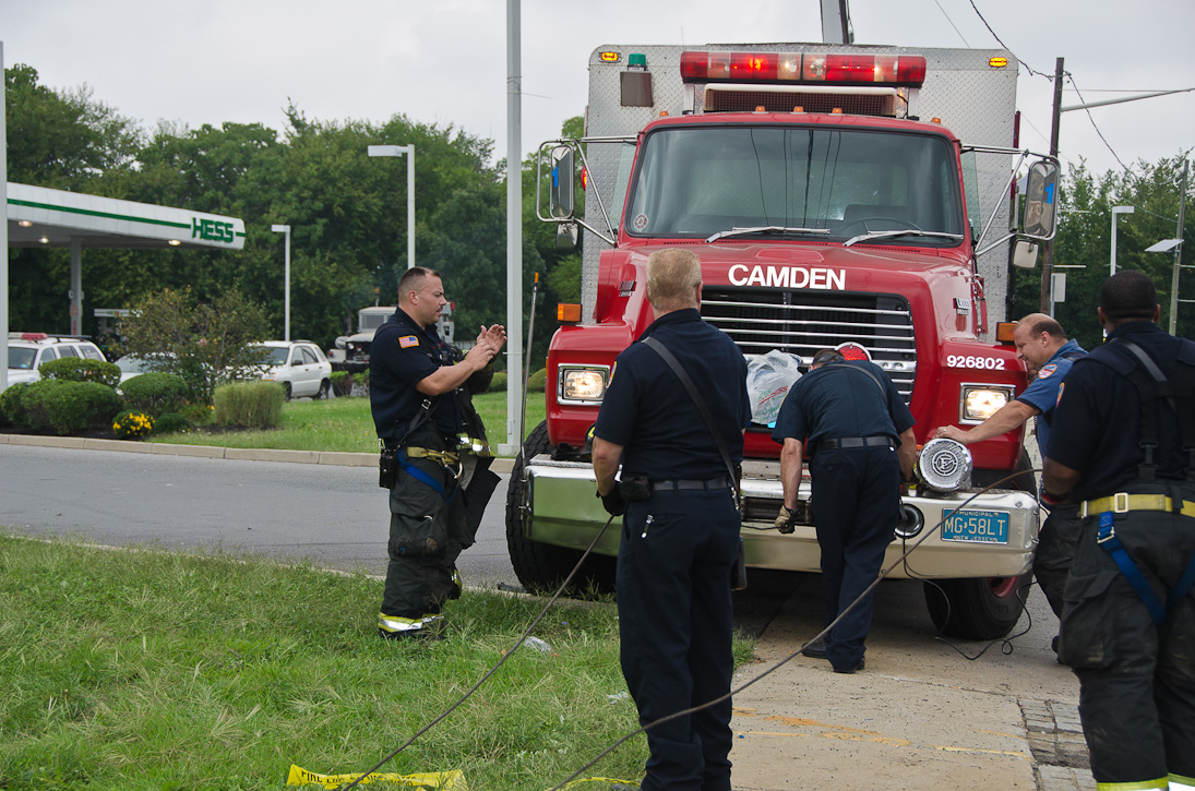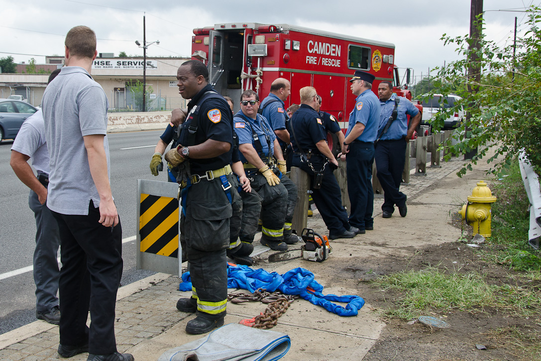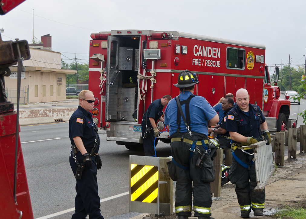 This page and the other pages in this series are the successors to the series of web-page about the Camden Fire Department that began with the page Camden Fire Department: The Fires of the Summer of 2011. On this and other pages in the series you will find pictures and information regarding different events and aspects of the fire service in Camden, New Jersey. I was in Camden on the morning of Tuesday, September 4, 2012 when I spotted Engine 10 on Kaighn Avenue east of Broadway, returning to their quarters after an investigation nearby. I pulled over and had taken a couple of photos when a call came over the radio dispatching Rescue 1 to the Admiral Wilson Boulevard. Off I went! At approximately 10:00 AM a tractor trailer transporting a dumpster, traveling eastbound on the Admiral Wilson Boulevard, was involved in a motor vehicle accident. From what I gathered, the driver of the truck swerved to avoid a passenger car at the Hess gas station, hit the car, lost control, and drove off the highway into the Cooper River. No one was hurt, but getting the truck out of the river was quite an event. As with the web page covering other Camden Fire Department events, if you can identify anyone that I've missed, please comment at the bottom of the page. (I'm terrible at at names and faces). October 31, 2012 |