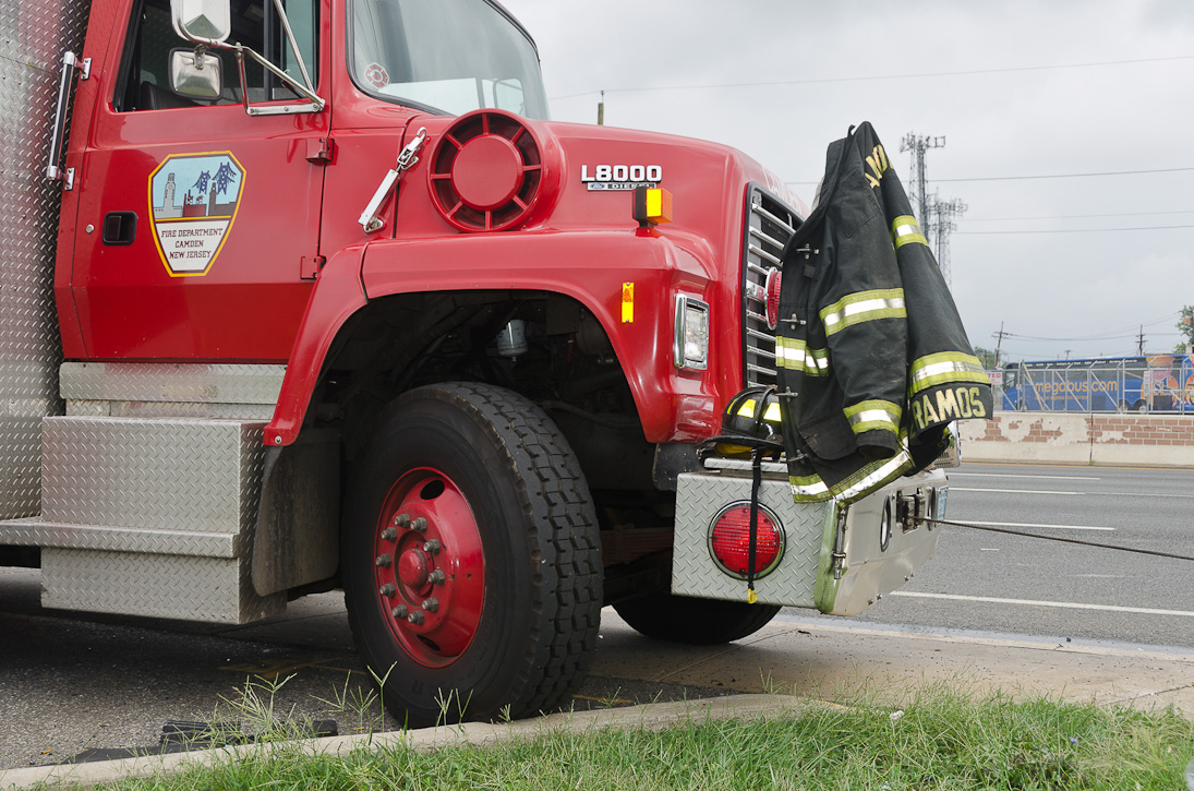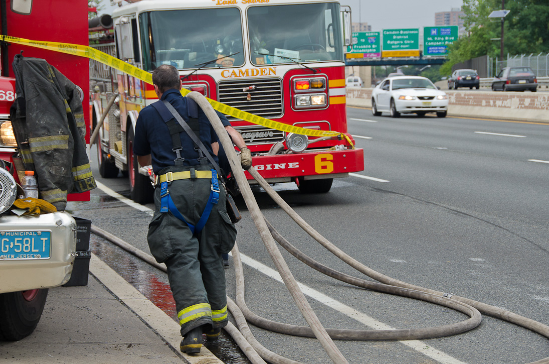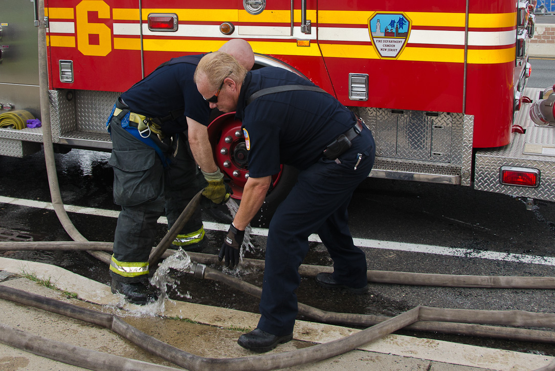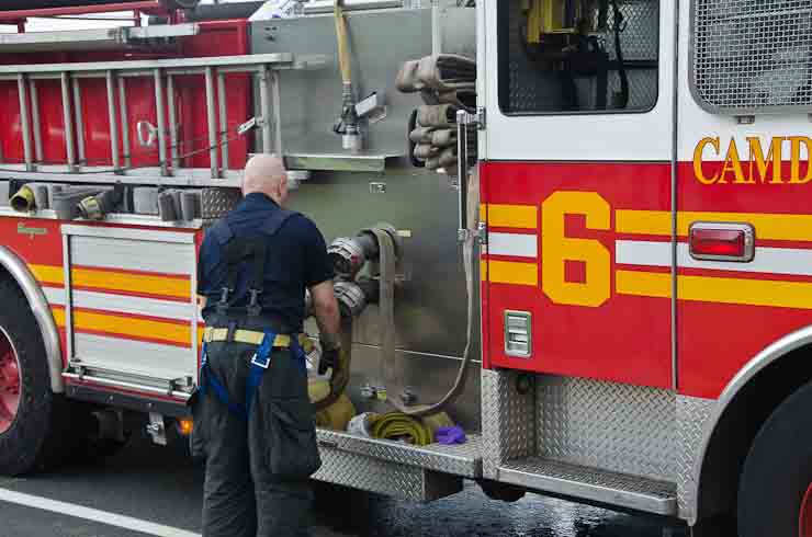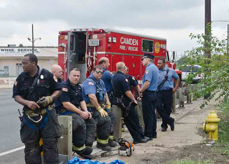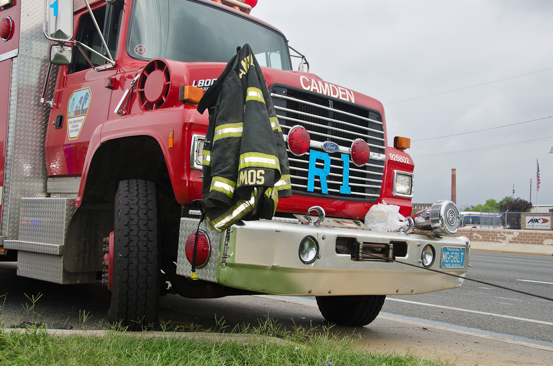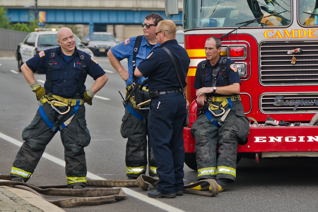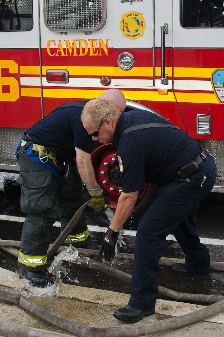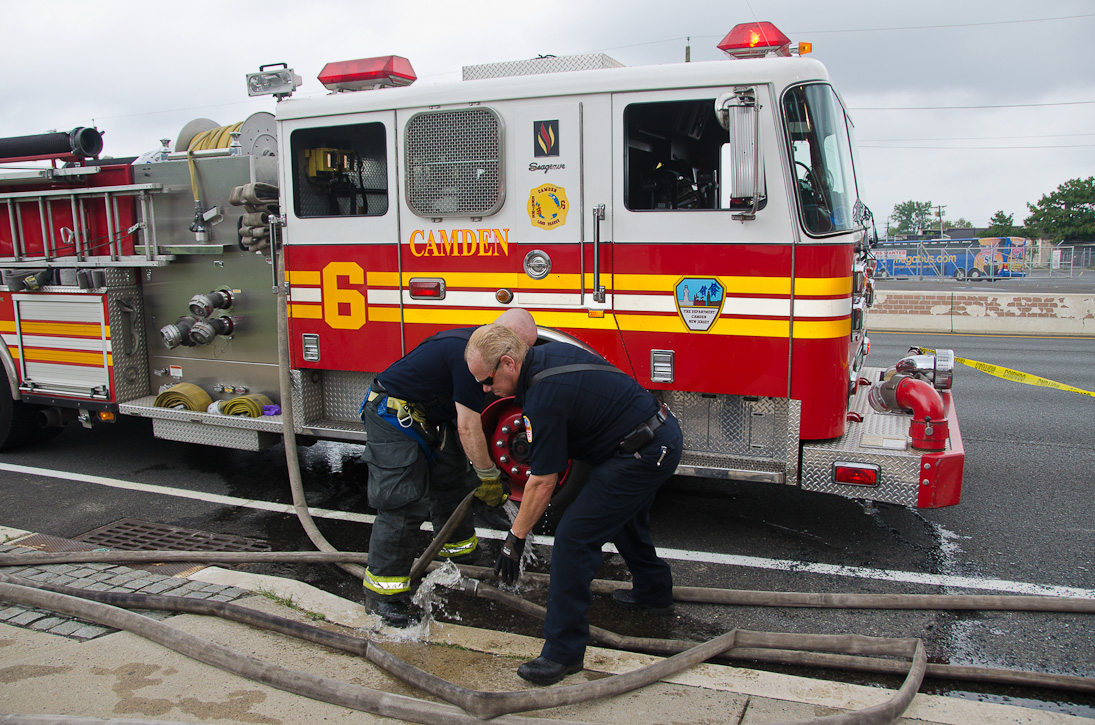 This page and the other pages in this series are the successors to the series of web-page about the Camden Fire Department that began with the page Camden Fire Department: The Fires of the Summer of 2011. On this and other pages in the series you will find pictures and information regarding different events and aspects of the fire service in Camden, New Jersey. I was in Camden on the morning of Tuesday, September 4, 2012 when I spotted Engine 10 on Kaighn Avenue east of Broadway, returning to their quarters after an investigation nearby. I pulled over and had taken a couple of photos when a call came over the radio dispatching Rescue 1 to the Admiral Wilson Boulevard. Off I went! At approximately 10:00 AM a tractor trailer transporting a dumpster, traveling eastbound on the Admiral Wilson Boulevard, was involved in a motor vehicle accident. From what I gathered, the driver of the truck swerved to avoid a passenger car at the Hess gas station, hit the car, lost control, and drove off the highway into the Cooper River. No one was hurt, but getting the truck out of the river was quite an event. As with the web page covering other Camden Fire Department events, if you can identify anyone that I've missed, please comment at the bottom of the page. (I'm terrible at at names and faces). October 31, 2012 |
