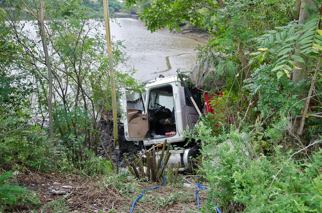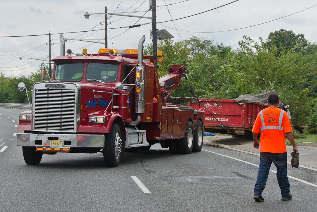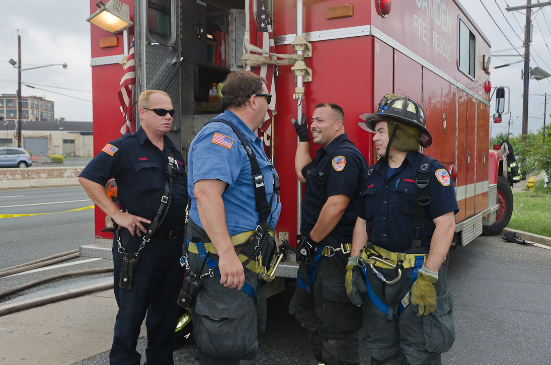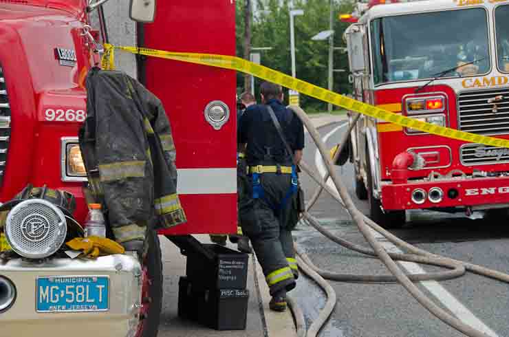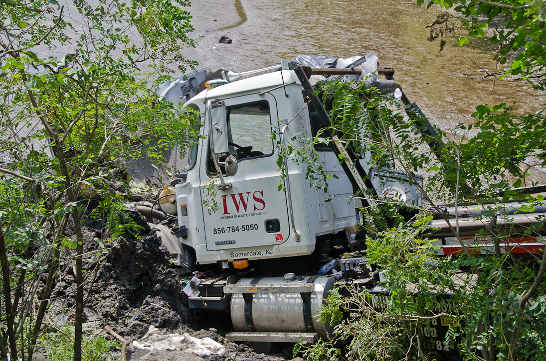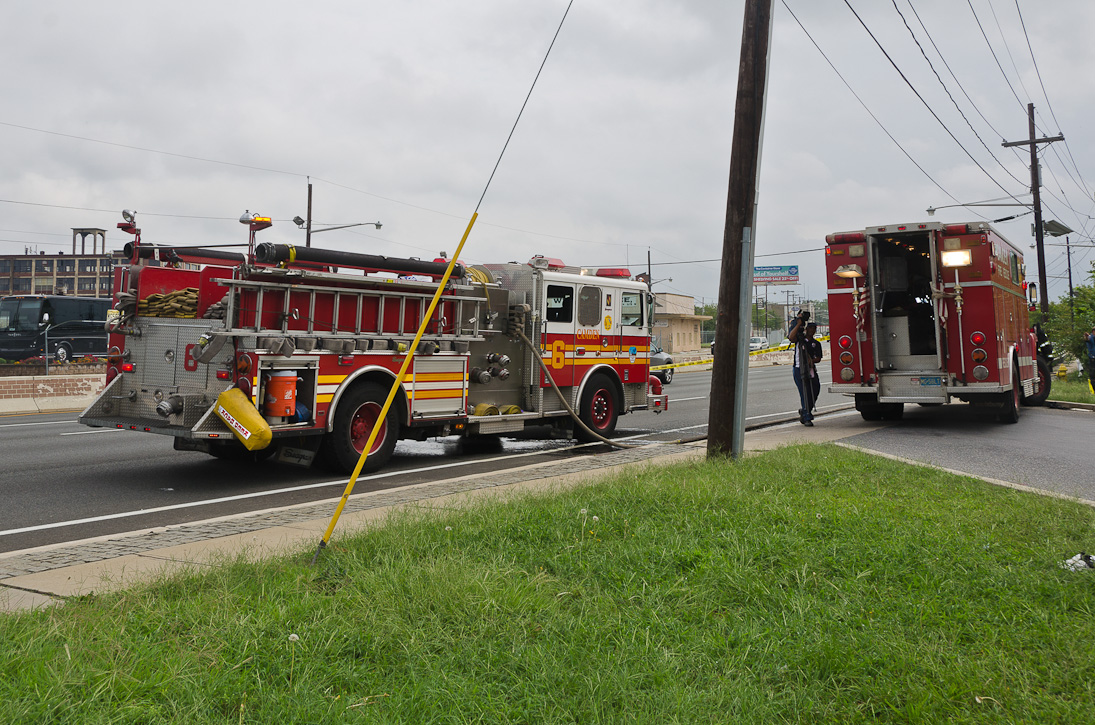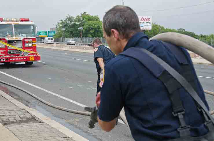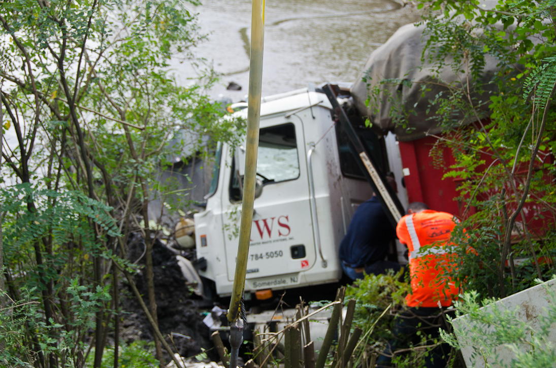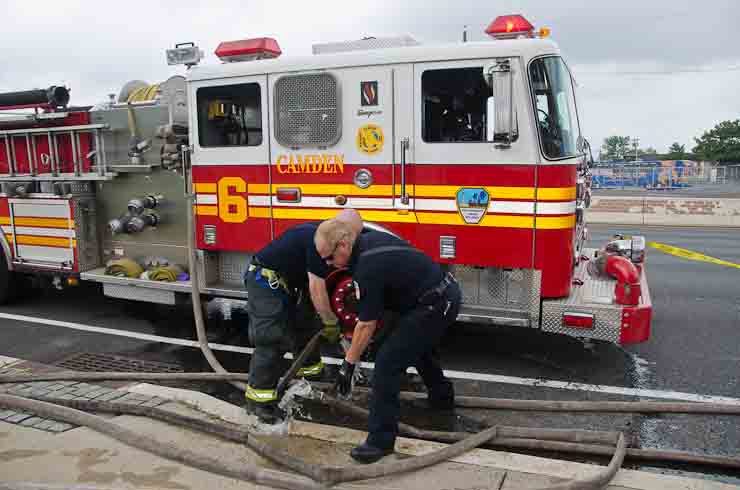 This page and the other pages in this series are the successors to the series of web-page about the Camden Fire Department that began with the page Camden Fire Department: The Fires of the Summer of 2011. On this and other pages in the series you will find pictures and information regarding different events and aspects of the fire service in Camden, New Jersey. I was in Camden on the morning of Tuesday, September 4, 2012 when I spotted Engine 10 on Kaighn Avenue east of Broadway, returning to their quarters after an investigation nearby. I pulled over and had taken a couple of photos when a call came over the radio dispatching Rescue 1 to the Admiral Wilson Boulevard. Off I went! At approximately 10:00 AM a tractor trailer transporting a dumpster, traveling eastbound on the Admiral Wilson Boulevard, was involved in a motor vehicle accident. From what I gathered, the driver of the truck swerved to avoid a passenger car at the Hess gas station, hit the car, lost control, and drove off the highway into the Cooper River. No one was hurt, but getting the truck out of the river was quite an event. As with the web page covering other Camden Fire Department events, if you can identify anyone that I've missed, please comment at the bottom of the page. (I'm terrible at at names and faces). October 31, 2012 |