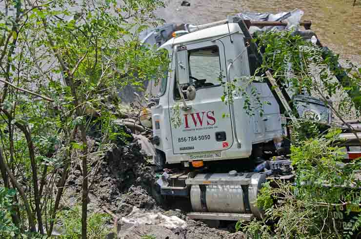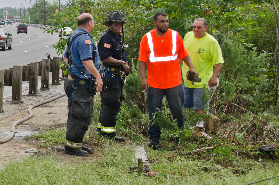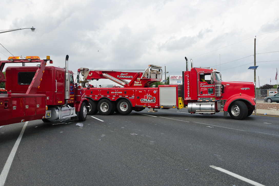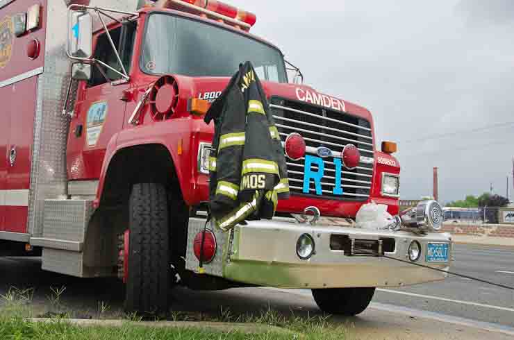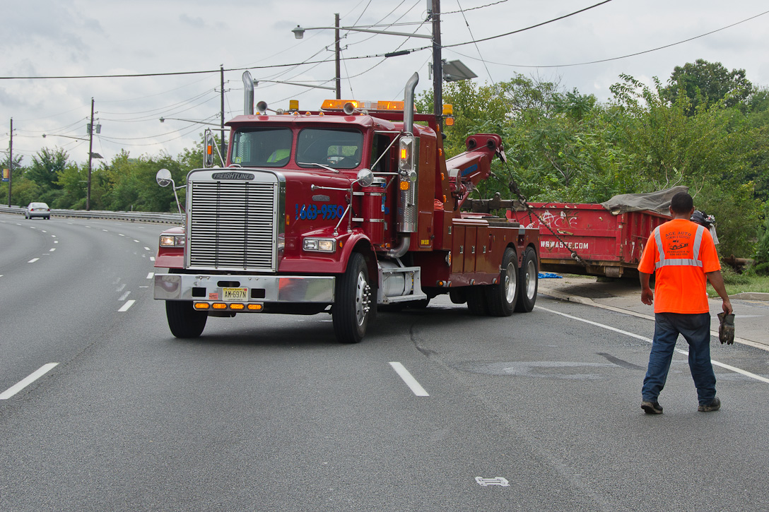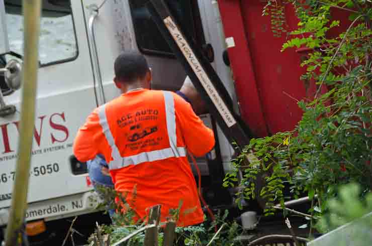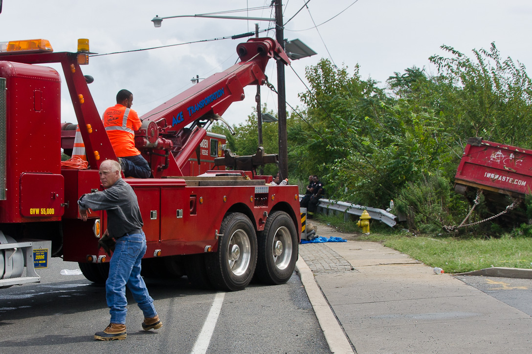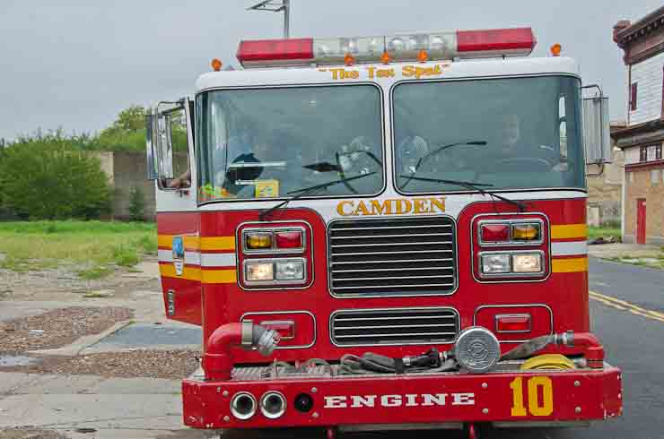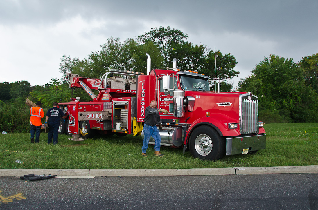 This page and the other pages in this series are the successors to the series of web-page about the Camden Fire Department that began with the page Camden Fire Department: The Fires of the Summer of 2011. On this and other pages in the series you will find pictures and information regarding different events and aspects of the fire service in Camden, New Jersey. I was in Camden on the morning of Tuesday, September 4, 2012 when I spotted Engine 10 on Kaighn Avenue east of Broadway, returning to their quarters after an investigation nearby. I pulled over and had taken a couple of photos when a call came over the radio dispatching Rescue 1 to the Admiral Wilson Boulevard. Off I went! At approximately 10:00 AM a tractor trailer transporting a dumpster, traveling eastbound on the Admiral Wilson Boulevard, was involved in a motor vehicle accident. From what I gathered, the driver of the truck swerved to avoid a passenger car at the Hess gas station, hit the car, lost control, and drove off the highway into the Cooper River. No one was hurt, but getting the truck out of the river was quite an event. As with the web page covering other Camden Fire Department events, if you can identify anyone that I've missed, please comment at the bottom of the page. (I'm terrible at at names and faces). October 31, 2012 |