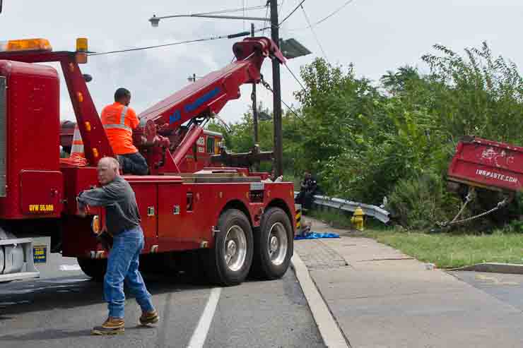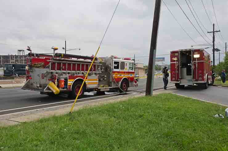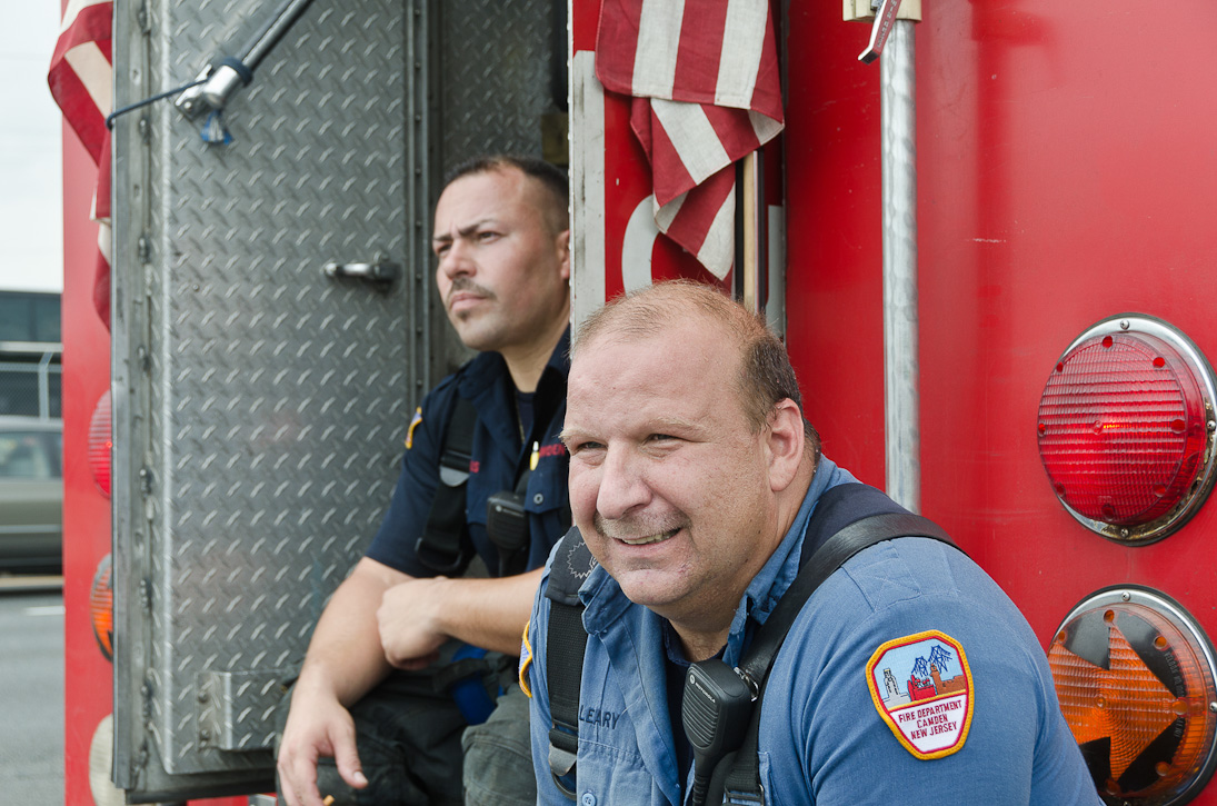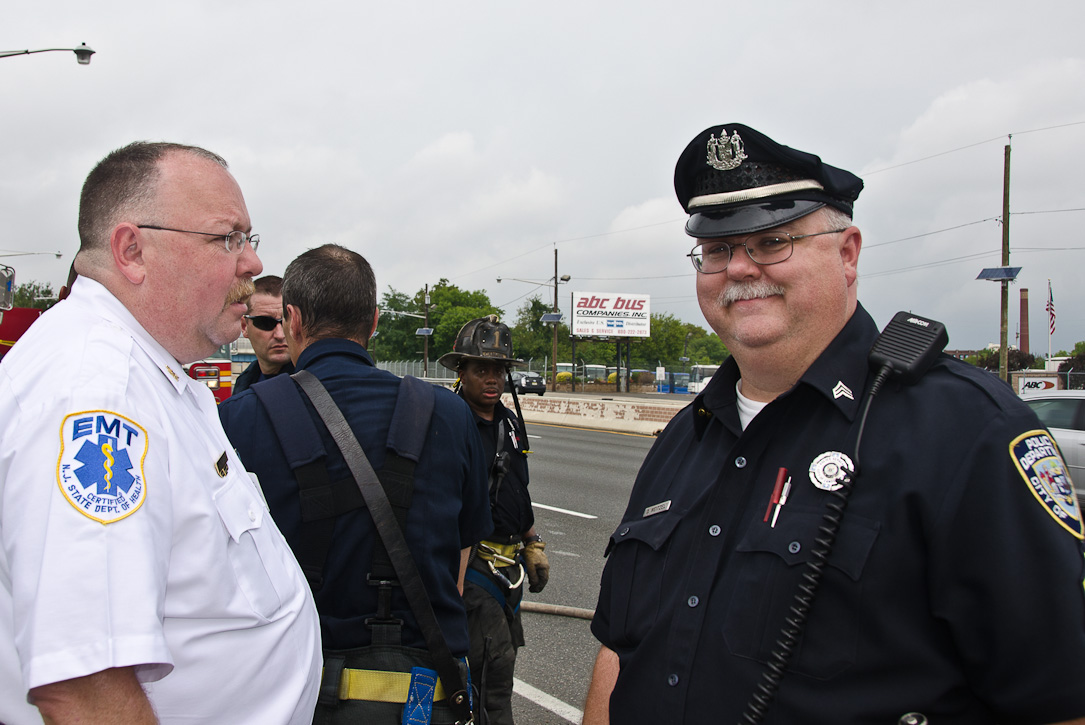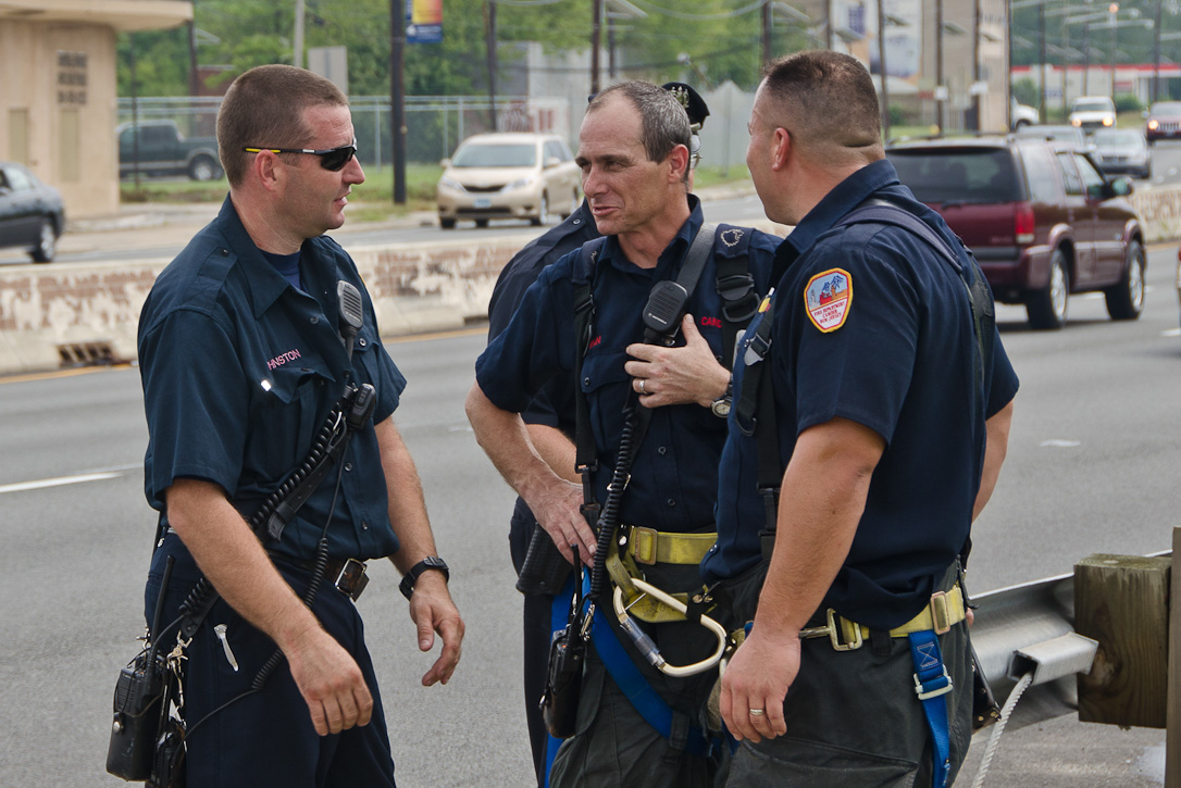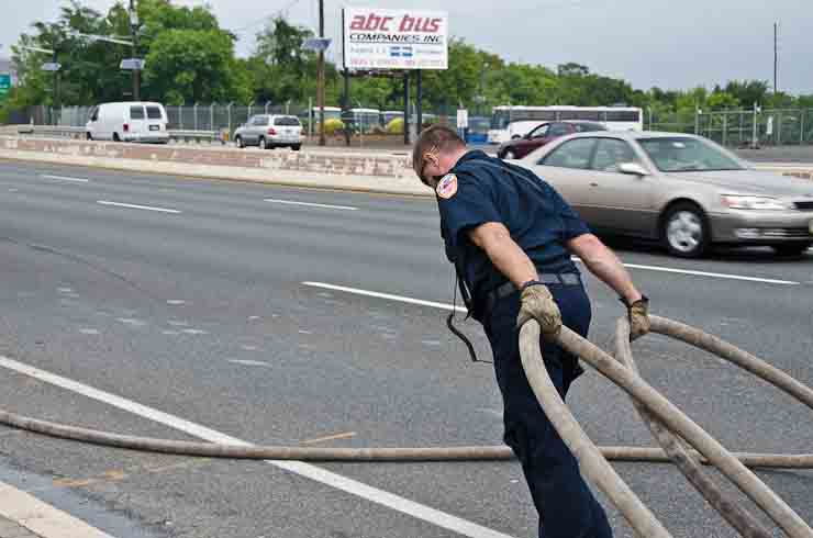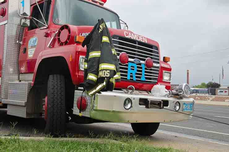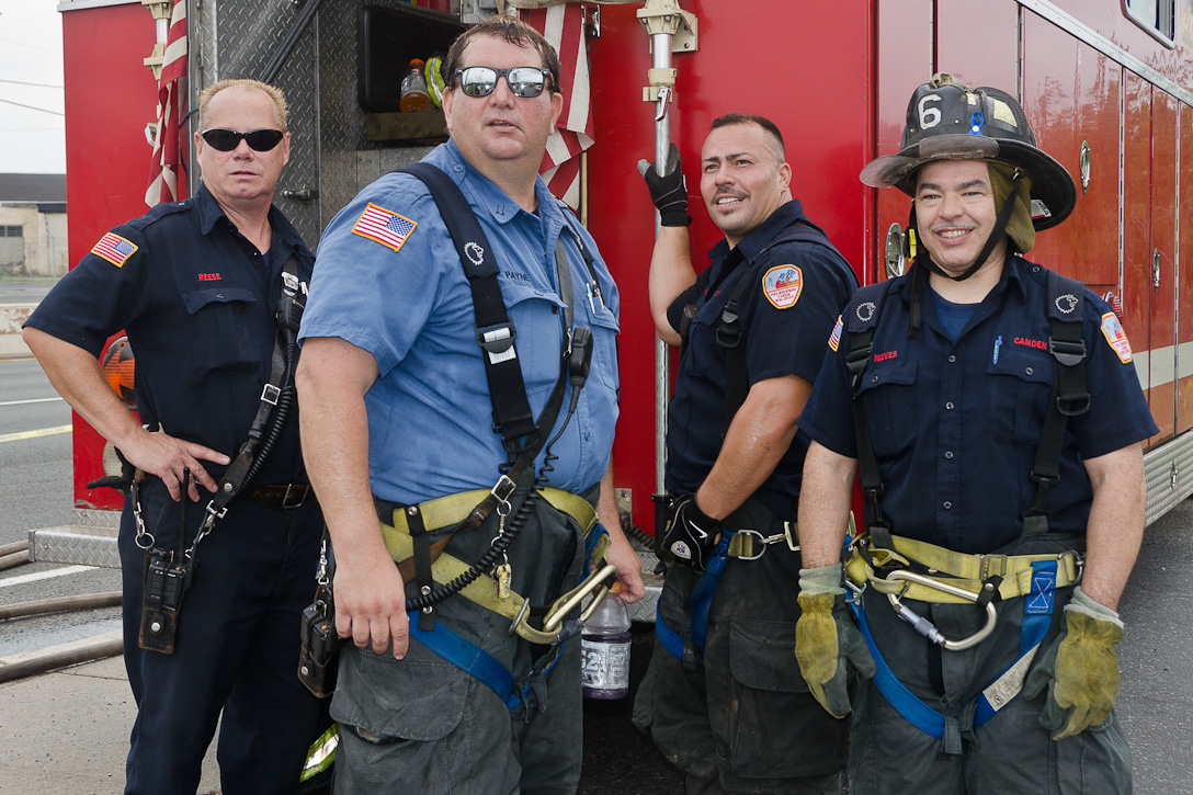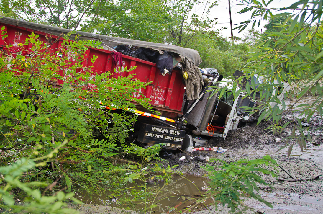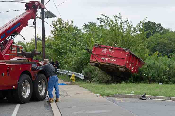 This page and the other pages in this series are the successors to the series of web-page about the Camden Fire Department that began with the page Camden Fire Department: The Fires of the Summer of 2011. On this and other pages in the series you will find pictures and information regarding different events and aspects of the fire service in Camden, New Jersey. I was in Camden on the morning of Tuesday, September 4, 2012 when I spotted Engine 10 on Kaighn Avenue east of Broadway, returning to their quarters after an investigation nearby. I pulled over and had taken a couple of photos when a call came over the radio dispatching Rescue 1 to the Admiral Wilson Boulevard. Off I went! At approximately 10:00 AM a tractor trailer transporting a dumpster, traveling eastbound on the Admiral Wilson Boulevard, was involved in a motor vehicle accident. From what I gathered, the driver of the truck swerved to avoid a passenger car at the Hess gas station, hit the car, lost control, and drove off the highway into the Cooper River. No one was hurt, but getting the truck out of the river was quite an event. As with the web page covering other Camden Fire Department events, if you can identify anyone that I've missed, please comment at the bottom of the page. (I'm terrible at at names and faces). October 31, 2012 |