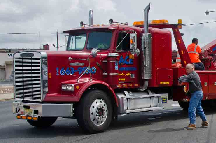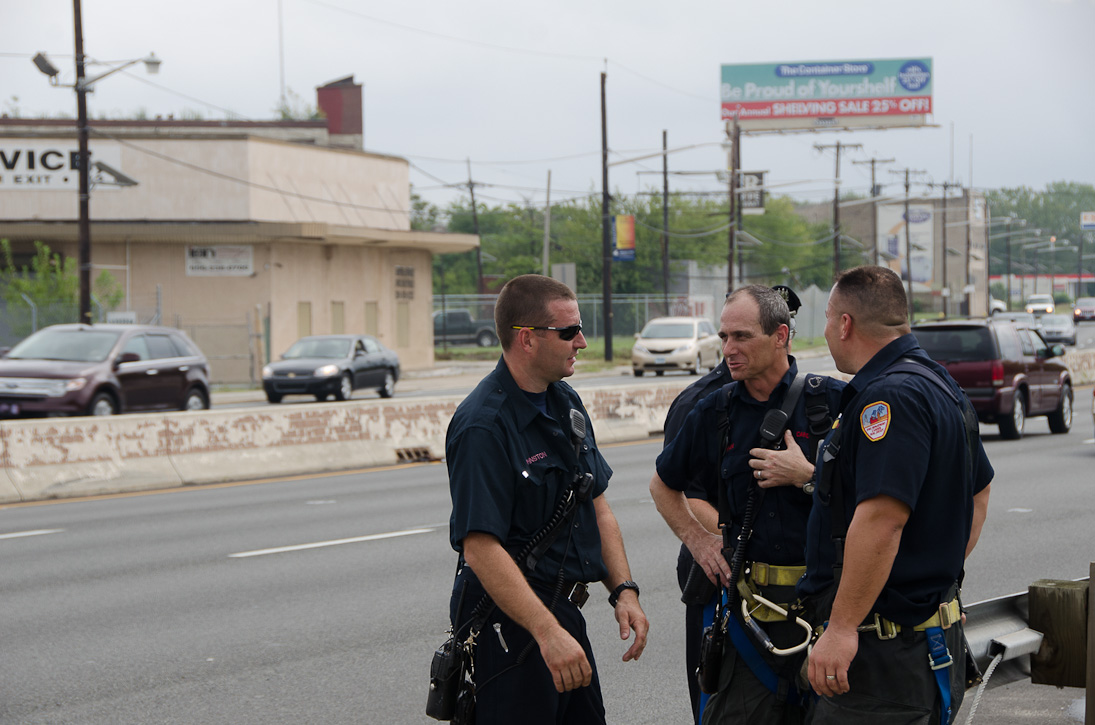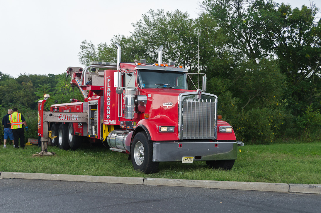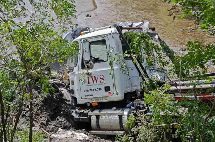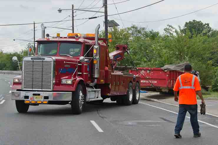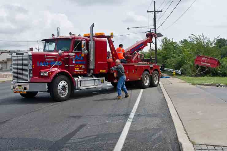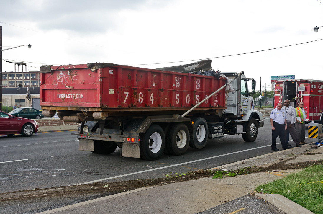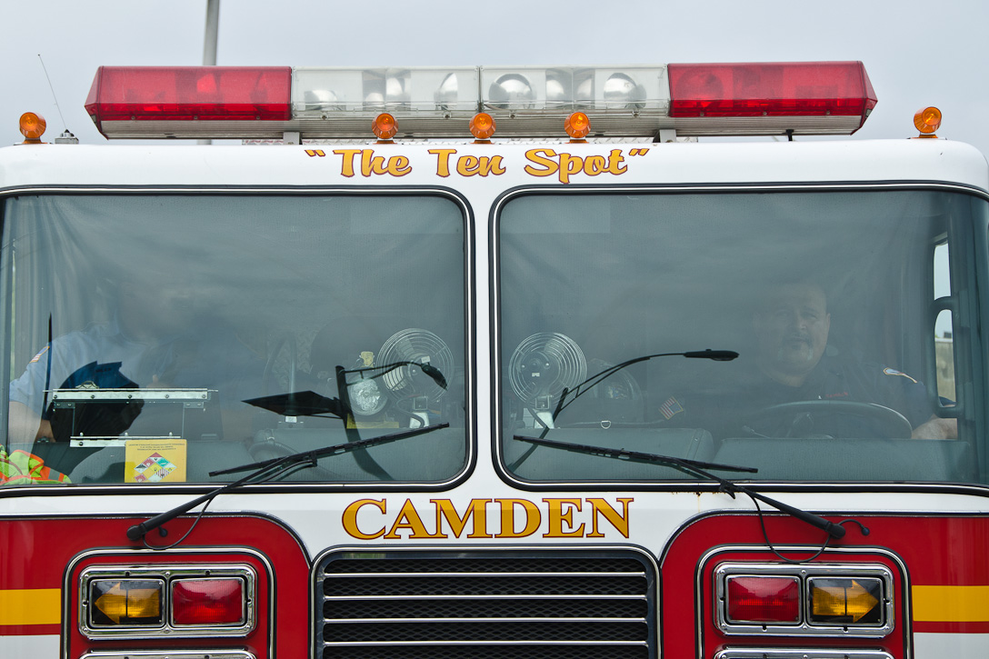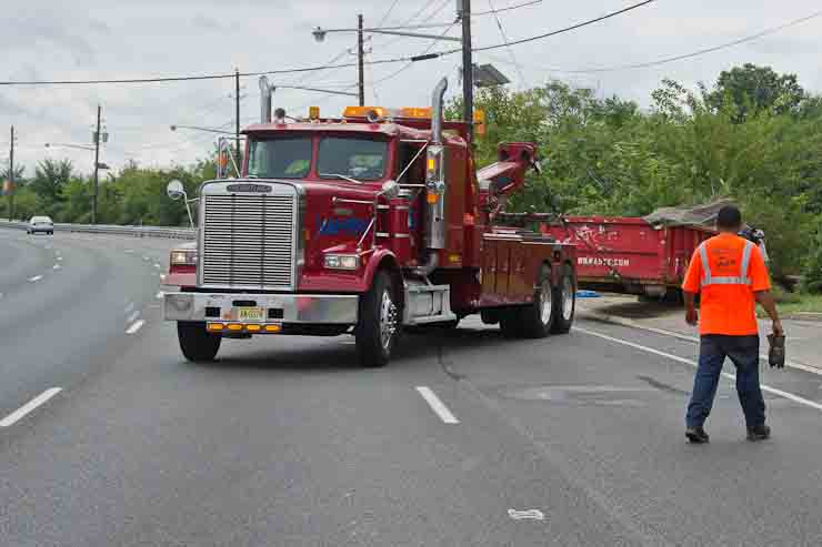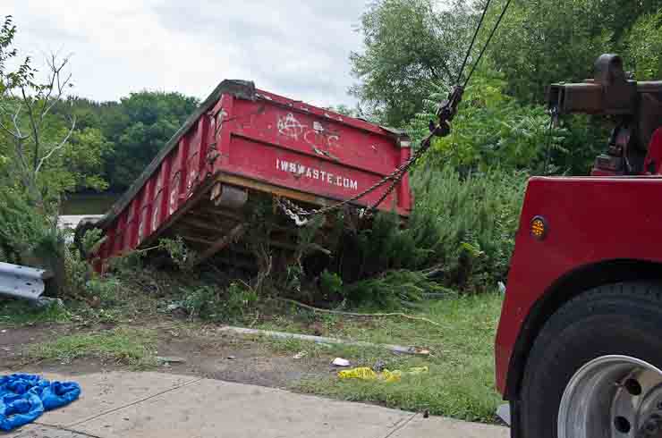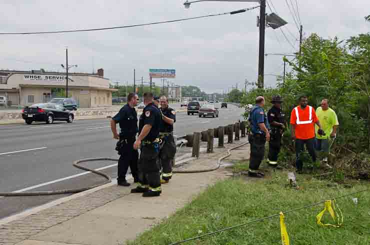 This page and the other pages in this series are the successors to the series of web-page about the Camden Fire Department that began with the page Camden Fire Department: The Fires of the Summer of 2011. On this and other pages in the series you will find pictures and information regarding different events and aspects of the fire service in Camden, New Jersey. I was in Camden on the morning of Tuesday, September 4, 2012 when I spotted Engine 10 on Kaighn Avenue east of Broadway, returning to their quarters after an investigation nearby. I pulled over and had taken a couple of photos when a call came over the radio dispatching Rescue 1 to the Admiral Wilson Boulevard. Off I went! At approximately 10:00 AM a tractor trailer transporting a dumpster, traveling eastbound on the Admiral Wilson Boulevard, was involved in a motor vehicle accident. From what I gathered, the driver of the truck swerved to avoid a passenger car at the Hess gas station, hit the car, lost control, and drove off the highway into the Cooper River. No one was hurt, but getting the truck out of the river was quite an event. As with the web page covering other Camden Fire Department events, if you can identify anyone that I've missed, please comment at the bottom of the page. (I'm terrible at at names and faces). October 31, 2012 |
