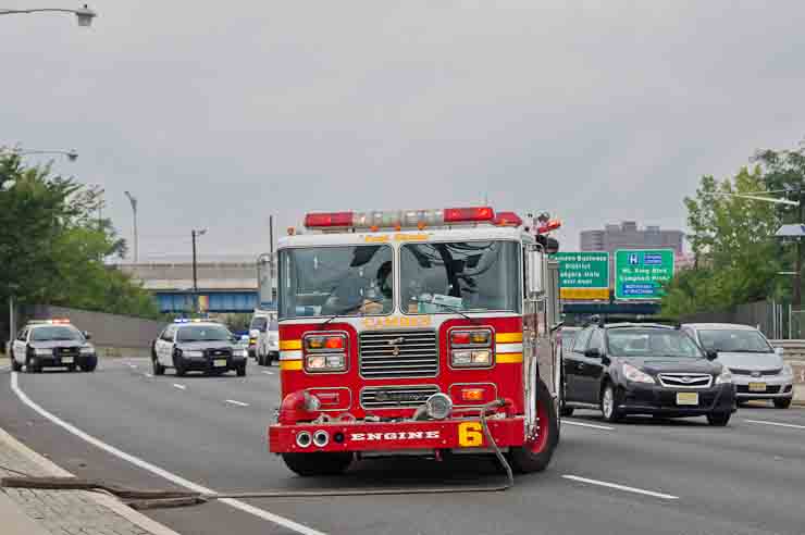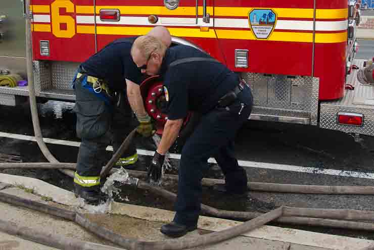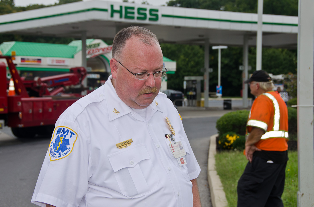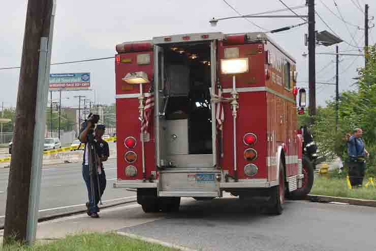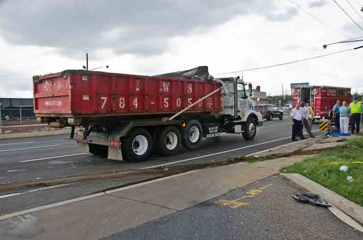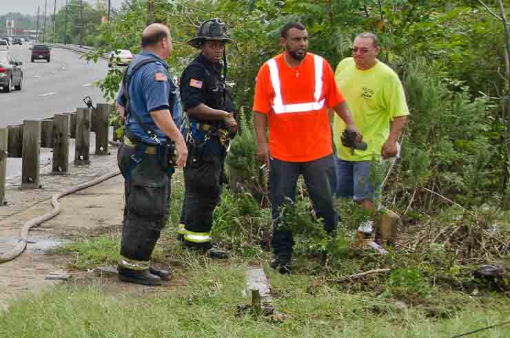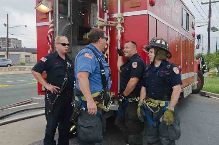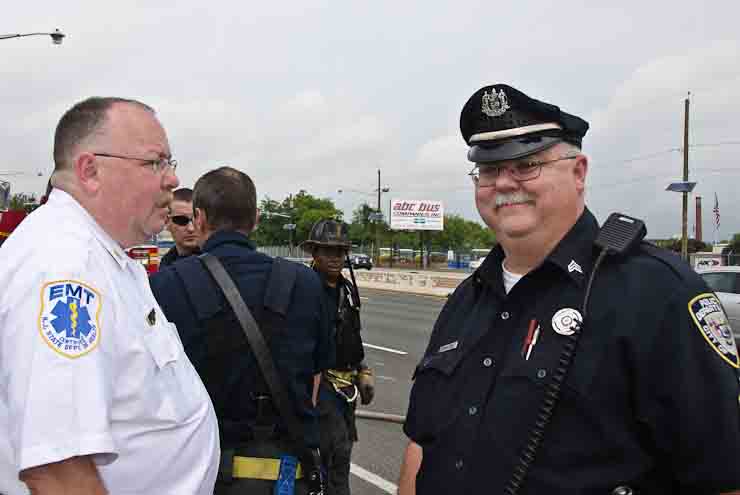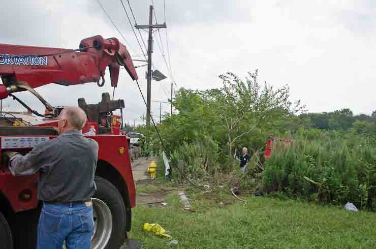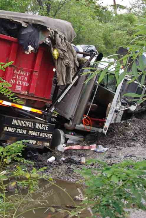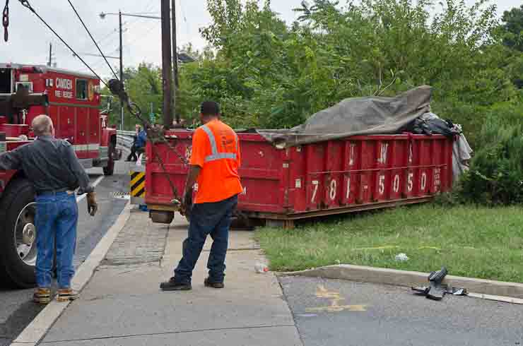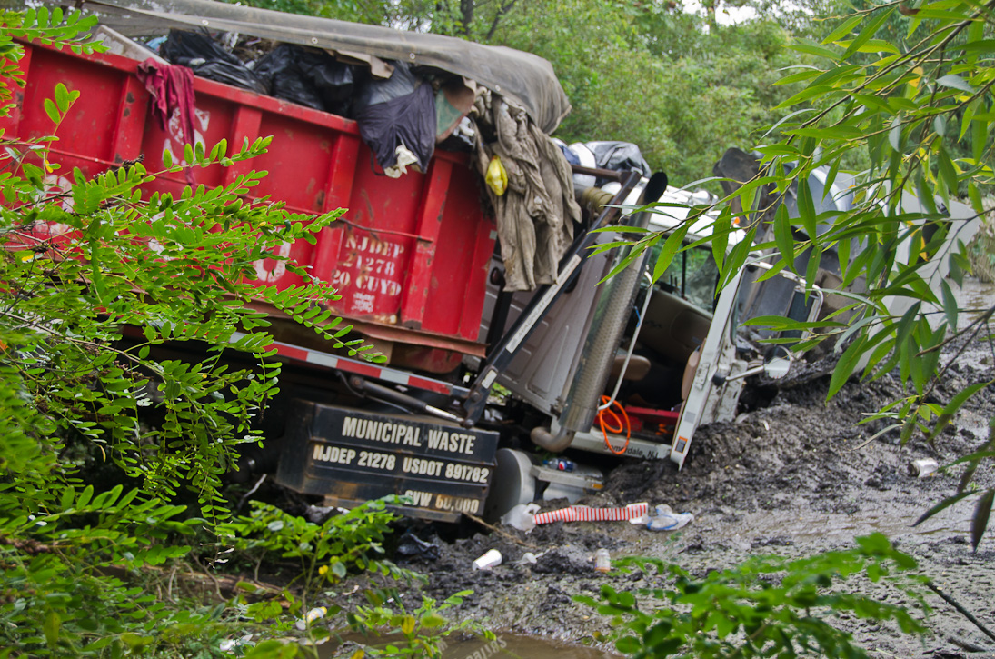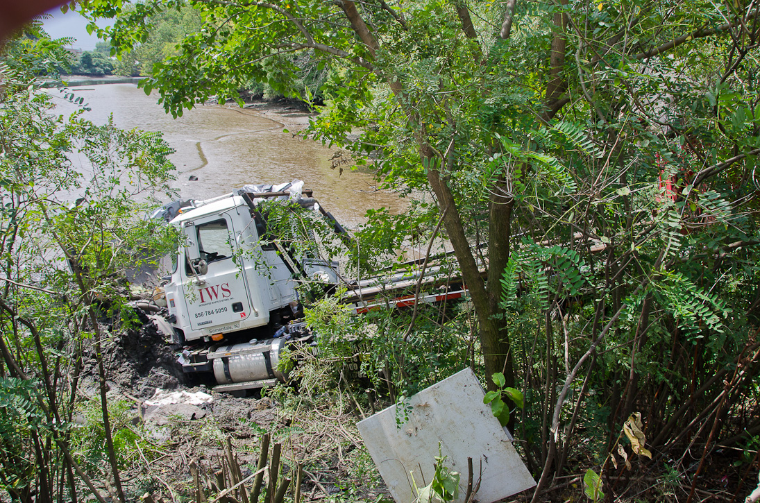 This page and the other pages in this series are the successors to the series of web-page about the Camden Fire Department that began with the page Camden Fire Department: The Fires of the Summer of 2011. On this and other pages in the series you will find pictures and information regarding different events and aspects of the fire service in Camden, New Jersey. I was in Camden on the morning of Tuesday, September 4, 2012 when I spotted Engine 10 on Kaighn Avenue east of Broadway, returning to their quarters after an investigation nearby. I pulled over and had taken a couple of photos when a call came over the radio dispatching Rescue 1 to the Admiral Wilson Boulevard. Off I went! At approximately 10:00 AM a tractor trailer transporting a dumpster, traveling eastbound on the Admiral Wilson Boulevard, was involved in a motor vehicle accident. From what I gathered, the driver of the truck swerved to avoid a passenger car at the Hess gas station, hit the car, lost control, and drove off the highway into the Cooper River. No one was hurt, but getting the truck out of the river was quite an event. As with the web page covering other Camden Fire Department events, if you can identify anyone that I've missed, please comment at the bottom of the page. (I'm terrible at at names and faces). October 31, 2012 |