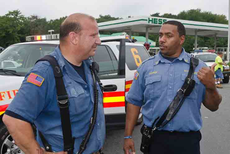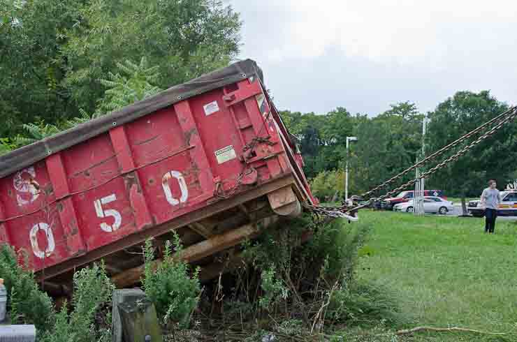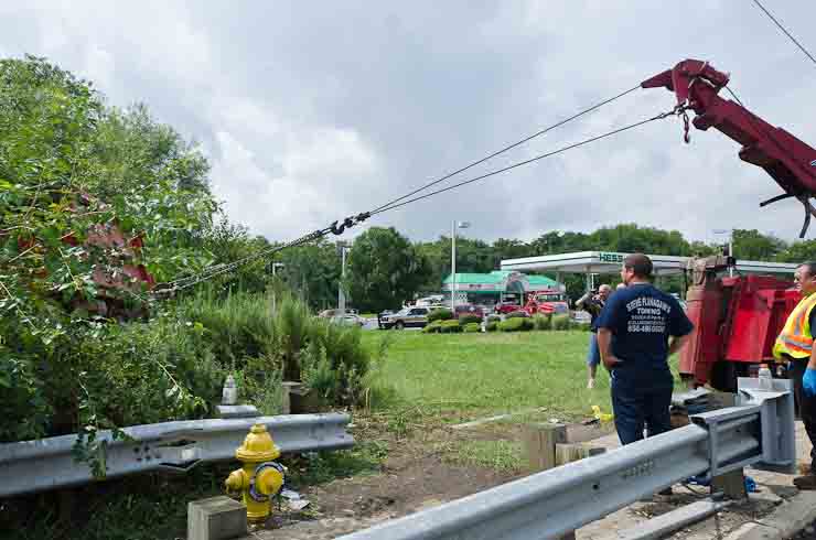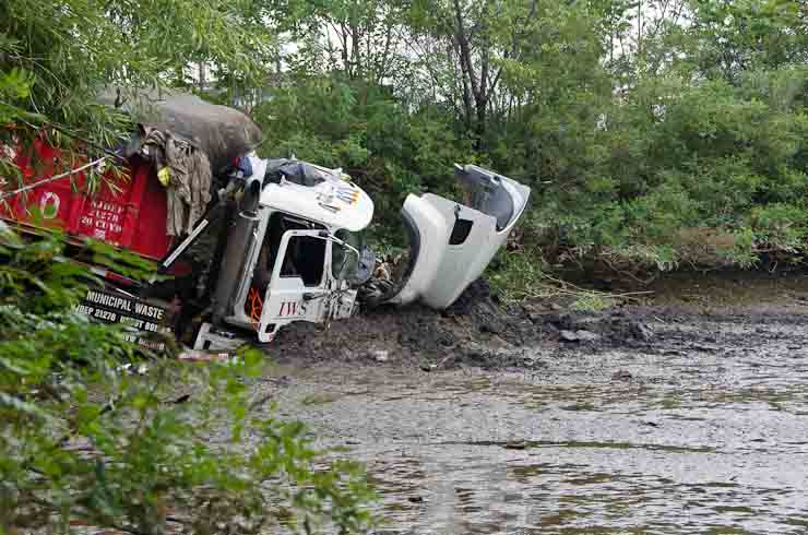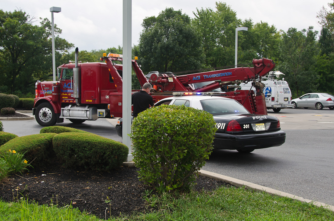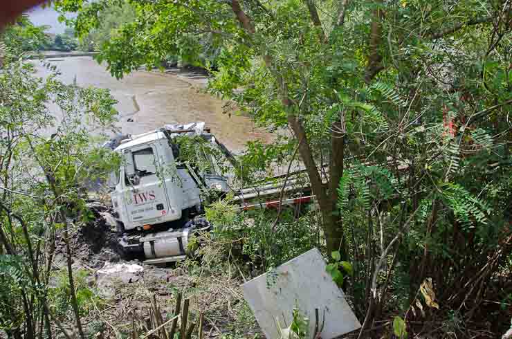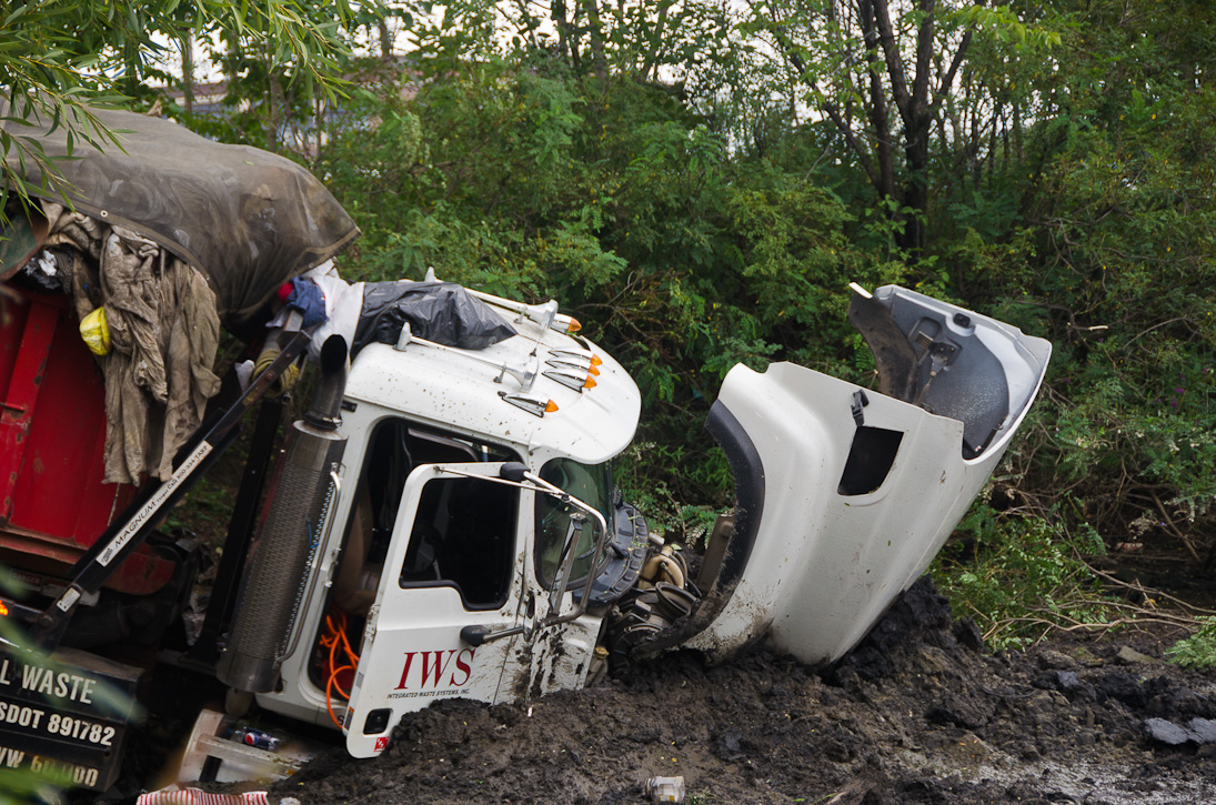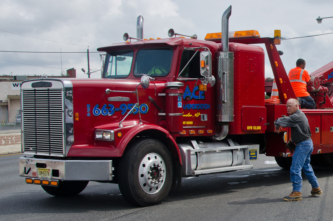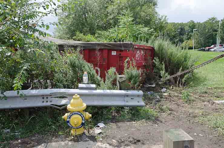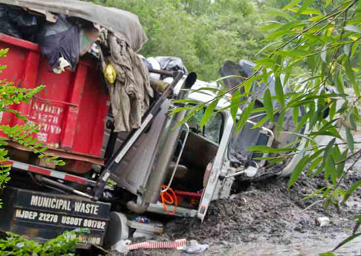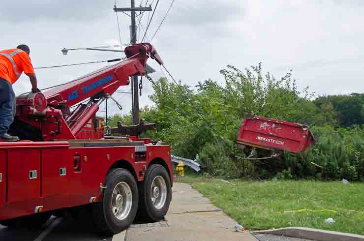 This page and the other pages in this series are the successors to the series of web-page about the Camden Fire Department that began with the page Camden Fire Department: The Fires of the Summer of 2011. On this and other pages in the series you will find pictures and information regarding different events and aspects of the fire service in Camden, New Jersey. I was in Camden on the morning of Tuesday, September 4, 2012 when I spotted Engine 10 on Kaighn Avenue east of Broadway, returning to their quarters after an investigation nearby. I pulled over and had taken a couple of photos when a call came over the radio dispatching Rescue 1 to the Admiral Wilson Boulevard. Off I went! At approximately 10:00 AM a tractor trailer transporting a dumpster, traveling eastbound on the Admiral Wilson Boulevard, was involved in a motor vehicle accident. From what I gathered, the driver of the truck swerved to avoid a passenger car at the Hess gas station, hit the car, lost control, and drove off the highway into the Cooper River. No one was hurt, but getting the truck out of the river was quite an event. As with the web page covering other Camden Fire Department events, if you can identify anyone that I've missed, please comment at the bottom of the page. (I'm terrible at at names and faces). October 31, 2012 |