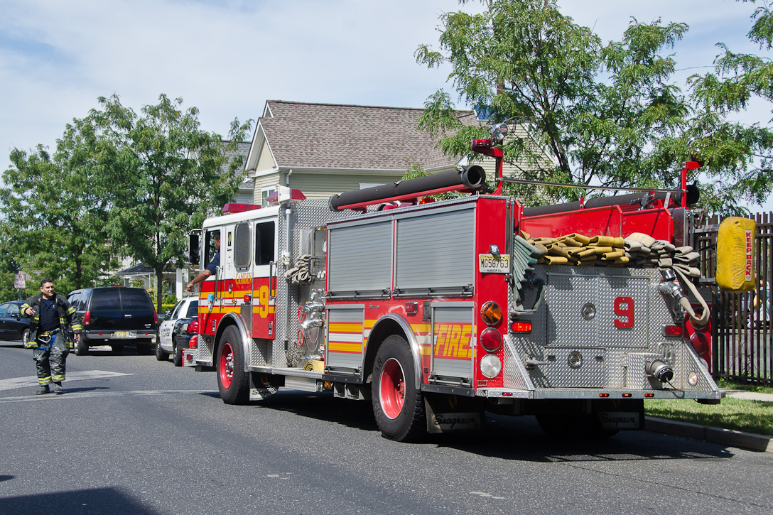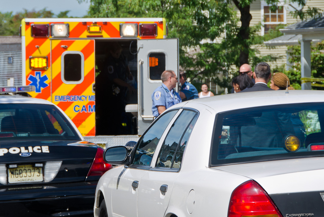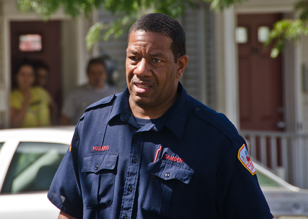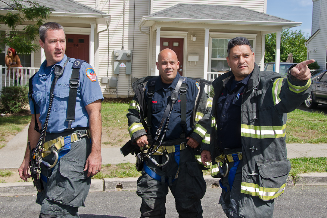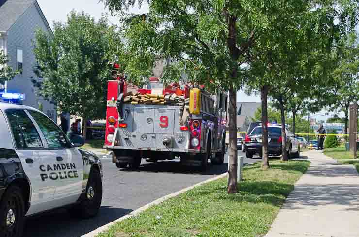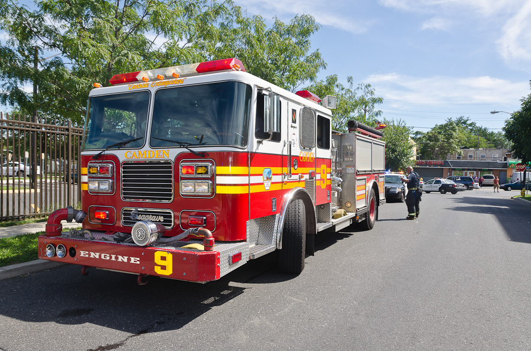 This page and the other pages in this series are the successors to the series of web-page about the Camden Fire Department that began with the page Camden Fire Department: The Fires of the Summer of 2011. On this and other pages in the series you will find pictures and information regarding different events and aspects of the fire service in Camden, New Jersey. I was in East Camden late in the afternoon of September 11 when a call over the radio sending Engine Company 9 to Beideman Avenue in the Baldwin's Run development, which formerly was known as Westfield Acres. There was some confusion as to what was going on and where, and it turned out to be for for good reason. Camden police were pursuing a suspect in the 200 block of North 32nd Street who turned and faced them with a weapon. Police fired on the suspect, wounding him in two places. The suspect fled on foot to a house on Beideman Avenue, where he was apprehended. Once the situation was safe, EMS personnel went in and transported the suspect to Cooper Hospital. After it was established as to what had taken place, Engine 9 went over to North 32nd Street and made sure that there was no risk of fire from the suspects vehicle. As with the web page covering other Camden Fire Department events, if you can identify anyone that I've missed, please comment at the bottom of the page. (I'm terrible at at names and faces). November 1, 2012 |