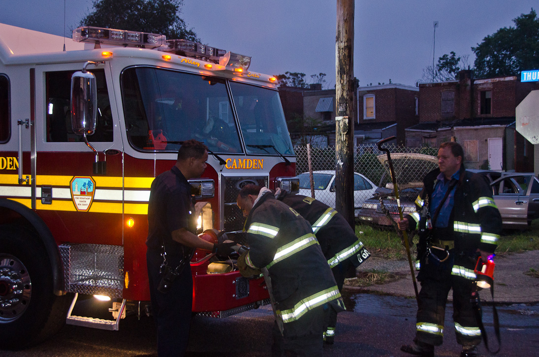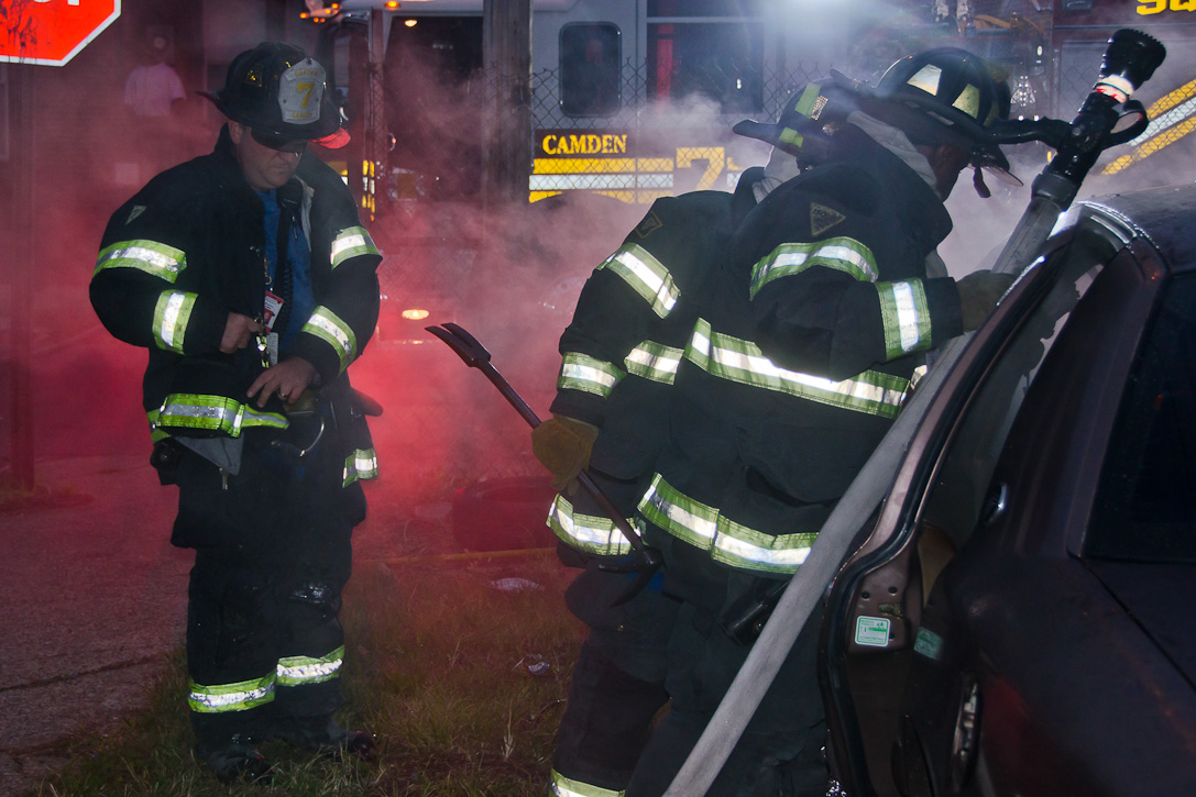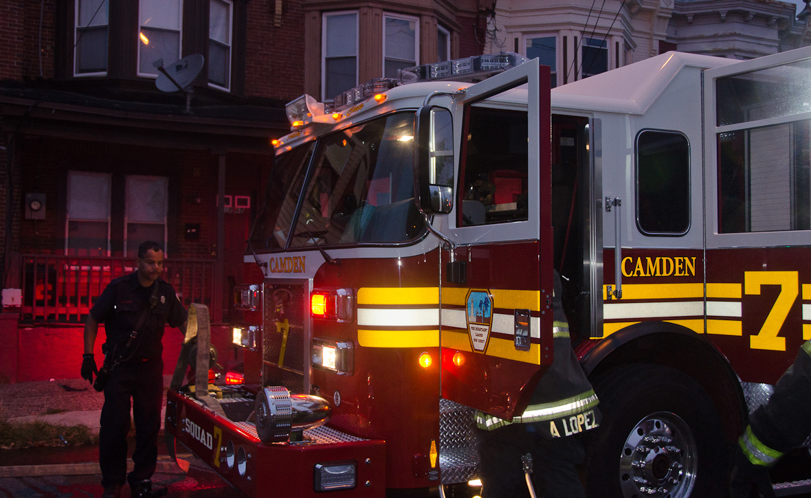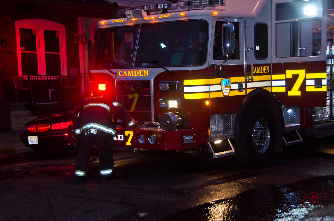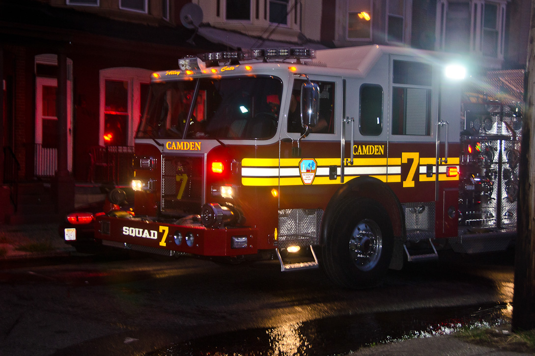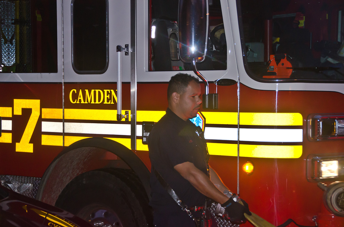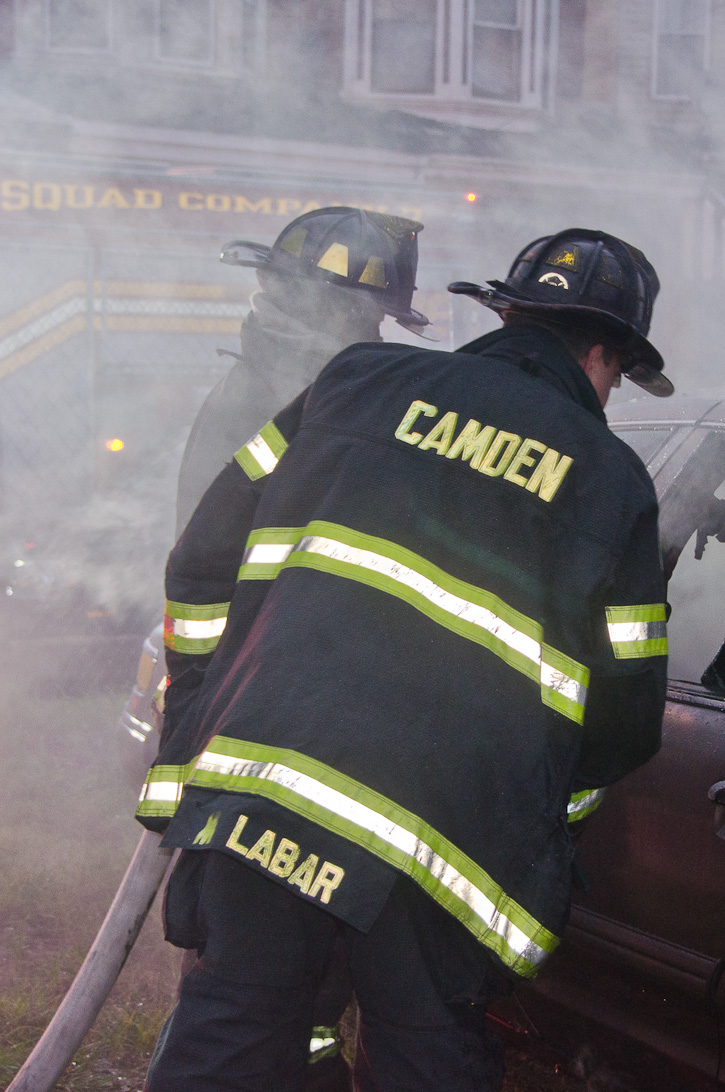 This page and the other pages in this series are the successors to the series of web-page about the Camden Fire Department that began with the page Camden Fire Department: The Fires of the Summer of 2011. On this and other pages in the series you will find pictures and information regarding different events and aspects of the fire service in Camden, New Jersey. At approximately 6:25 on October 9, 2012 Squad 7 was dispatched to Warsaw and Thurman Streets, where a car was on fire. The car was parked off street in a vacant lot that residents of Thurman Street had been using as a parking lot. The fire, in the car's engine compartment, was quickly dealt with. As with the web page covering other Camden Fire Department events, if you can identify anyone that I've missed, please comment at the bottom of the page. (I'm terrible at at names and faces). November 1, 2012 |