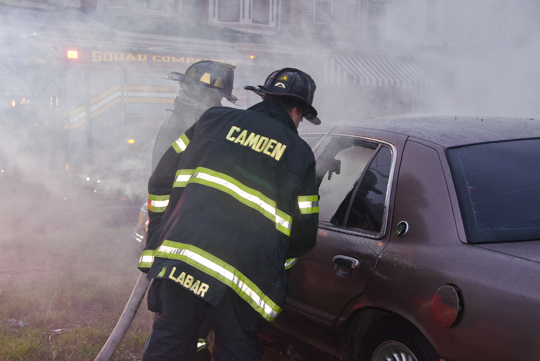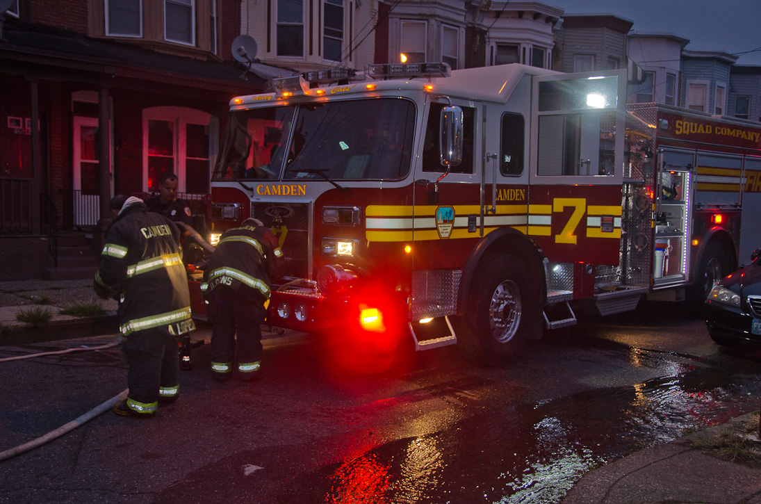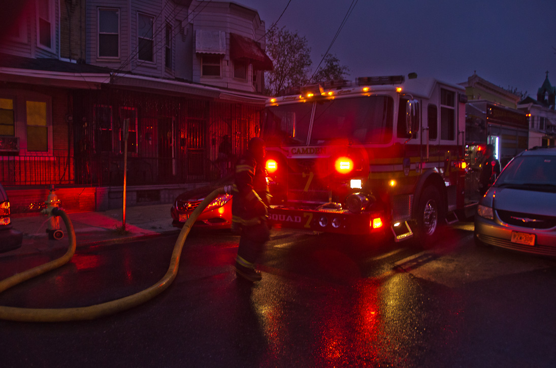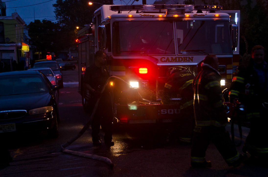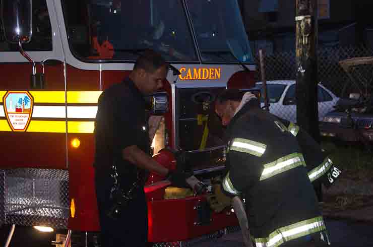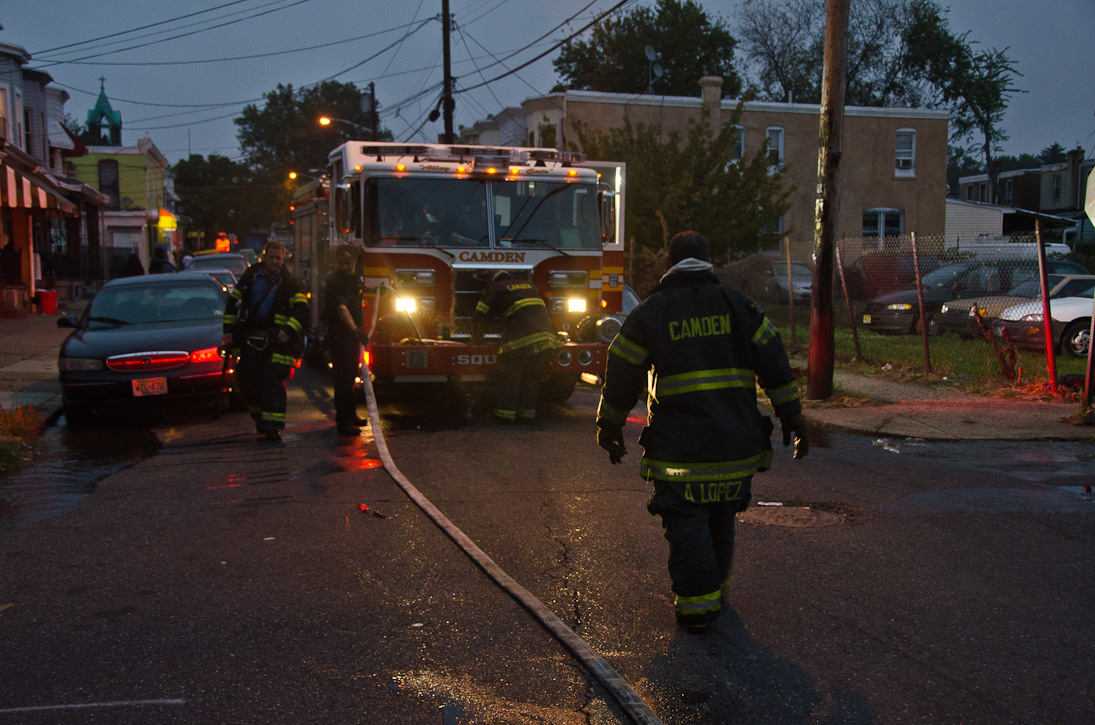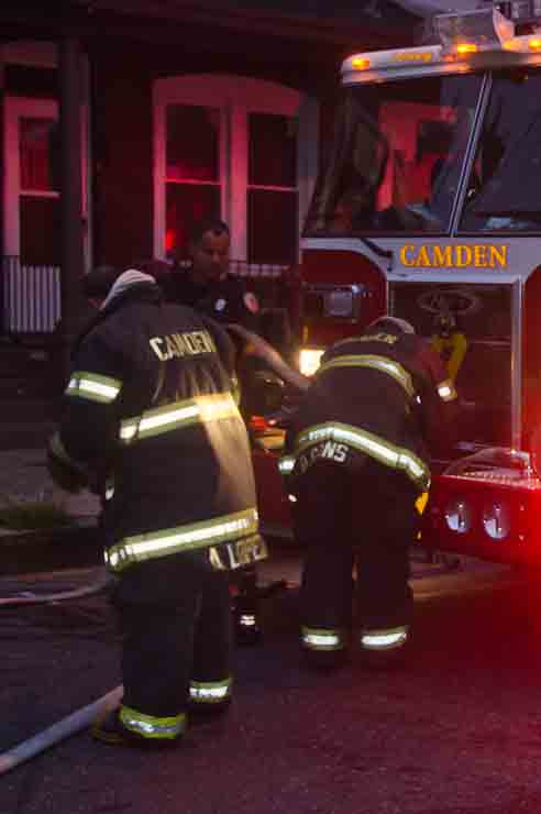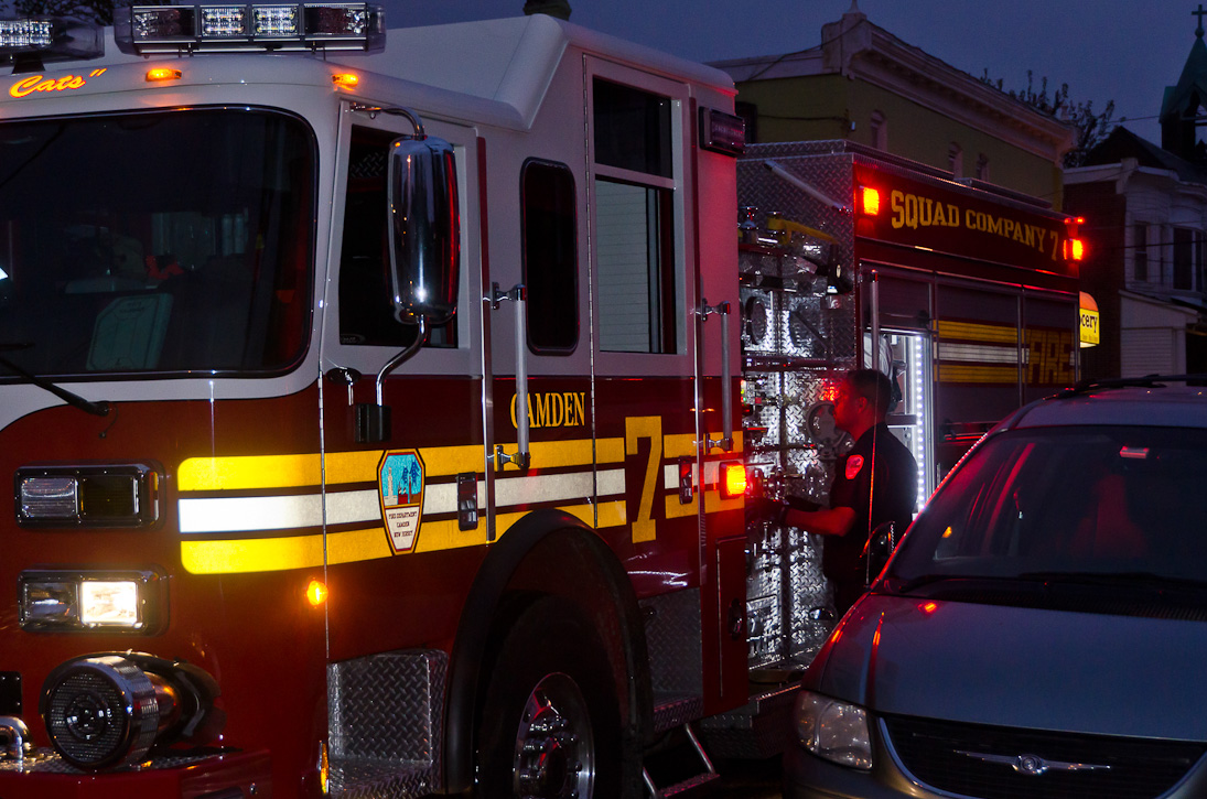 This page and the other pages in this series are the successors to the series of web-page about the Camden Fire Department that began with the page Camden Fire Department: The Fires of the Summer of 2011. On this and other pages in the series you will find pictures and information regarding different events and aspects of the fire service in Camden, New Jersey. At approximately 6:25 on October 9, 2012 Squad 7 was dispatched to Warsaw and Thurman Streets, where a car was on fire. The car was parked off street in a vacant lot that residents of Thurman Street had been using as a parking lot. The fire, in the car's engine compartment, was quickly dealt with. As with the web page covering other Camden Fire Department events, if you can identify anyone that I've missed, please comment at the bottom of the page. (I'm terrible at at names and faces). November 1, 2012 |