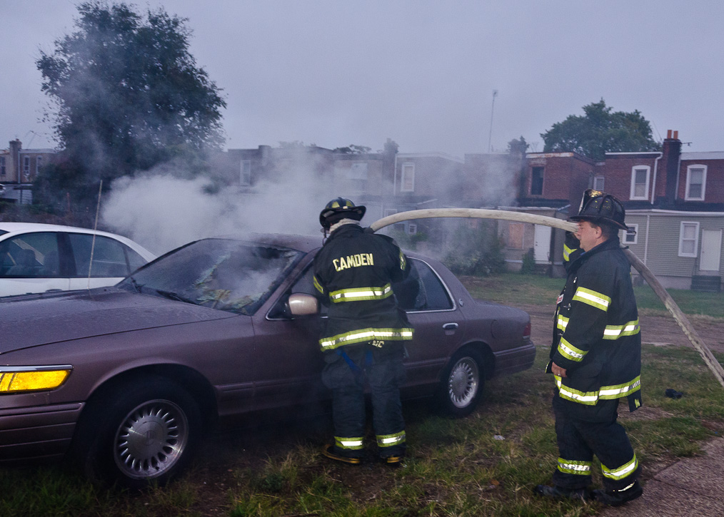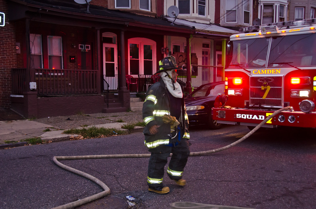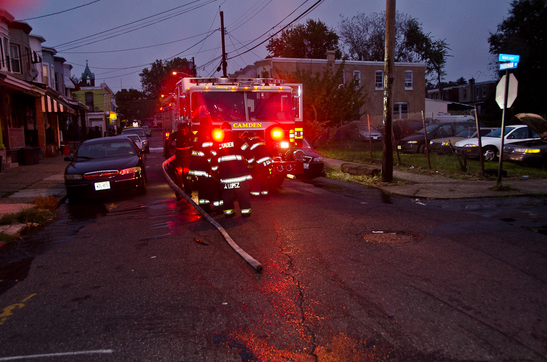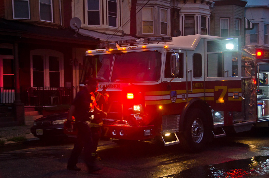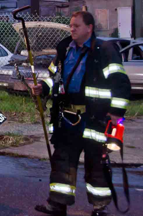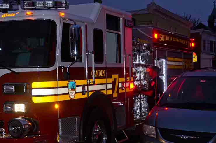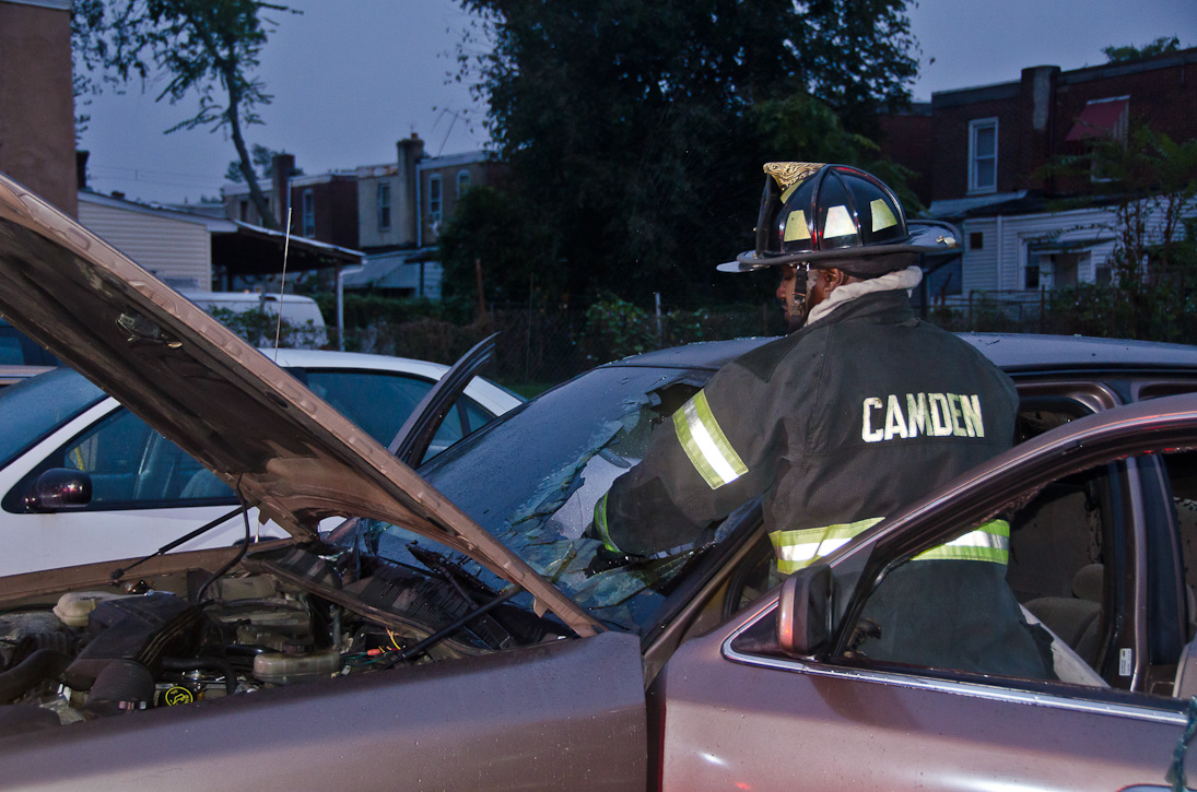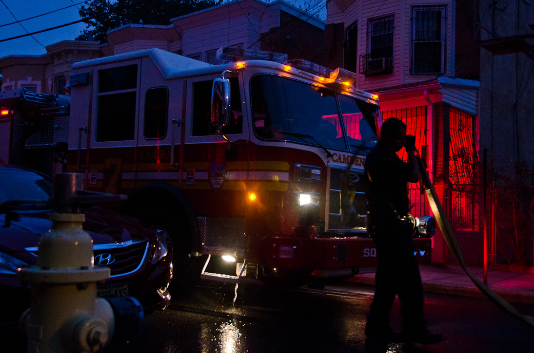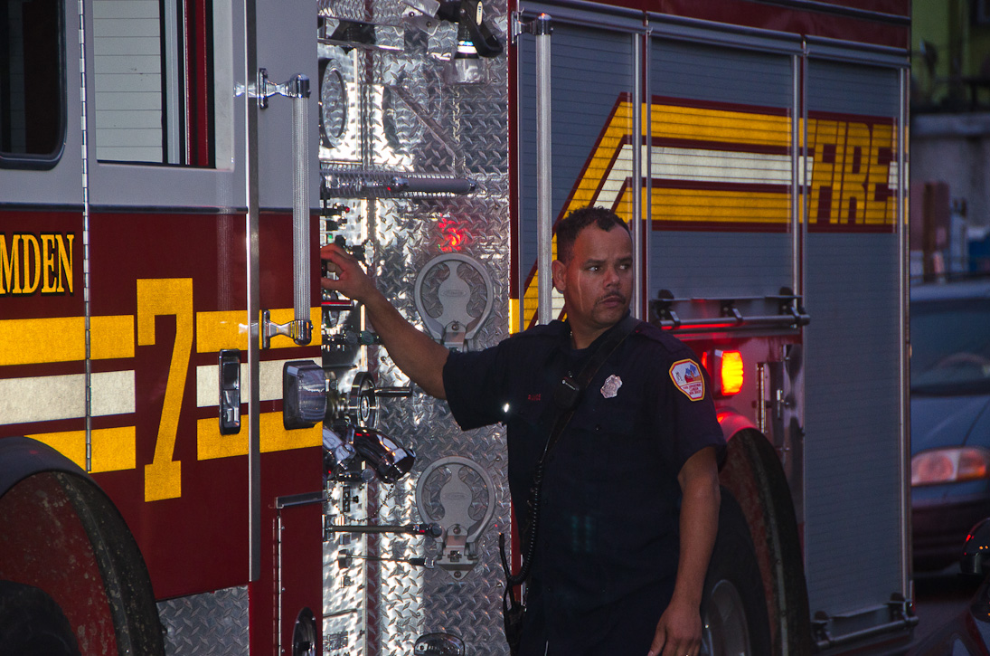 This page and the other pages in this series are the successors to the series of web-page about the Camden Fire Department that began with the page Camden Fire Department: The Fires of the Summer of 2011. On this and other pages in the series you will find pictures and information regarding different events and aspects of the fire service in Camden, New Jersey. At approximately 6:25 on October 9, 2012 Squad 7 was dispatched to Warsaw and Thurman Streets, where a car was on fire. The car was parked off street in a vacant lot that residents of Thurman Street had been using as a parking lot. The fire, in the car's engine compartment, was quickly dealt with. As with the web page covering other Camden Fire Department events, if you can identify anyone that I've missed, please comment at the bottom of the page. (I'm terrible at at names and faces). November 1, 2012 |