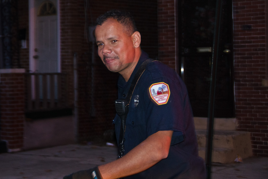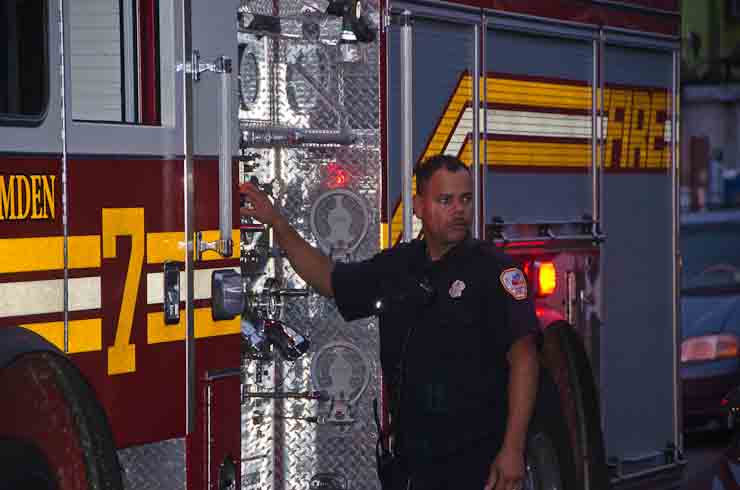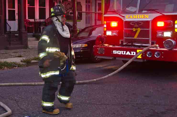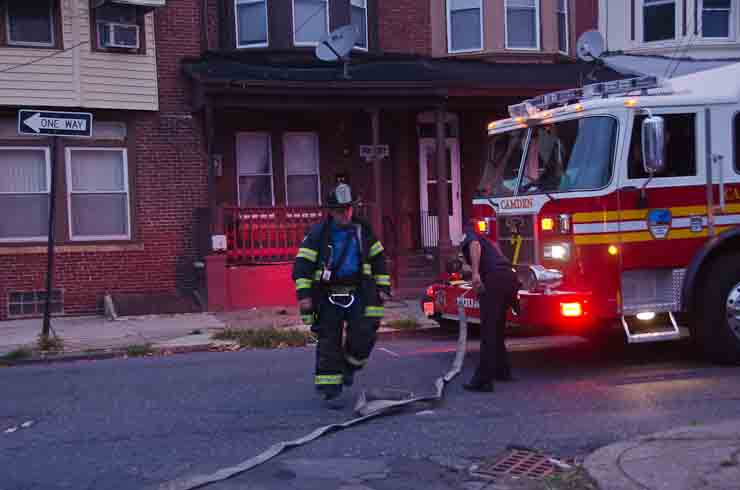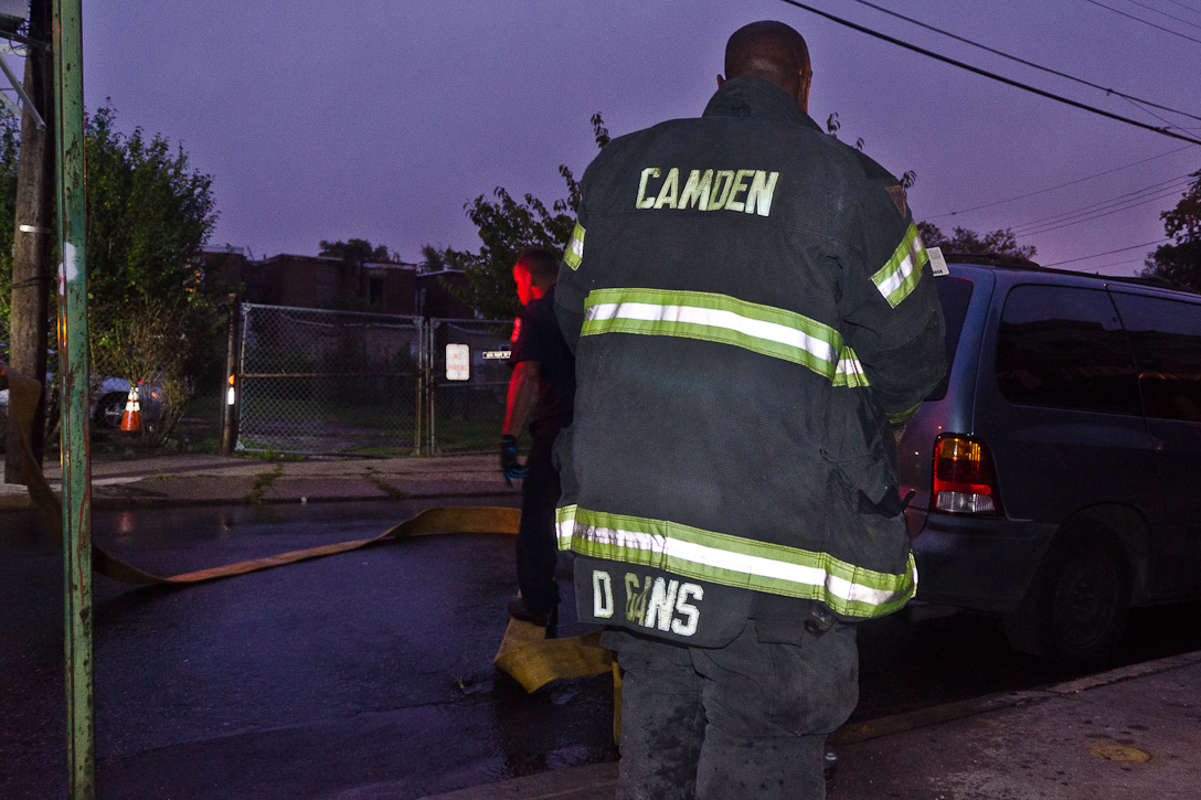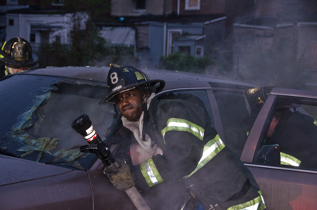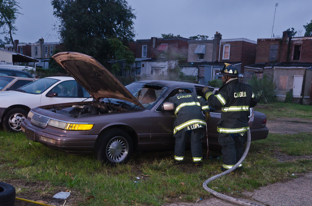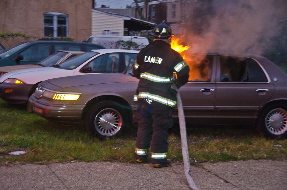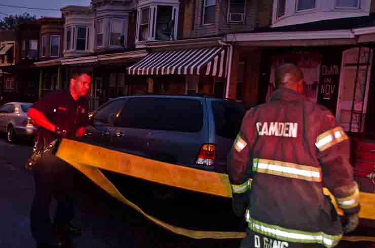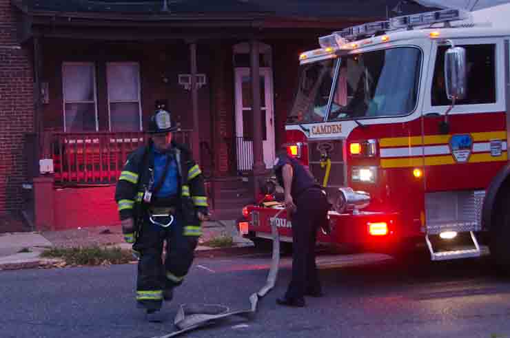 This page and the other pages in this series are the successors to the series of web-page about the Camden Fire Department that began with the page Camden Fire Department: The Fires of the Summer of 2011. On this and other pages in the series you will find pictures and information regarding different events and aspects of the fire service in Camden, New Jersey. At approximately 6:25 on October 9, 2012 Squad 7 was dispatched to Warsaw and Thurman Streets, where a car was on fire. The car was parked off street in a vacant lot that residents of Thurman Street had been using as a parking lot. The fire, in the car's engine compartment, was quickly dealt with. As with the web page covering other Camden Fire Department events, if you can identify anyone that I've missed, please comment at the bottom of the page. (I'm terrible at at names and faces). November 1, 2012 |