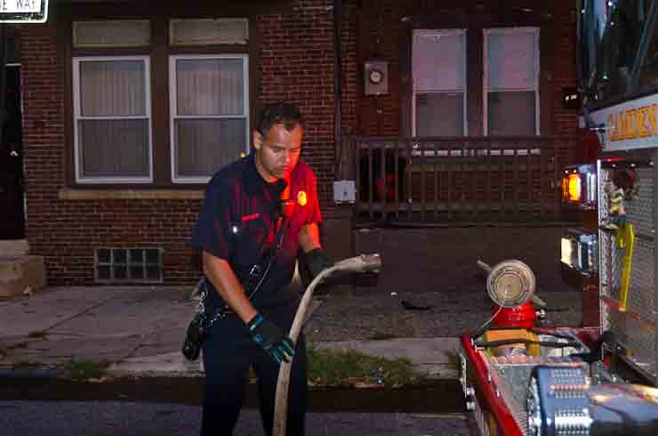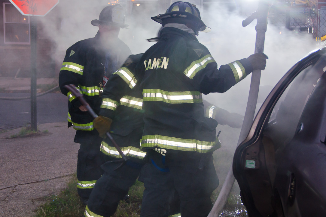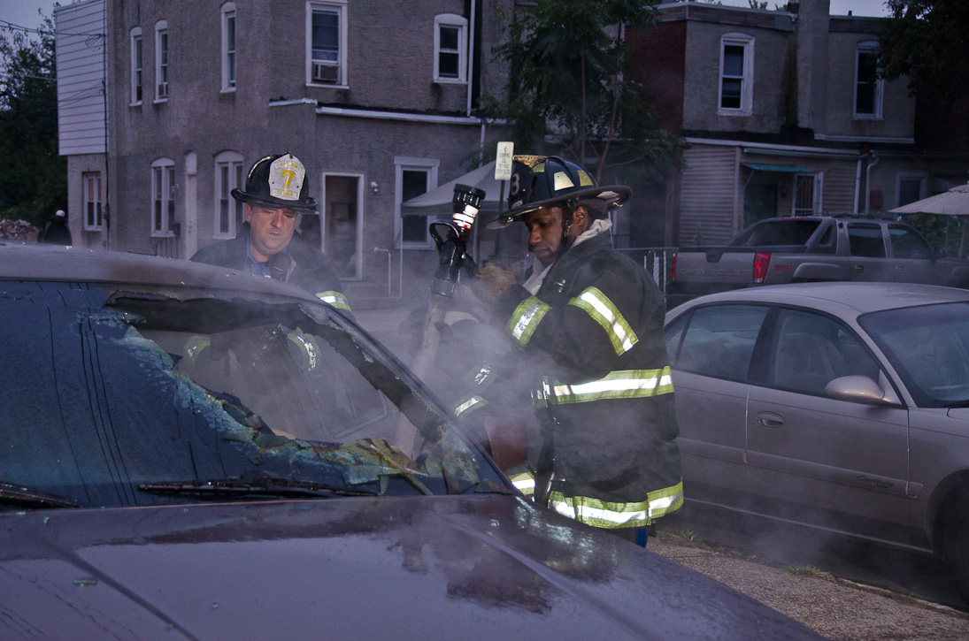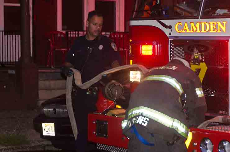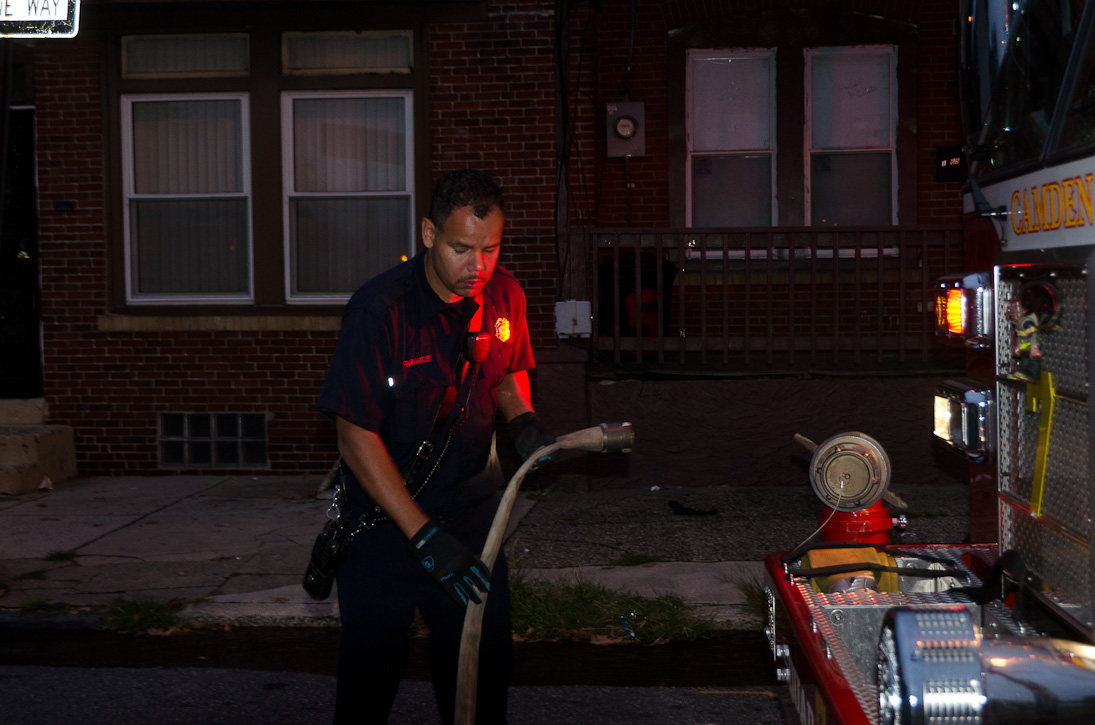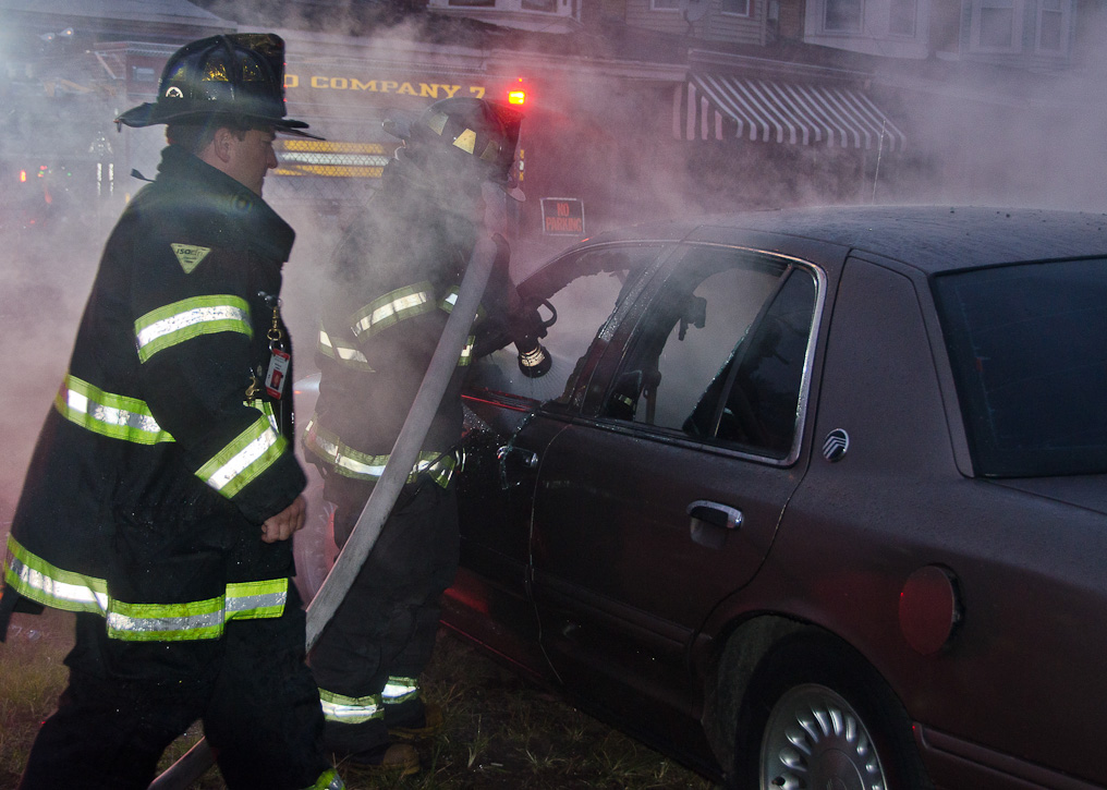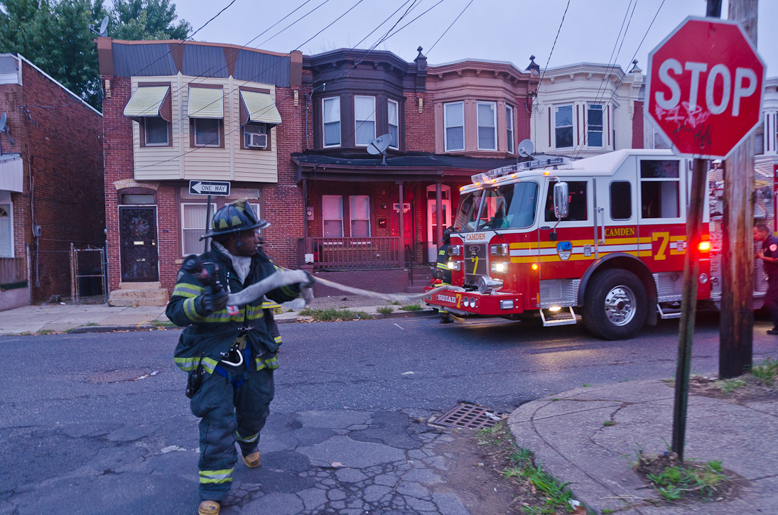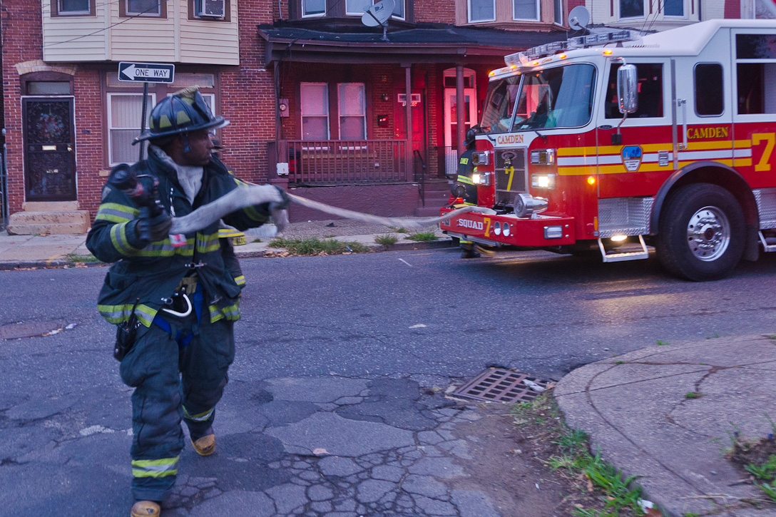 This page and the other pages in this series are the successors to the series of web-page about the Camden Fire Department that began with the page Camden Fire Department: The Fires of the Summer of 2011. On this and other pages in the series you will find pictures and information regarding different events and aspects of the fire service in Camden, New Jersey. At approximately 6:25 on October 9, 2012 Squad 7 was dispatched to Warsaw and Thurman Streets, where a car was on fire. The car was parked off street in a vacant lot that residents of Thurman Street had been using as a parking lot. The fire, in the car's engine compartment, was quickly dealt with. As with the web page covering other Camden Fire Department events, if you can identify anyone that I've missed, please comment at the bottom of the page. (I'm terrible at at names and faces). November 1, 2012 |