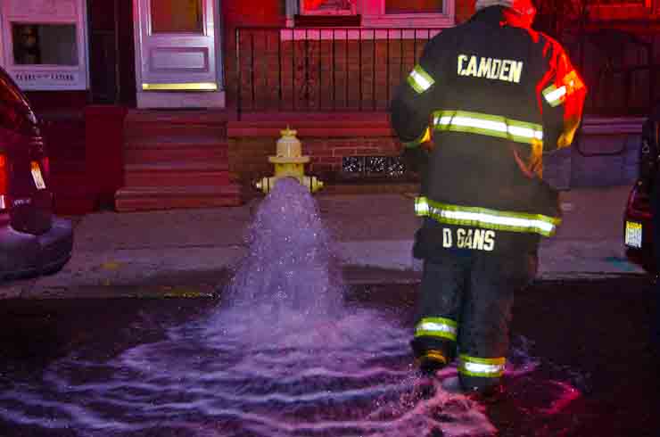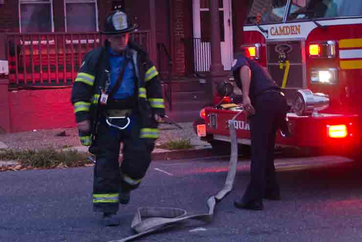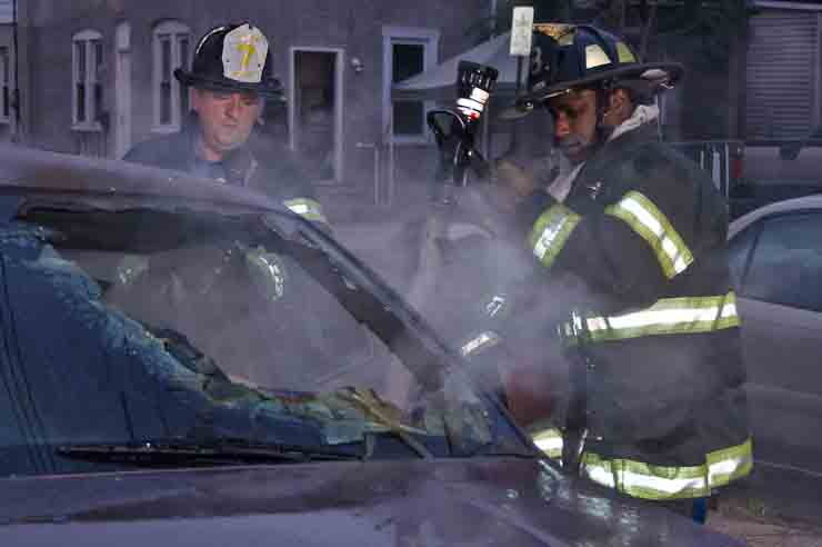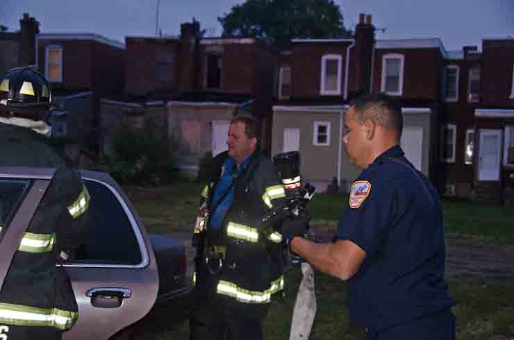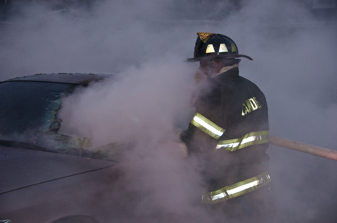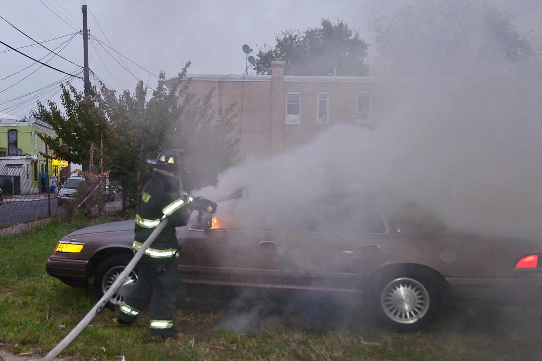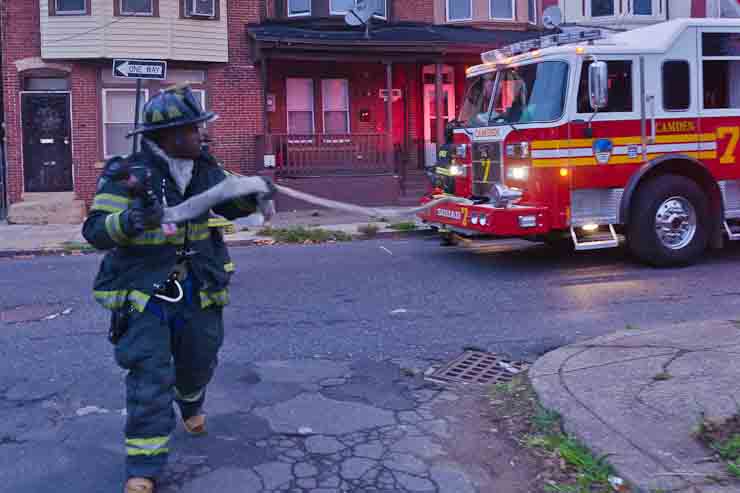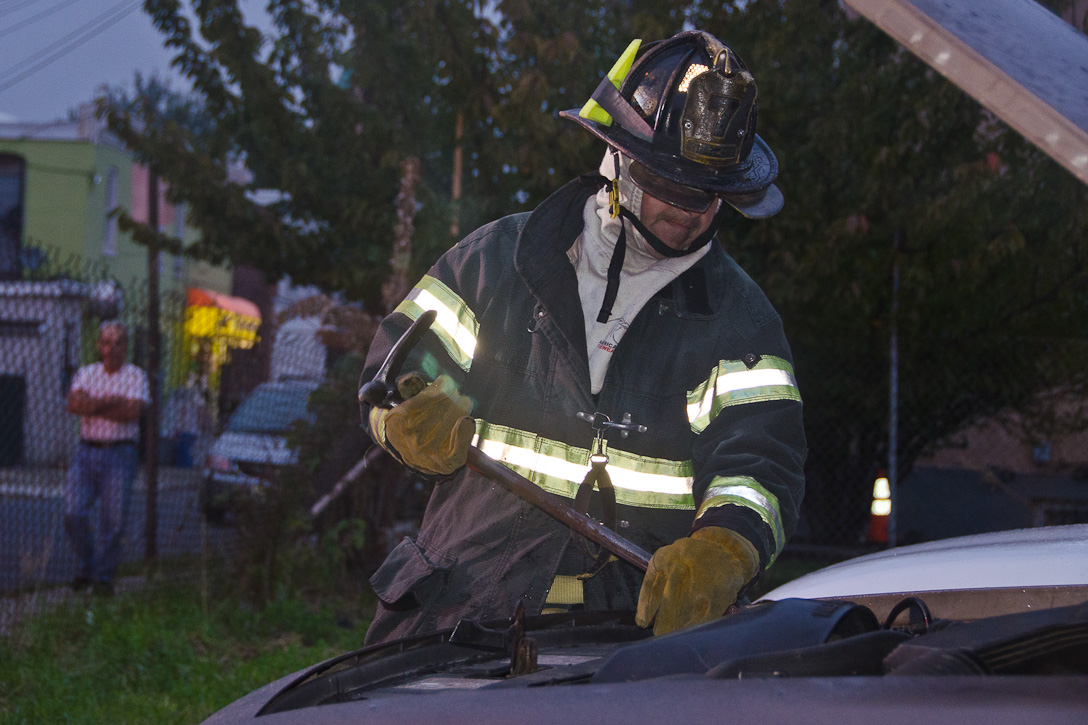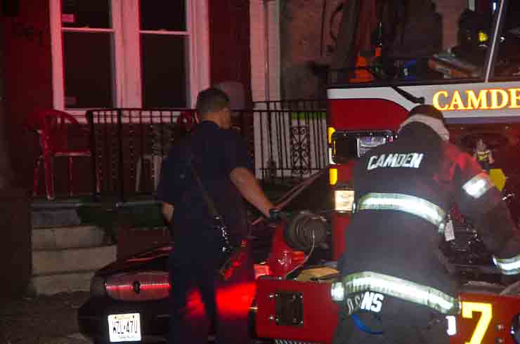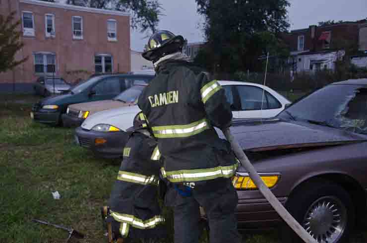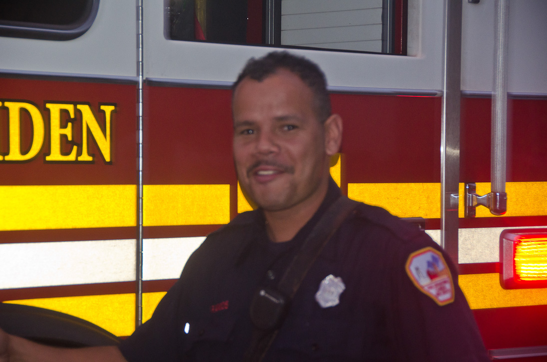 This page and the other pages in this series are the successors to the series of web-page about the Camden Fire Department that began with the page Camden Fire Department: The Fires of the Summer of 2011. On this and other pages in the series you will find pictures and information regarding different events and aspects of the fire service in Camden, New Jersey. At approximately 6:25 on October 9, 2012 Squad 7 was dispatched to Warsaw and Thurman Streets, where a car was on fire. The car was parked off street in a vacant lot that residents of Thurman Street had been using as a parking lot. The fire, in the car's engine compartment, was quickly dealt with. As with the web page covering other Camden Fire Department events, if you can identify anyone that I've missed, please comment at the bottom of the page. (I'm terrible at at names and faces). November 1, 2012 |