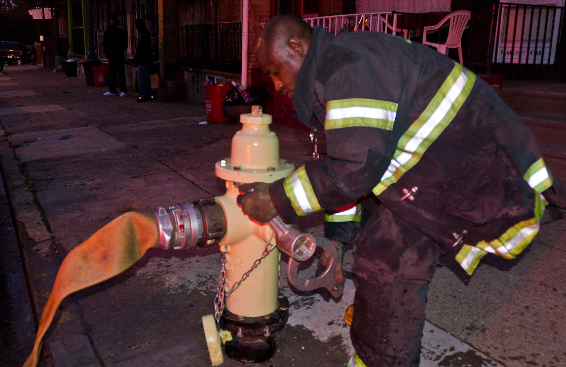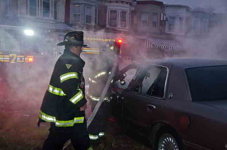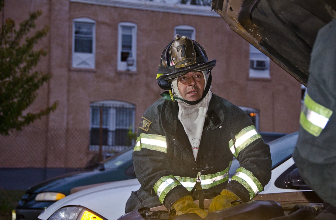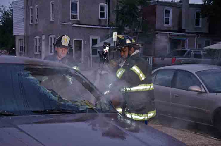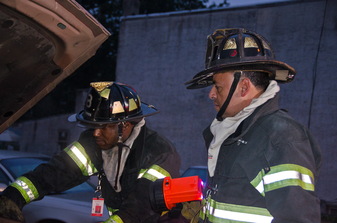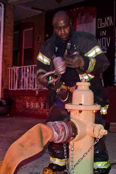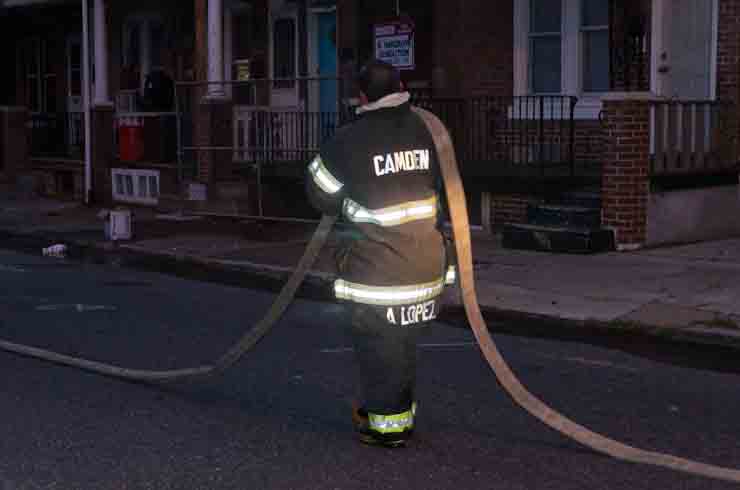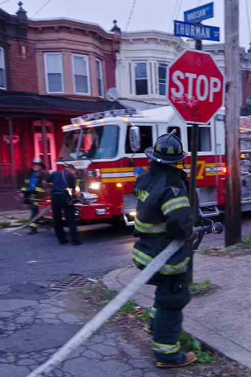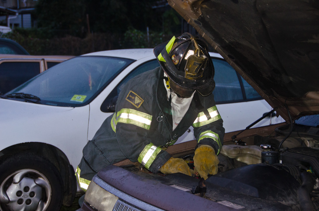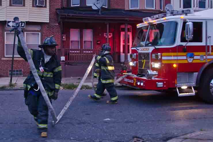 This page and the other pages in this series are the successors to the series of web-page about the Camden Fire Department that began with the page Camden Fire Department: The Fires of the Summer of 2011. On this and other pages in the series you will find pictures and information regarding different events and aspects of the fire service in Camden, New Jersey. At approximately 6:25 on October 9, 2012 Squad 7 was dispatched to Warsaw and Thurman Streets, where a car was on fire. The car was parked off street in a vacant lot that residents of Thurman Street had been using as a parking lot. The fire, in the car's engine compartment, was quickly dealt with. As with the web page covering other Camden Fire Department events, if you can identify anyone that I've missed, please comment at the bottom of the page. (I'm terrible at at names and faces). November 1, 2012 |
