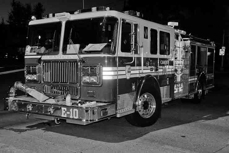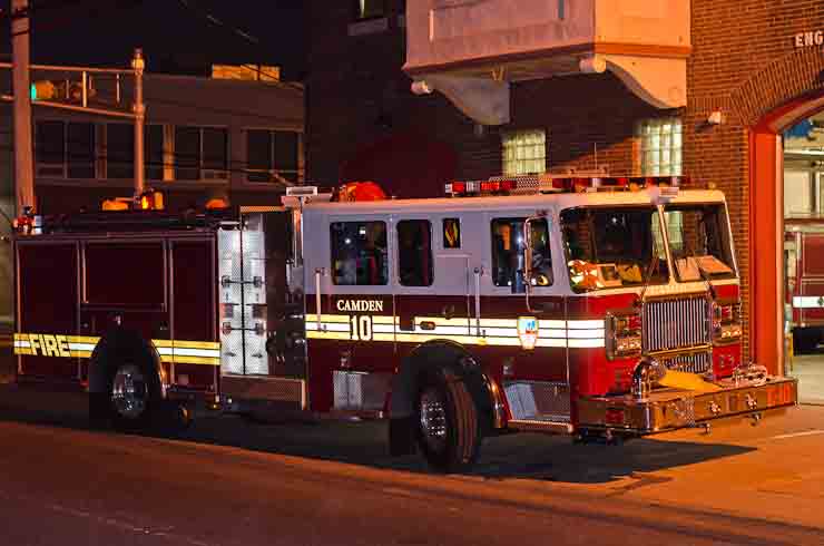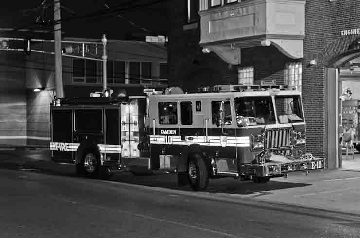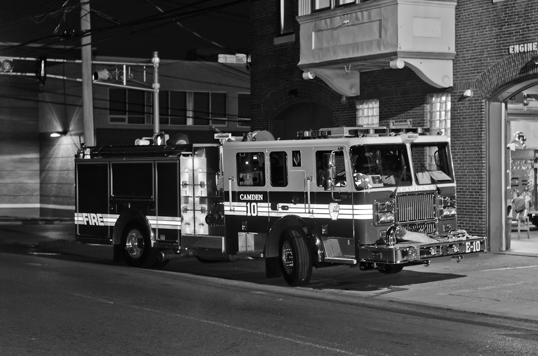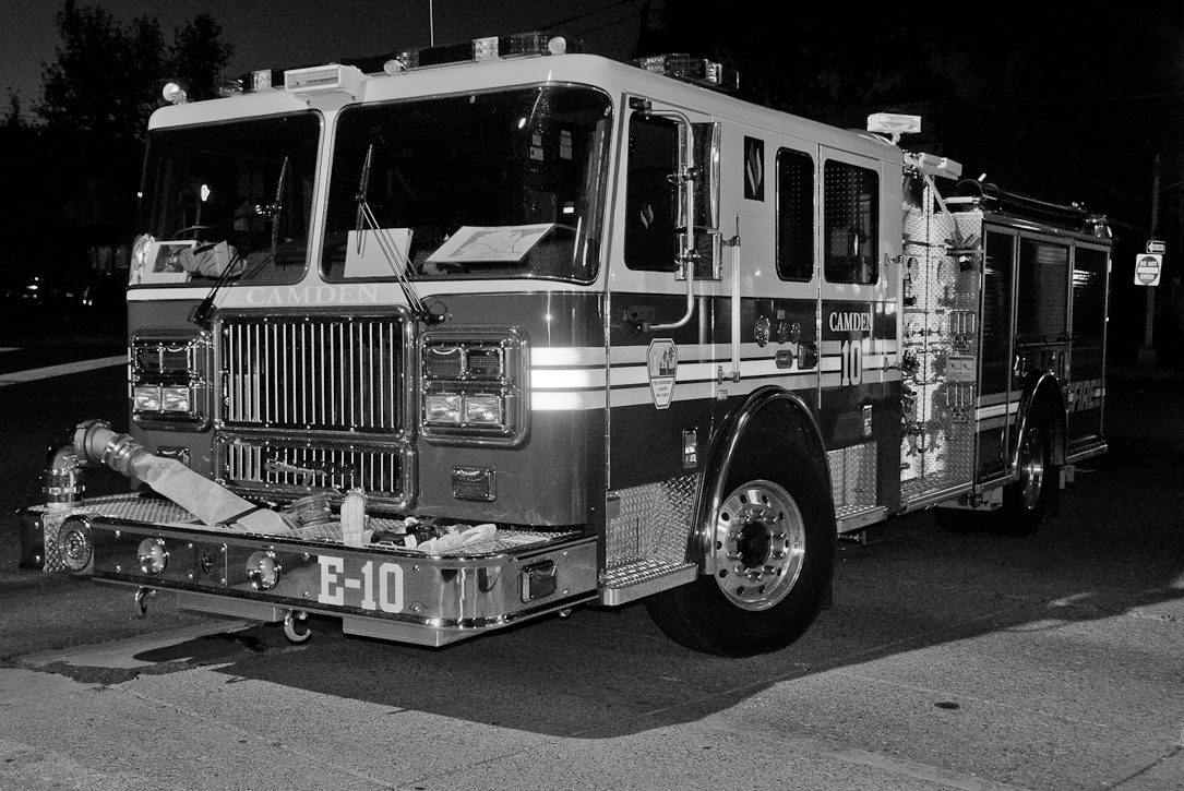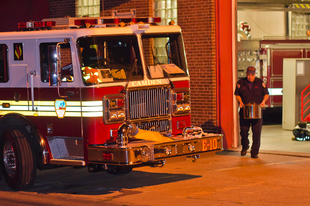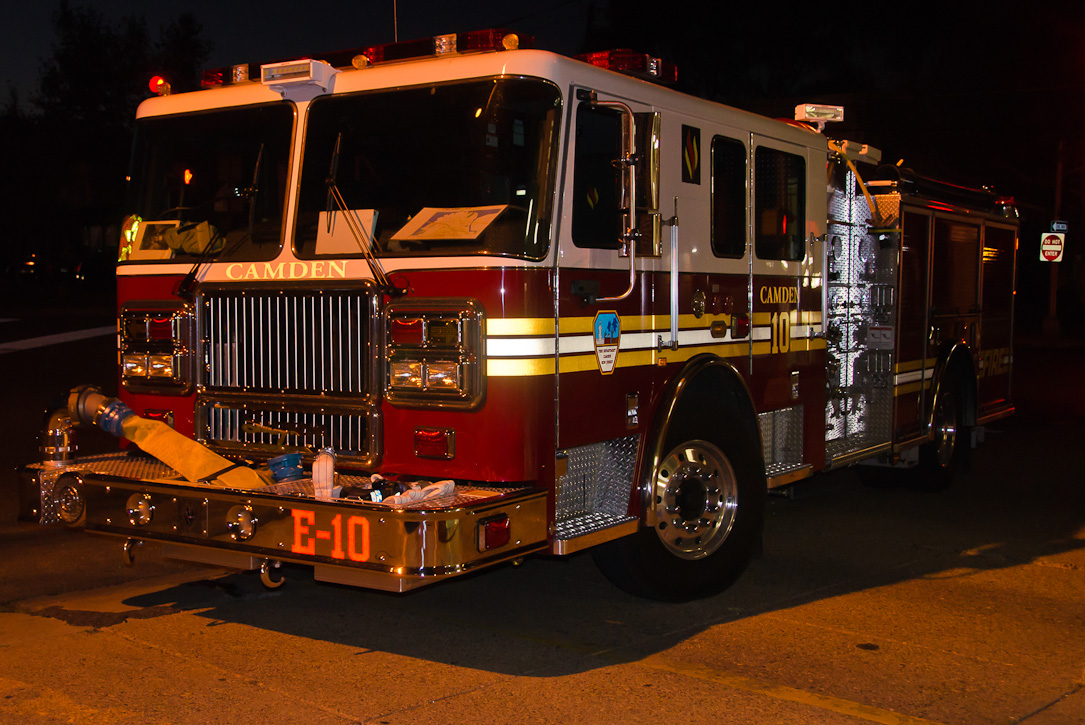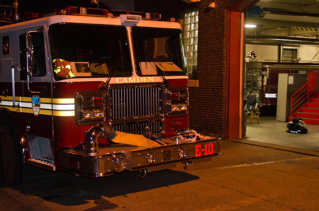 This page and the other pages in this series are the successors to the series of web-page about the Camden Fire Department that began with the page Camden Fire Department: The Fires of the Summer of 2011. On this and other pages in the series you will find pictures and information regarding different events and aspects of the fire service in Camden, New Jersey. Sunday evening at Engine 10, getting ready for another Sunday dinner at Liberty Station. At 6:36 Engine 10 was dispatched to Lakeshore Drive to investigate an appliance. No drama on this one… always a good thing, in reality… but I did take advantage of the opportunity to get a few photos of the new Engine 10 truck at night. As with the web page covering other Camden Fire Department events, if you can identify anyone that I've missed, please comment at the bottom of the page. (I'm terrible at at names and faces). November 2, 2012 |