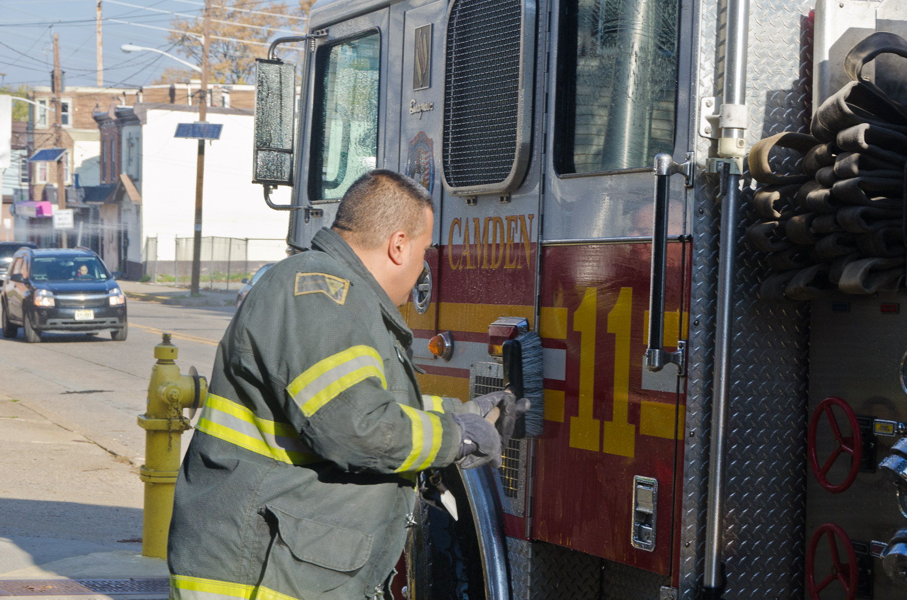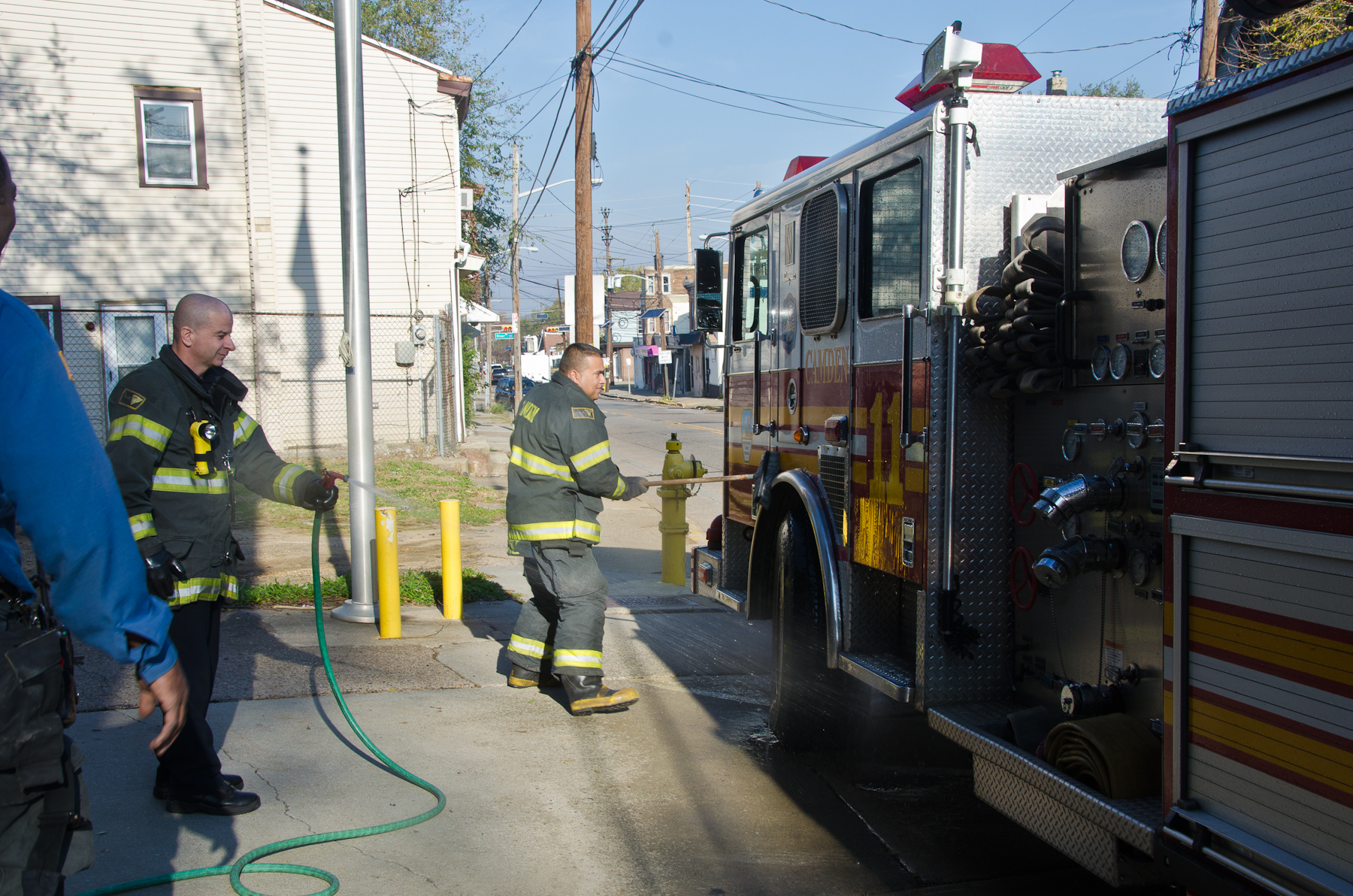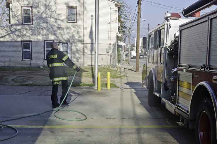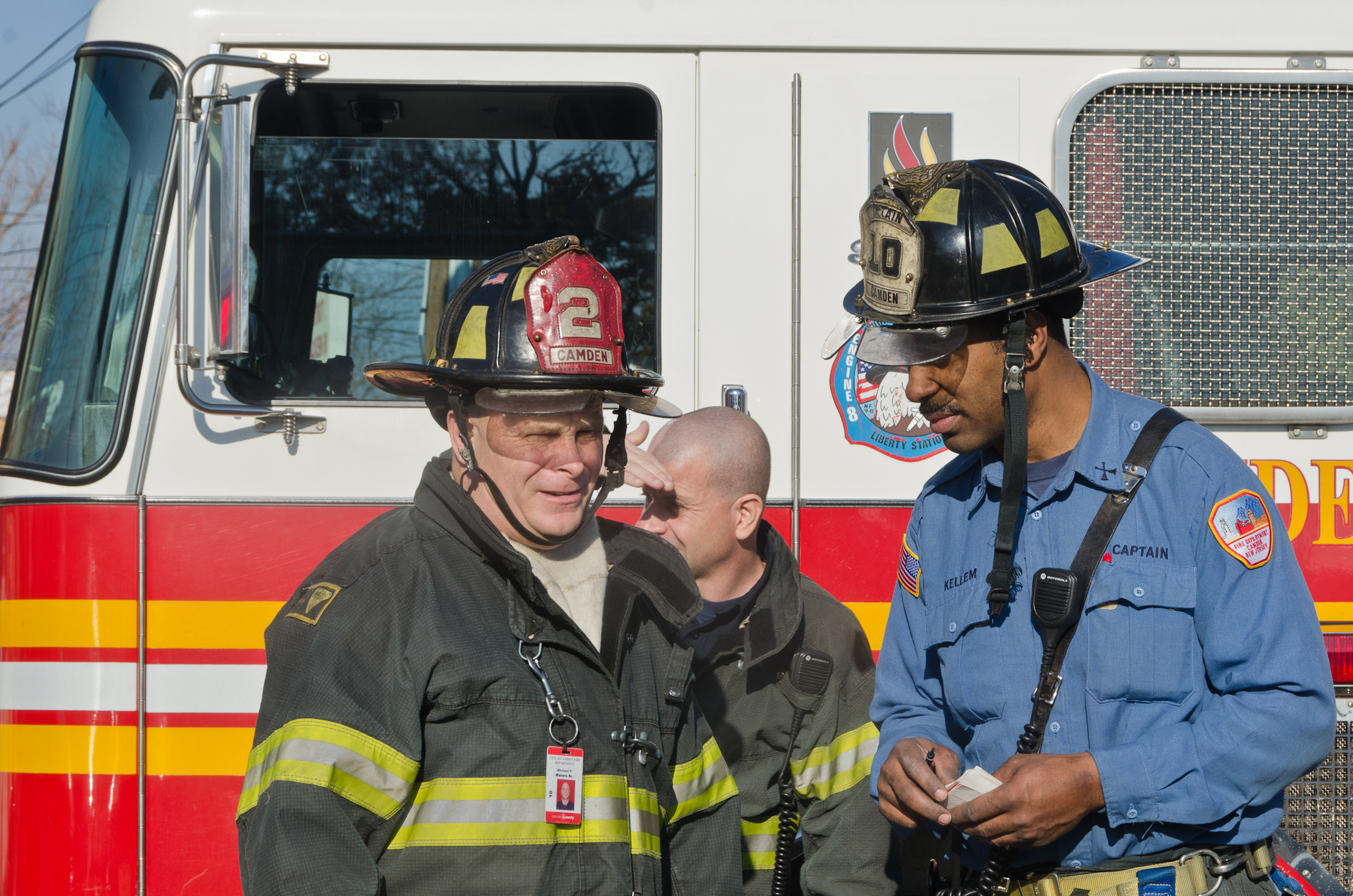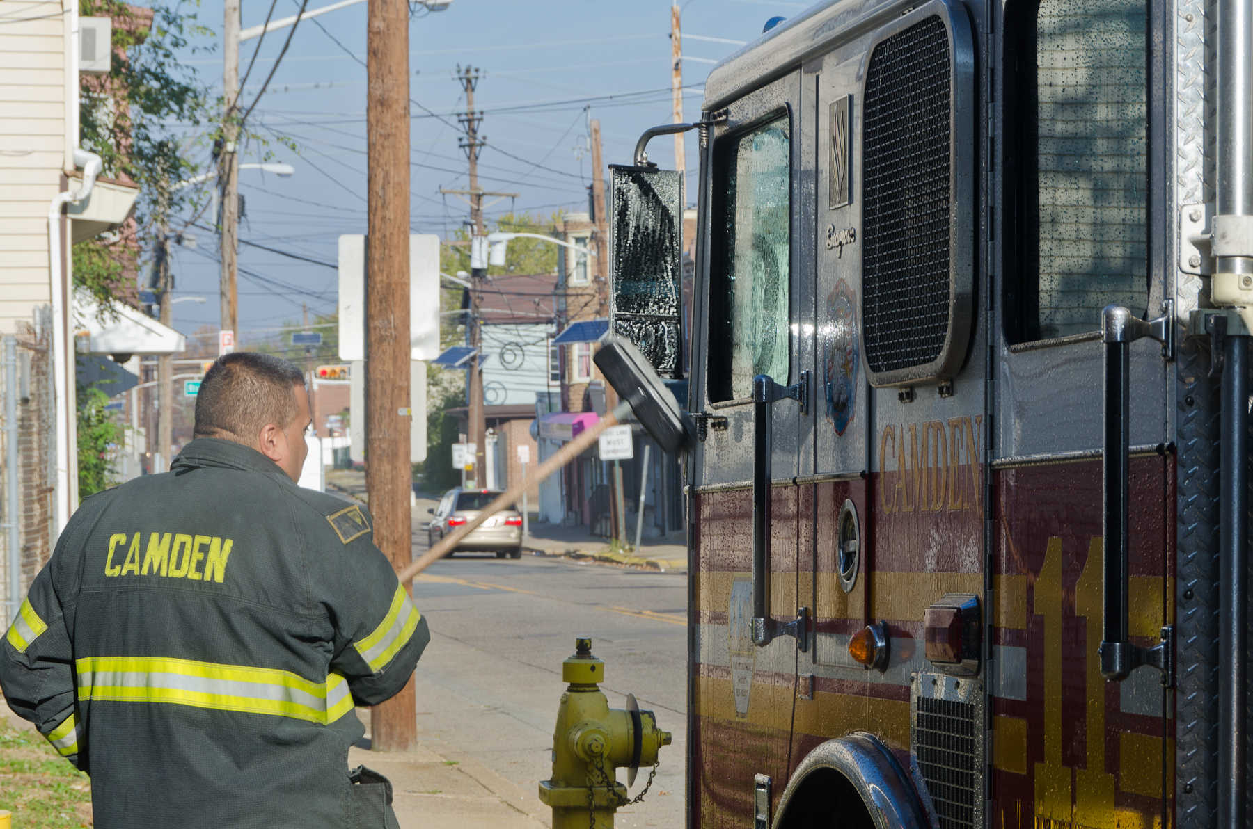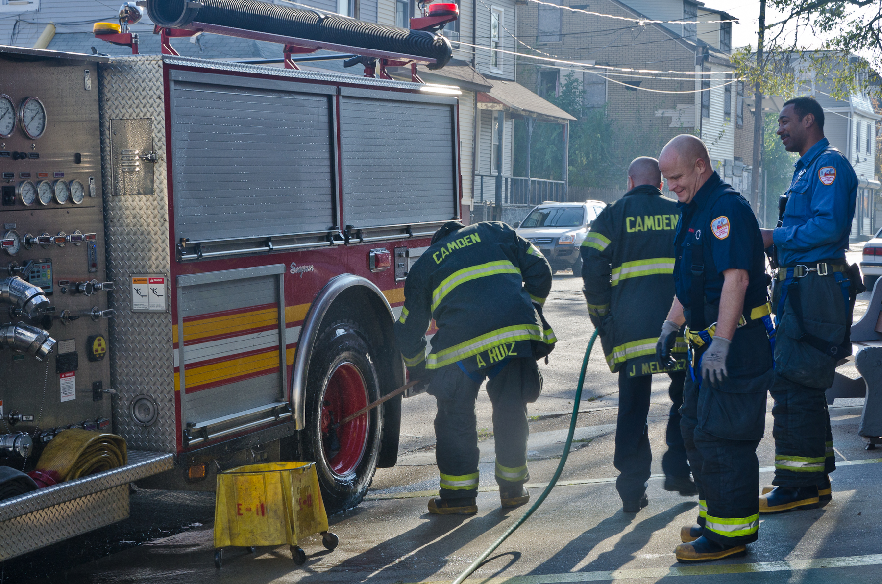 This page and the other pages in this series are the successors to the series of web-page about the Camden Fire Department that began with the page Camden Fire Department: The Fires of the Summer of 2011. On this and other pages in the series you will find pictures and information regarding different events and aspects of the fire service in Camden, New Jersey. I was at the post office on Federal Street when a call came over the radio sending Engine 11 to 26th and River Avenue to attend to a two-car accident. Happily enough, no one was hurt. Engine 11 returned to quarters, I stopped by to hang out for a bit and took some more pictures! As with the web page covering other Camden Fire Department events, if you can identify anyone that I've missed, please comment at the bottom of the page. (I'm terrible at at names and faces). January 14, 2013 |