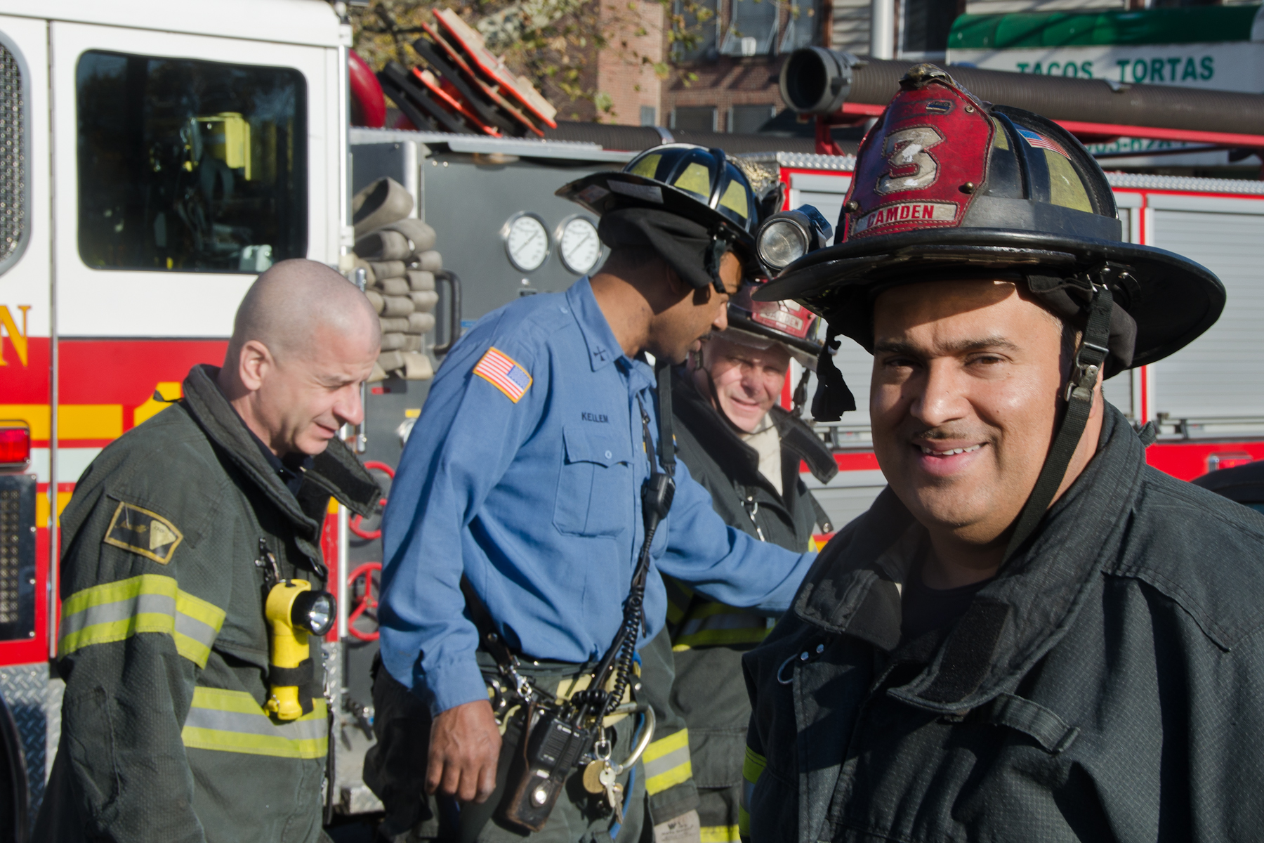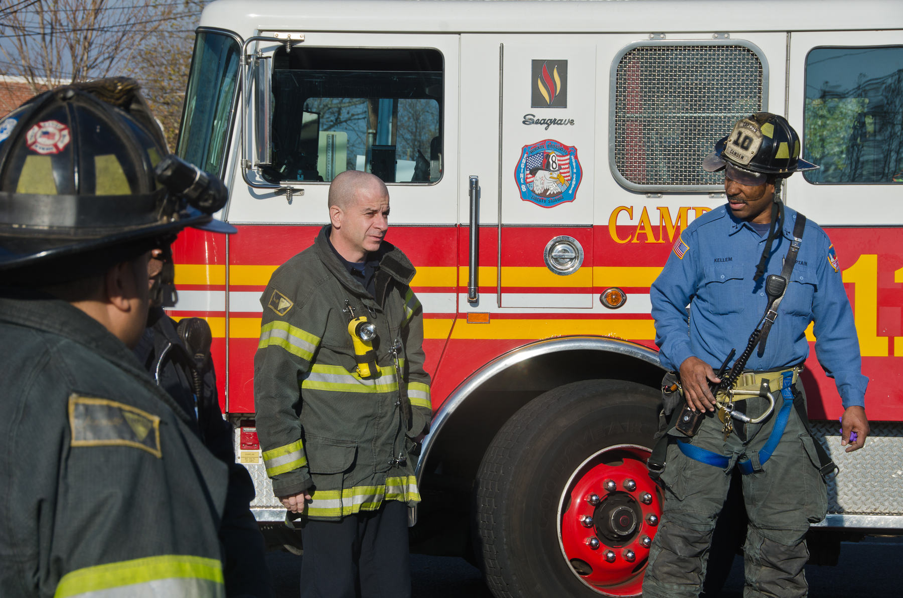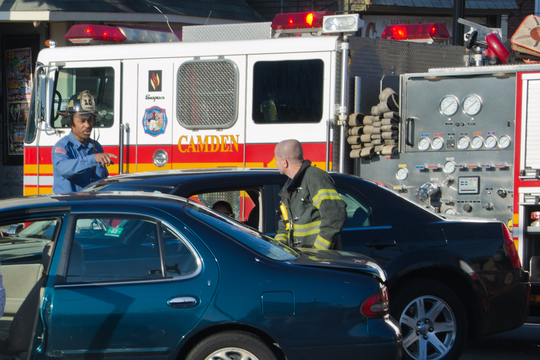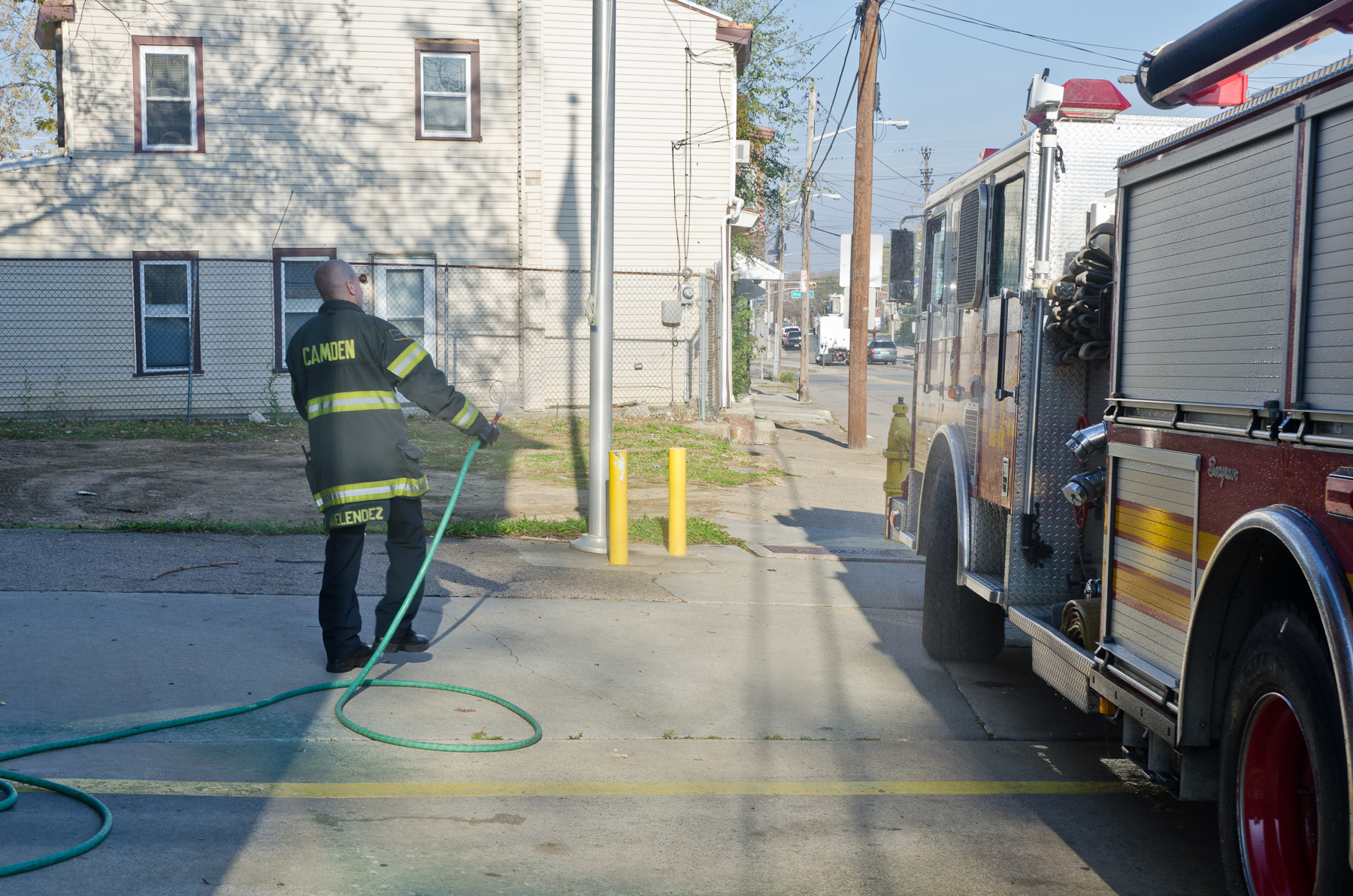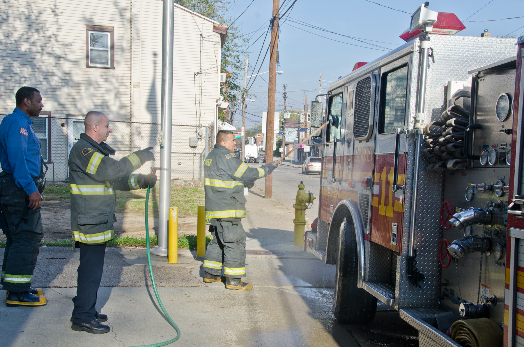 This page and the other pages in this series are the successors to the series of web-page about the Camden Fire Department that began with the page Camden Fire Department: The Fires of the Summer of 2011. On this and other pages in the series you will find pictures and information regarding different events and aspects of the fire service in Camden, New Jersey. I was at the post office on Federal Street when a call came over the radio sending Engine 11 to 26th and River Avenue to attend to a two-car accident. Happily enough, no one was hurt. Engine 11 returned to quarters, I stopped by to hang out for a bit and took some more pictures! As with the web page covering other Camden Fire Department events, if you can identify anyone that I've missed, please comment at the bottom of the page. (I'm terrible at at names and faces). January 14, 2013 |