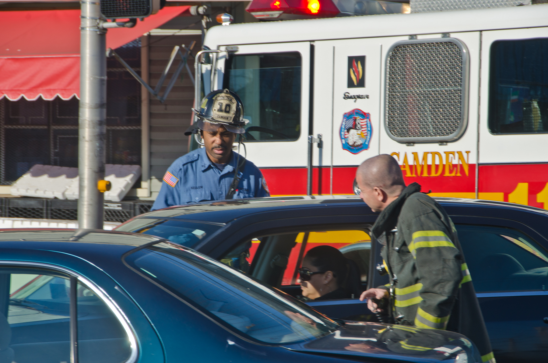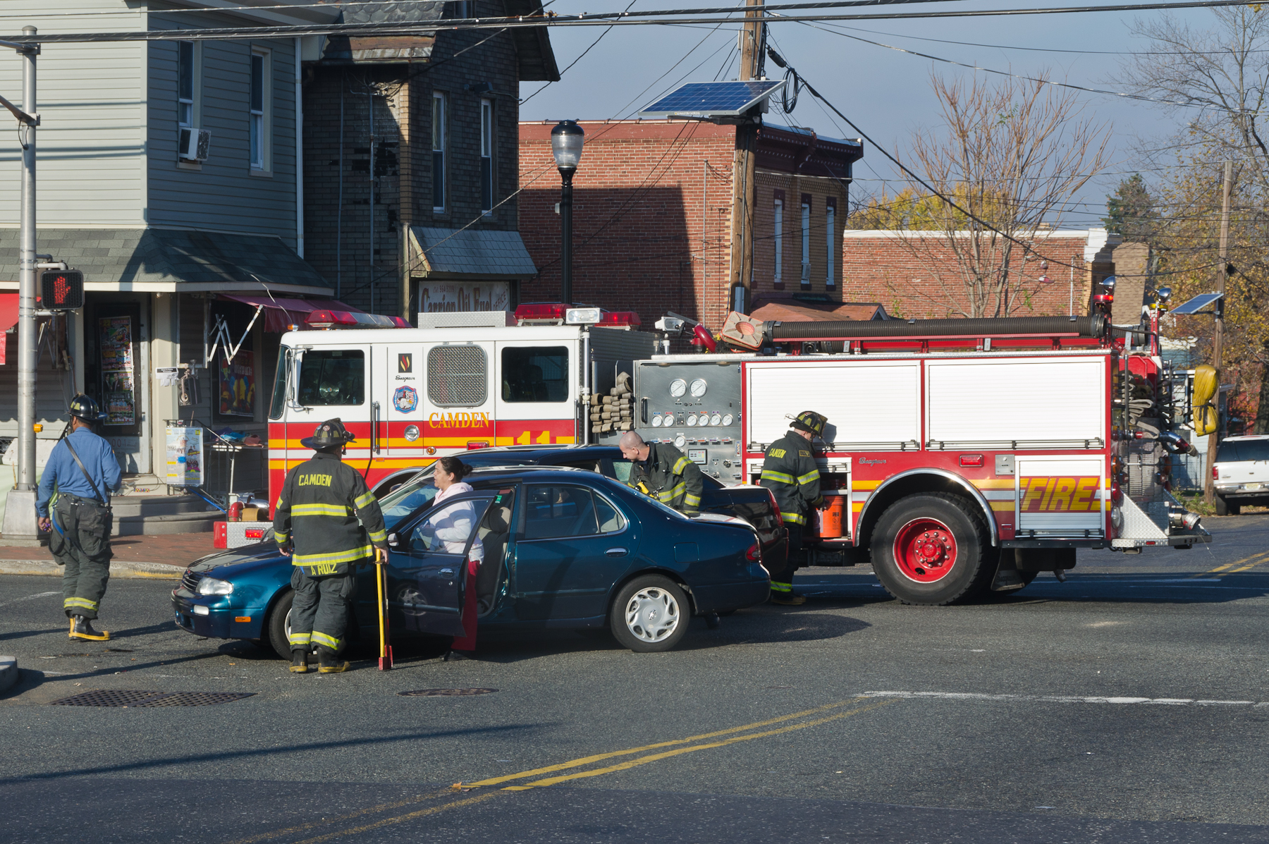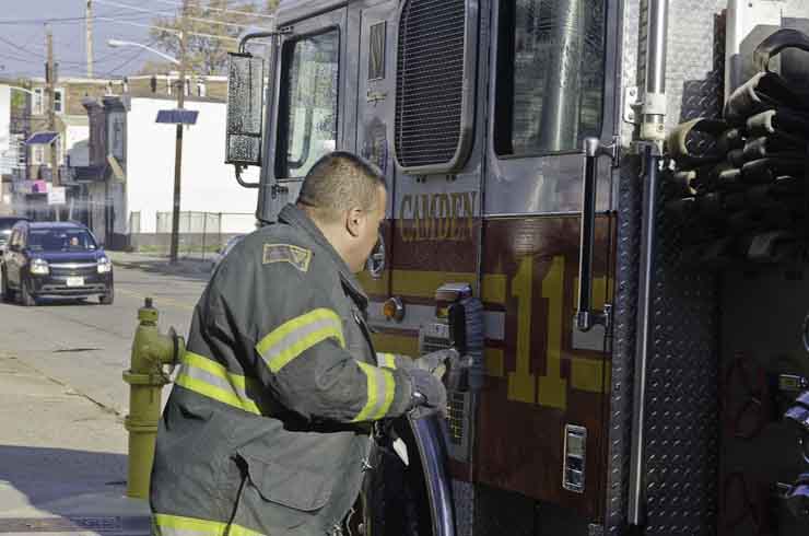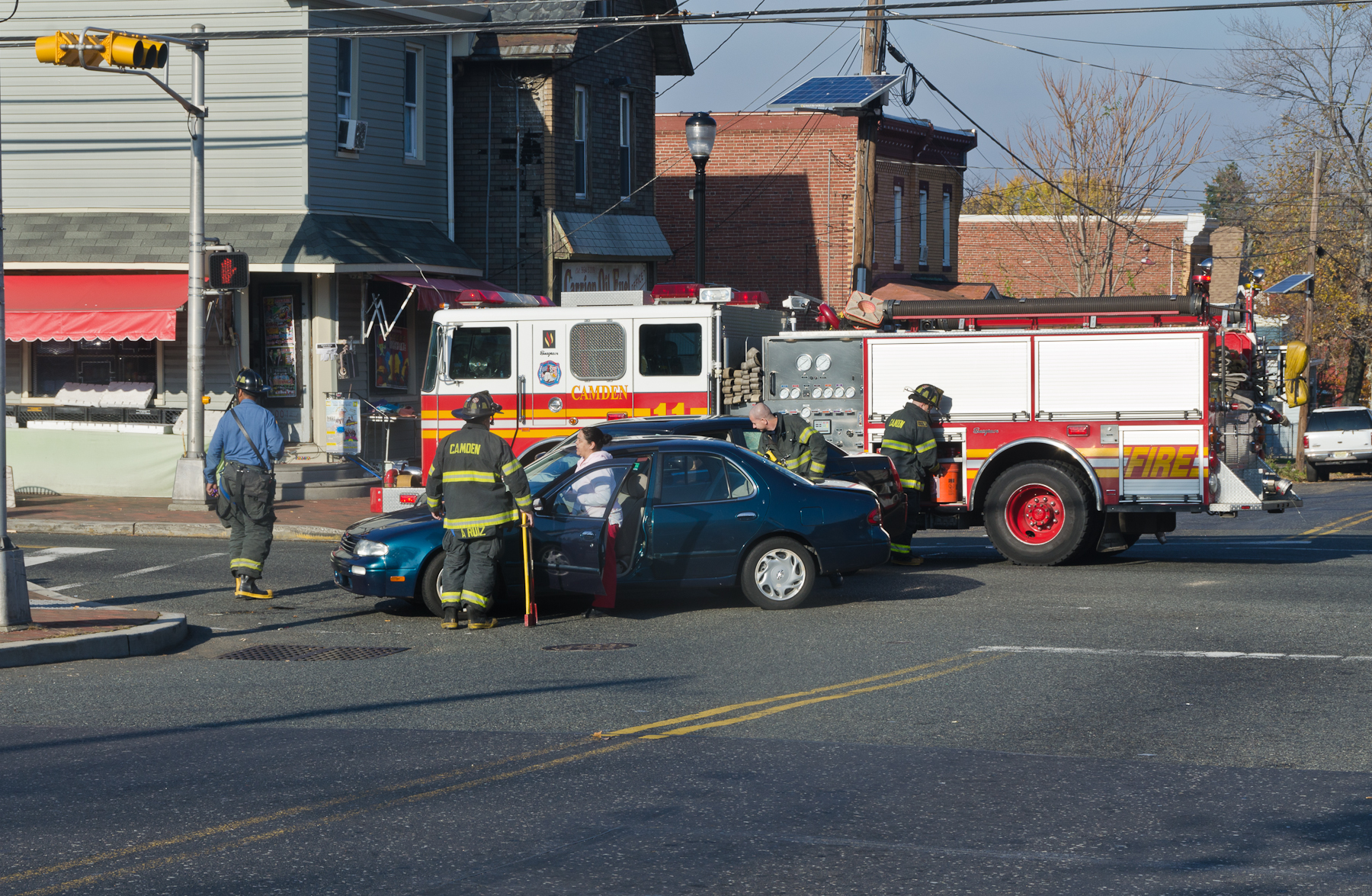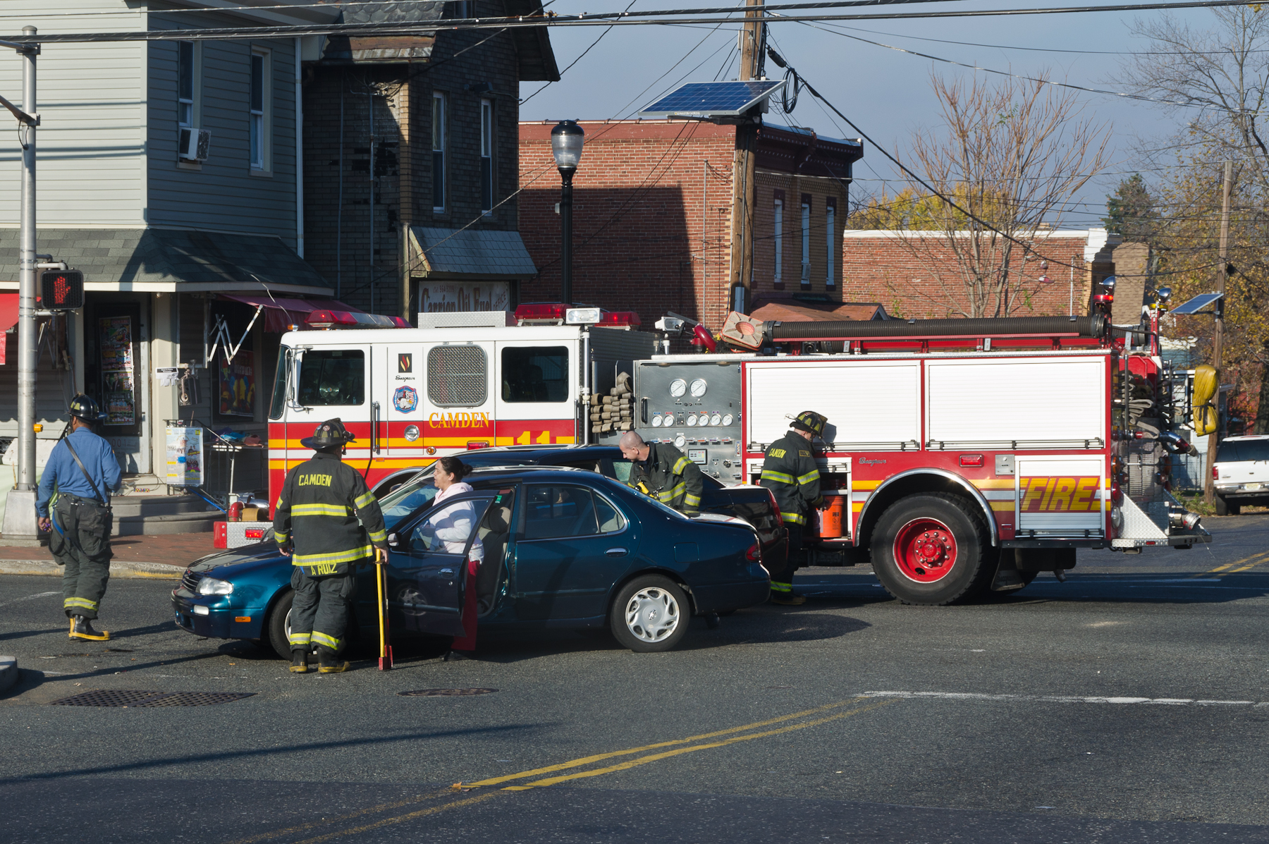 This page and the other pages in this series are the successors to the series of web-page about the Camden Fire Department that began with the page Camden Fire Department: The Fires of the Summer of 2011. On this and other pages in the series you will find pictures and information regarding different events and aspects of the fire service in Camden, New Jersey. I was at the post office on Federal Street when a call came over the radio sending Engine 11 to 26th and River Avenue to attend to a two-car accident. Happily enough, no one was hurt. Engine 11 returned to quarters, I stopped by to hang out for a bit and took some more pictures! As with the web page covering other Camden Fire Department events, if you can identify anyone that I've missed, please comment at the bottom of the page. (I'm terrible at at names and faces). January 14, 2013 |