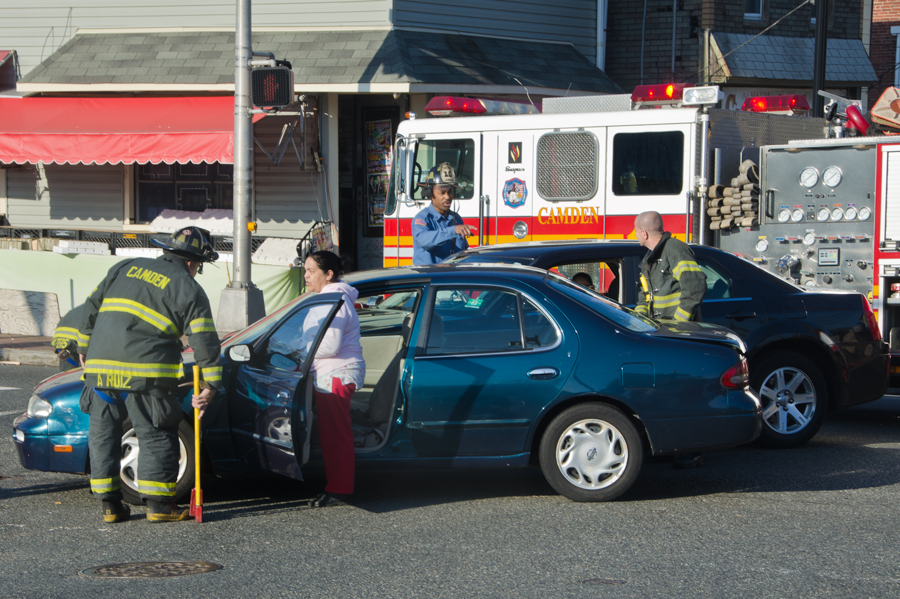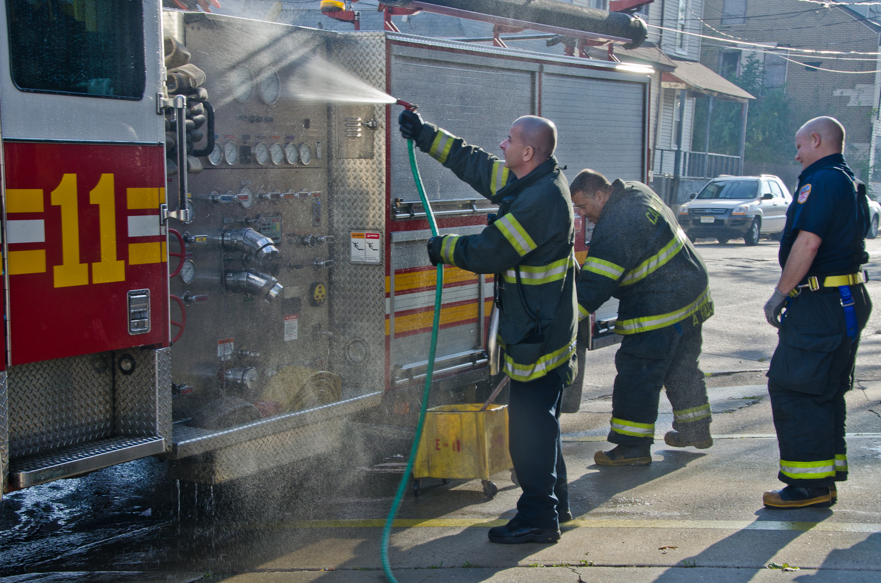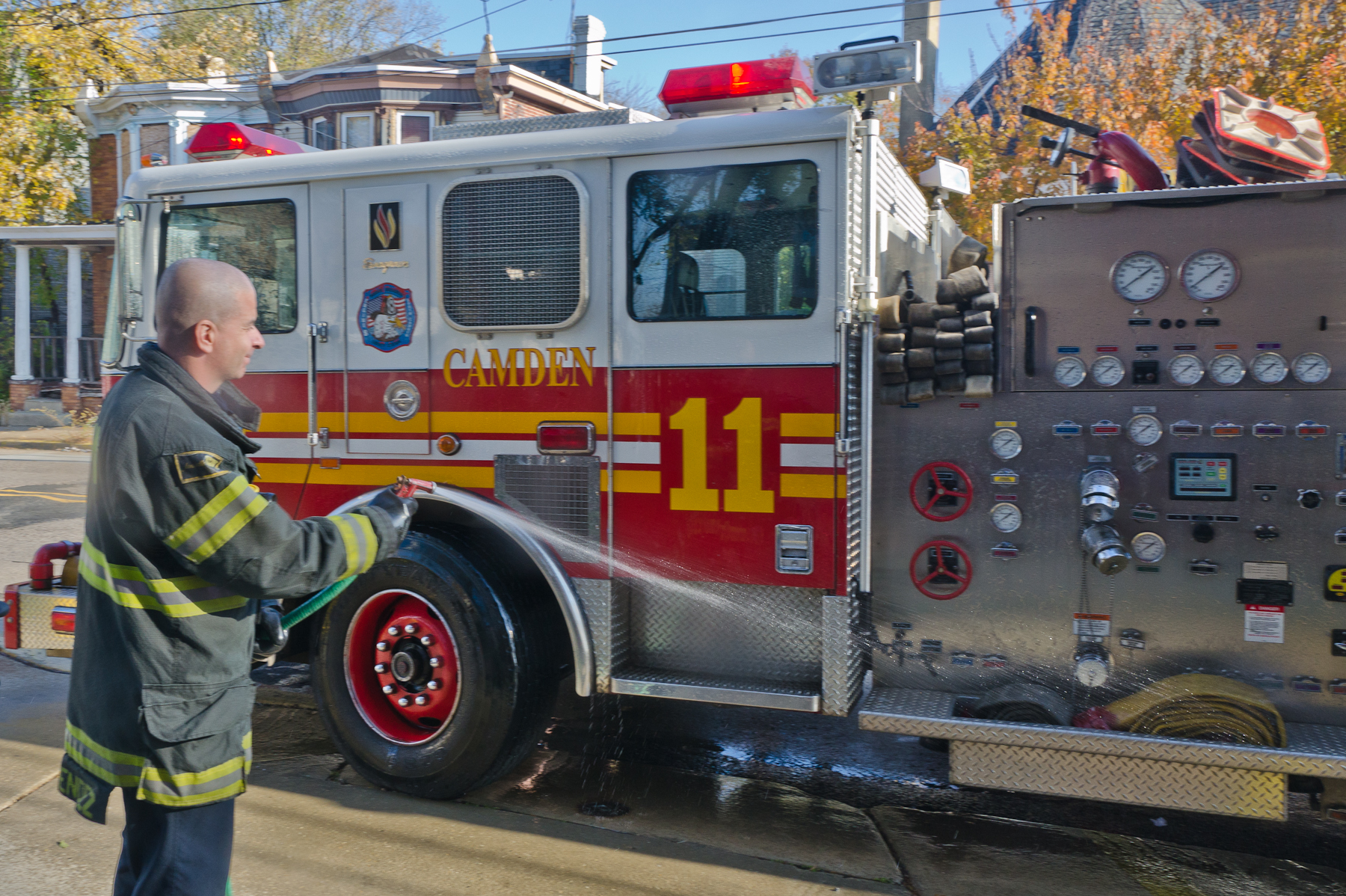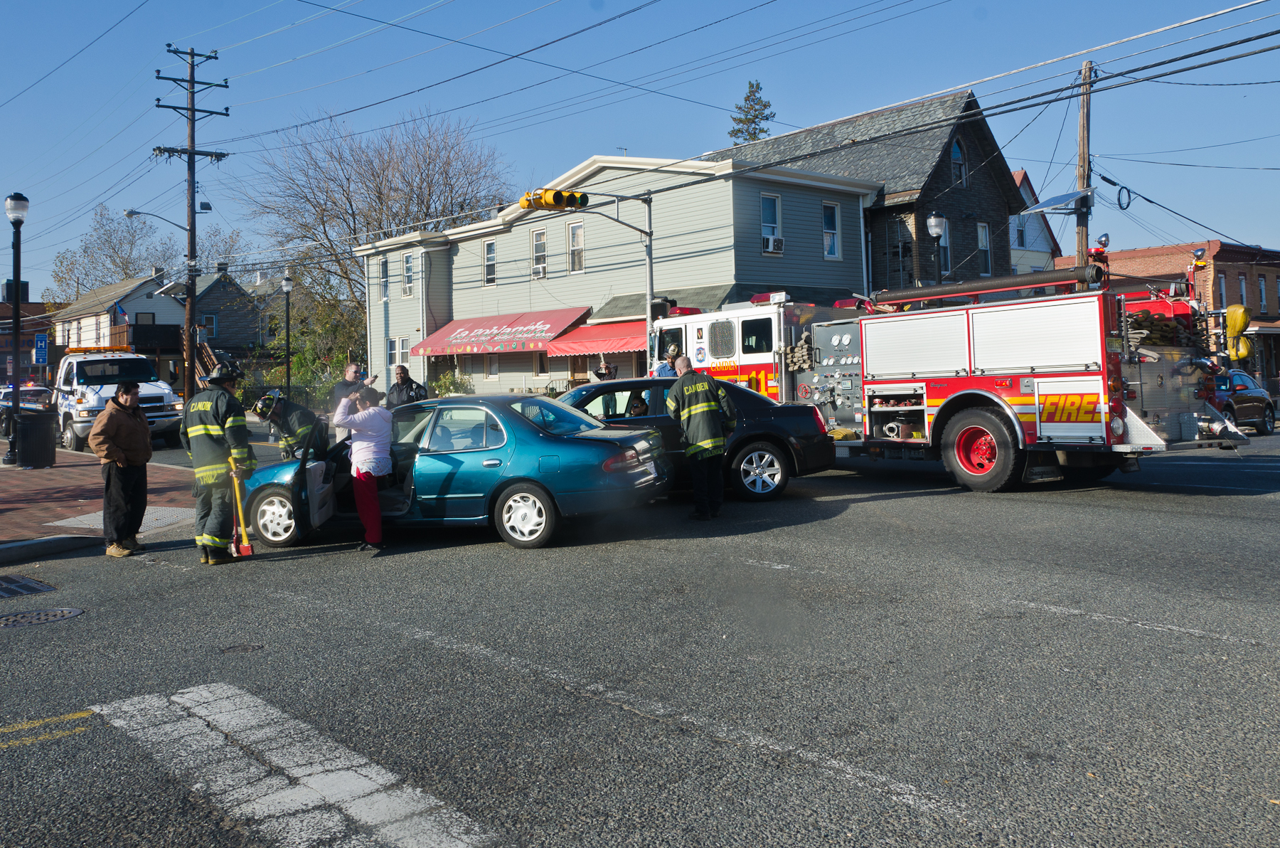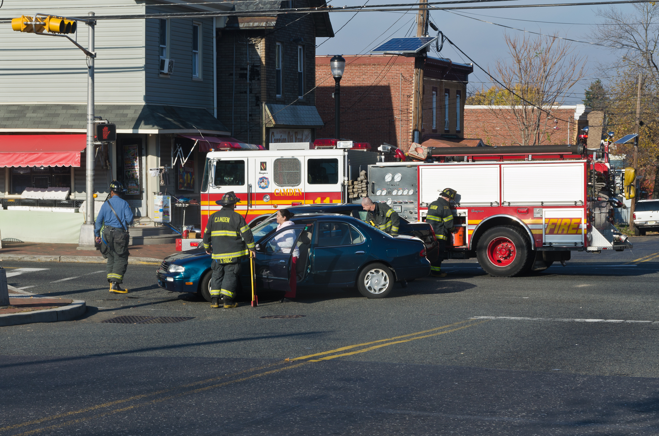 This page and the other pages in this series are the successors to the series of web-page about the Camden Fire Department that began with the page Camden Fire Department: The Fires of the Summer of 2011. On this and other pages in the series you will find pictures and information regarding different events and aspects of the fire service in Camden, New Jersey. I was at the post office on Federal Street when a call came over the radio sending Engine 11 to 26th and River Avenue to attend to a two-car accident. Happily enough, no one was hurt. Engine 11 returned to quarters, I stopped by to hang out for a bit and took some more pictures! As with the web page covering other Camden Fire Department events, if you can identify anyone that I've missed, please comment at the bottom of the page. (I'm terrible at at names and faces). January 14, 2013 |