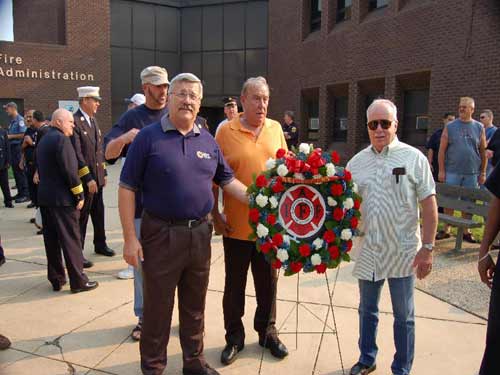 In foreground, retired Camden Fire Department member John E. "Jack" Maher talking to Fire Fighter Larry Smith, son of fallen Fire Fighter Earl Smith. Behind them, Mrs. Pat Bartosz speaking with Deputy Chief Paul Price (holding white hat). |