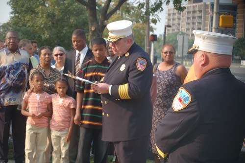 Monsignor Michael Mannion delivering the Invocation. To his left, Chief of Department Joseph Marini, to his right Fire Fighter Rodney Carter, Battalion Chief Darryl Lewison, Deputy Chief Greg Murphy, Deputy Chief Paul Price |