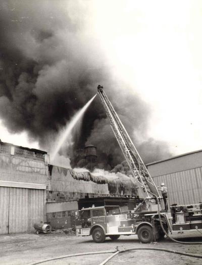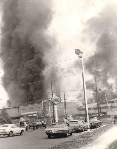 Of twenty Greater Alarms for 1976, two incidents would reach or exceed a third alarm level. On January 31st, a smoky blaze in a four-story factory occurred at Magnolia Avenue and Pine Street, South Camden. This fire in sub-freezing temperatures would keep units busy for several hours as members toiled in extreme cold and under heavy smoke conditions. The second major incident occurred on a beautiful Sunday morning of June 6, 1976 at Mt. Ephraim Avenue and Fairview Street, South Camden. This incident would be one of the largest fires to occur during the decade of the seventies and was equivalent to a tenth alarm assignment before it was brought under control some eight hours later. A picture perfect day, the June sky over South Camden was a cloudless, gaudy blue with bright sunshine and temperatures near 70 degrees. Shortly before 10 A.M. , the dispatcher received a phone alarm reporting smoke in the Harris Terminal complex on Mt. Ephraim Avenue near Burma Road, a nickname given to Fairview Street by local residents. Harris Terminal occupied nearly thirty acres on the site of the former Camden Forge. The complex comprised a series of huge industrial buildings that were converted to warehouse space. Engine Company 10 arriving first due reported a four story brick and corrugated metal building. 100 x 1000 with heavy smoke venting from the roof area near the center of the structure. When Ladder Company 2 forced entry to large overhead doors at the east end of the warehouse, units found a heavy body of fire showing toward the far end of the building. As hoselines were being advanced toward the seat of the blaze, the fire blossomed with frightening intensity and raced across the open expanse of the huge structure.