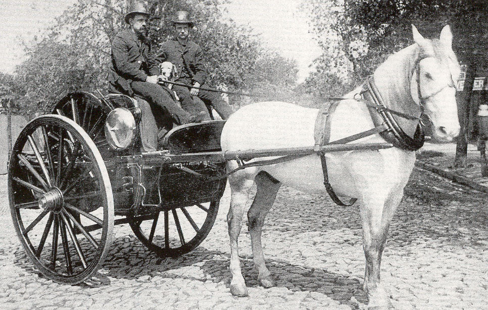 409 Pine Street Engine Company 1 with its two-wheeled Silsby hose cart. |