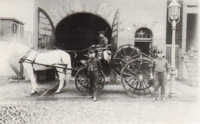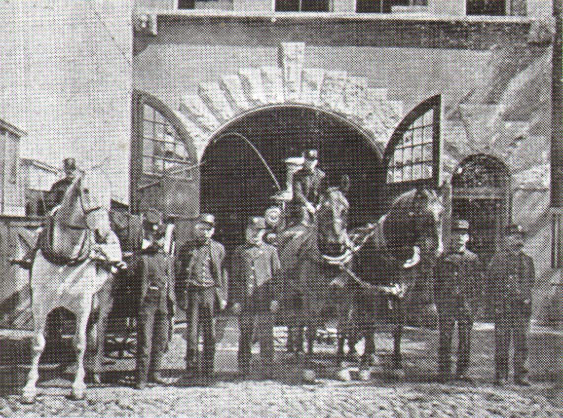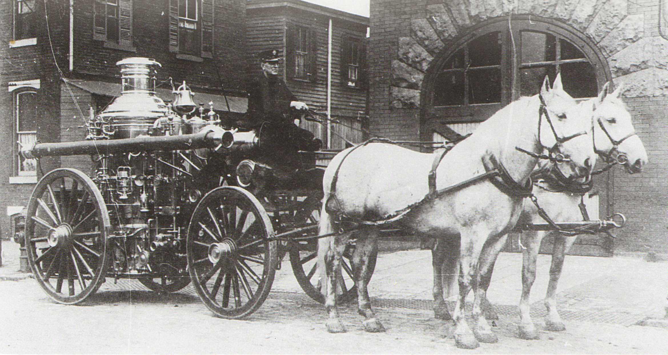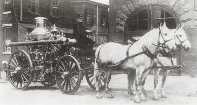 409 Pine Street Engine Company 1 with its second class Amoskeag steamer, which had been rebuilt by the LaFrance Engine Works of Elmira NY; and its two-wheeled Silsby hose cart. |