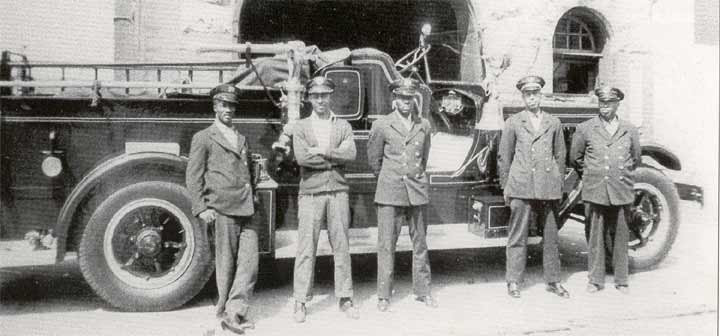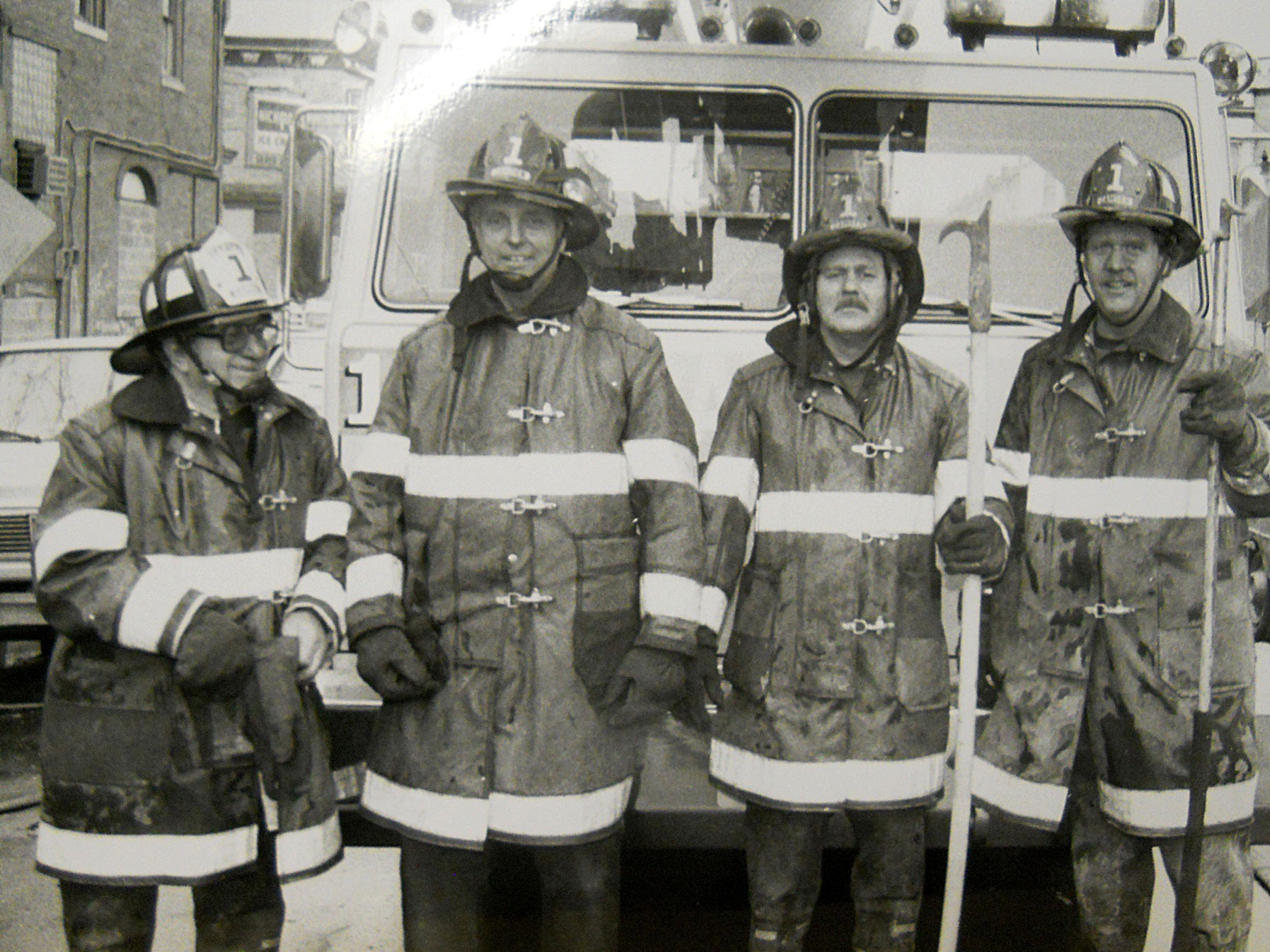 At 2 North 3rd Street Right to left: Captain Paul Matyjasik, Firefighter Ed Olleck, Firefighter David Person, Firefighter Daniel Baker.