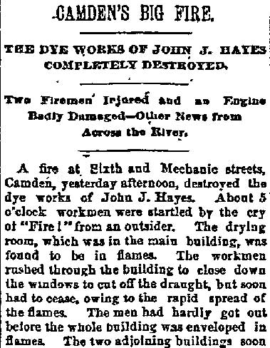 The first major fire that the new paid Camden Fire Department confronted was on December 320, 1869 at the R.M. English & Company oilcloth factory at Cooper's Point. Almost a year later, on Christmas Morning, December 25, 1870 fire destroyed St. John's Episcopal Church at Broadway and Royden street. This had formerly been a floating chapel anchored on the Philadelphia side of the Delaware River. The wooden church burned to the ground in an hour. A second St. John's was built, only to be lost to fire in 1892, and was replaced by the current building. |