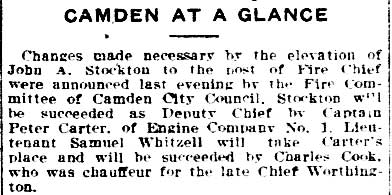 Leadership in the Fire Department at this time was not subject to Civil Service regulations. When the Democrats gained control of City Council in 1876, future mayor Claudius Bradshaw was elected Chief Engineer for the City of Camden, George Horneff, of Engine Company 1 was named as Assistant Engineer, and another Engine 1 member, Thomas McLaughlin, was named as Extra Engineer. Bradshaw and Horneff were both re-elected in 1877. Cornelius Brown was promoted to foreman if Engine Company 1. With Republicans regaining control of the city in 1879, Samuel Buzine of Engine 1 was named foreman of Engine Company 2. Cornelius Brown continued as Engine 1 foreman. Both men remained in these positions until March 27, 1882. George Rudolph Tenner was then named Engine Company 1 foreman. In 1884 Samuel Buzine was named Foreman of Engine Company 1. He was promoted to Assistant Engineer the following year, his place being taken by John Stockton, who later became Chief of the department. |