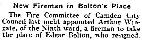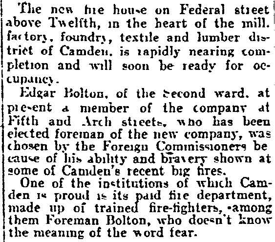 Engine Company 5 was organized and entered service on July 1, 1905 at 1401 Federal Street, from where it could serve the upper reaches of Center City, North Camden, and lend assistance to east camden and Cramer Hill. Edgar Boulton was selected in May of 1905 to be the new company's first Captain. Charles Worthington, who would rise to the rank of Chief of Department was also assigned there. The Company was displaced from its headquarter in 1926 when the firehouse apron at grade (street) level was obstructed by the newly-built Fourteenth Street Viaduct, which crosses the Admiral Wilson Boulevard adjacent to the railroad line. Engine Company 5 at that point was relocated to the 27th Street and Federal Street headquarters of Engine Company 9 in East Camden. The unit was disbanded on January 1, 1933 for budgetary reasons, as the city like so many other New Jersey municipalities was in was in dire financial straits brought on by the Depression. The former firehouse at 14th and Federal Street was used by the City of Camden until 1986, when it was torn down. |