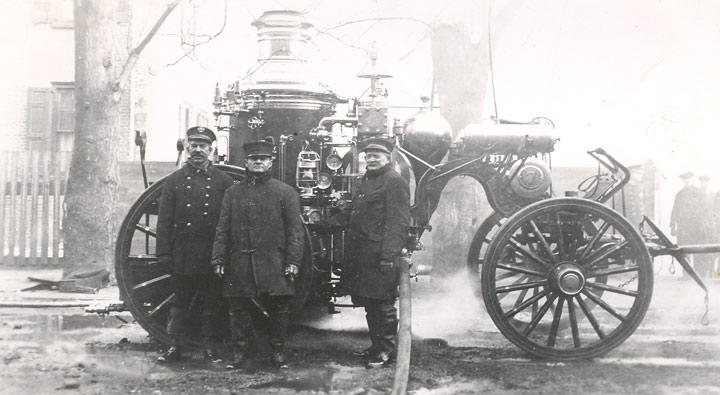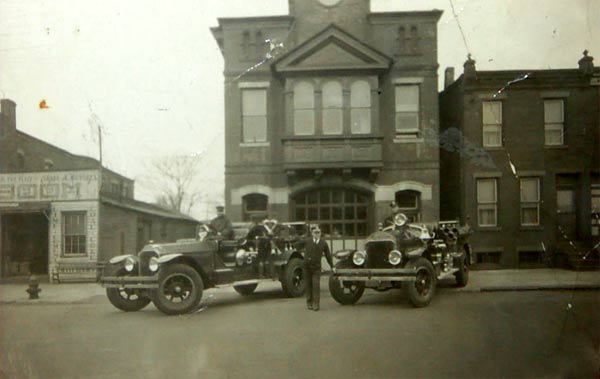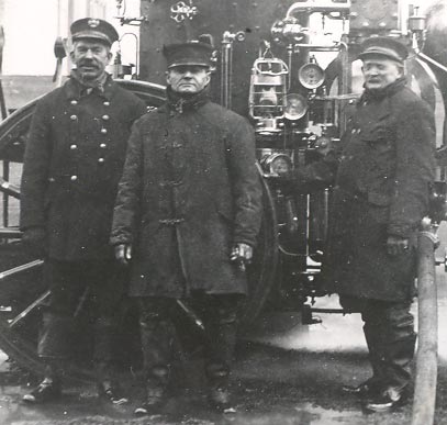 Pictured with 1910 American LaFrance combination hose and chemical wagon are George C. Boone, driver; and William Buzine, engineer. Driver Edward Simpson is atop 1902 Metropolitan second class steamer, Stoker James Navin standing in front of the engine. |